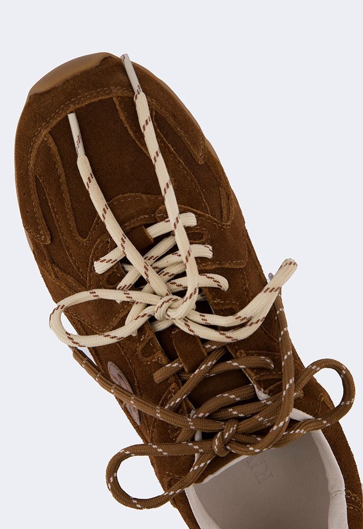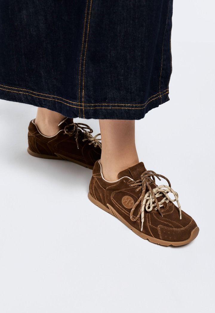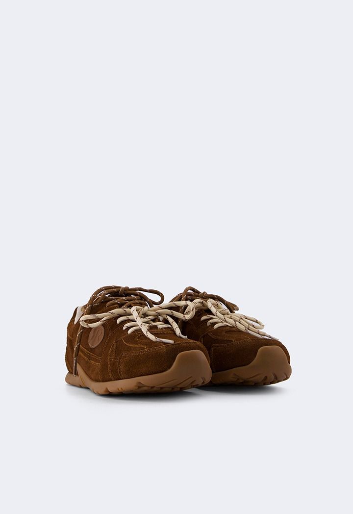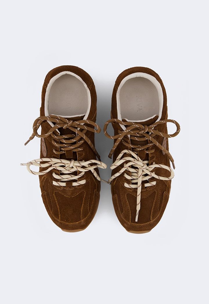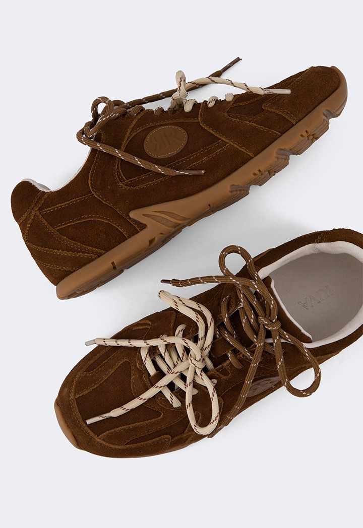 A pair of suede sneakers with tie laces, a comfortable and stylish pair for everyday wear.