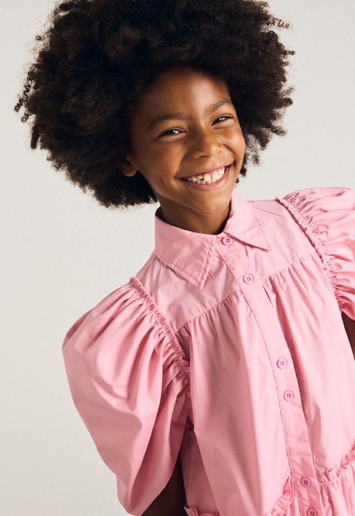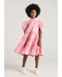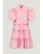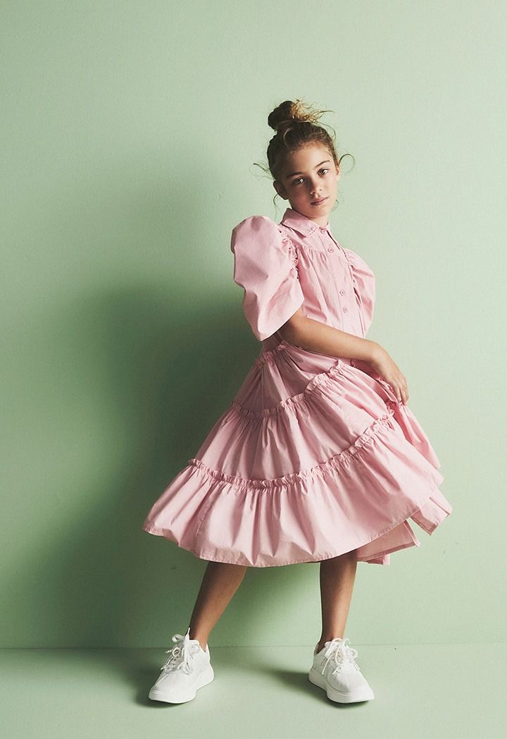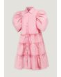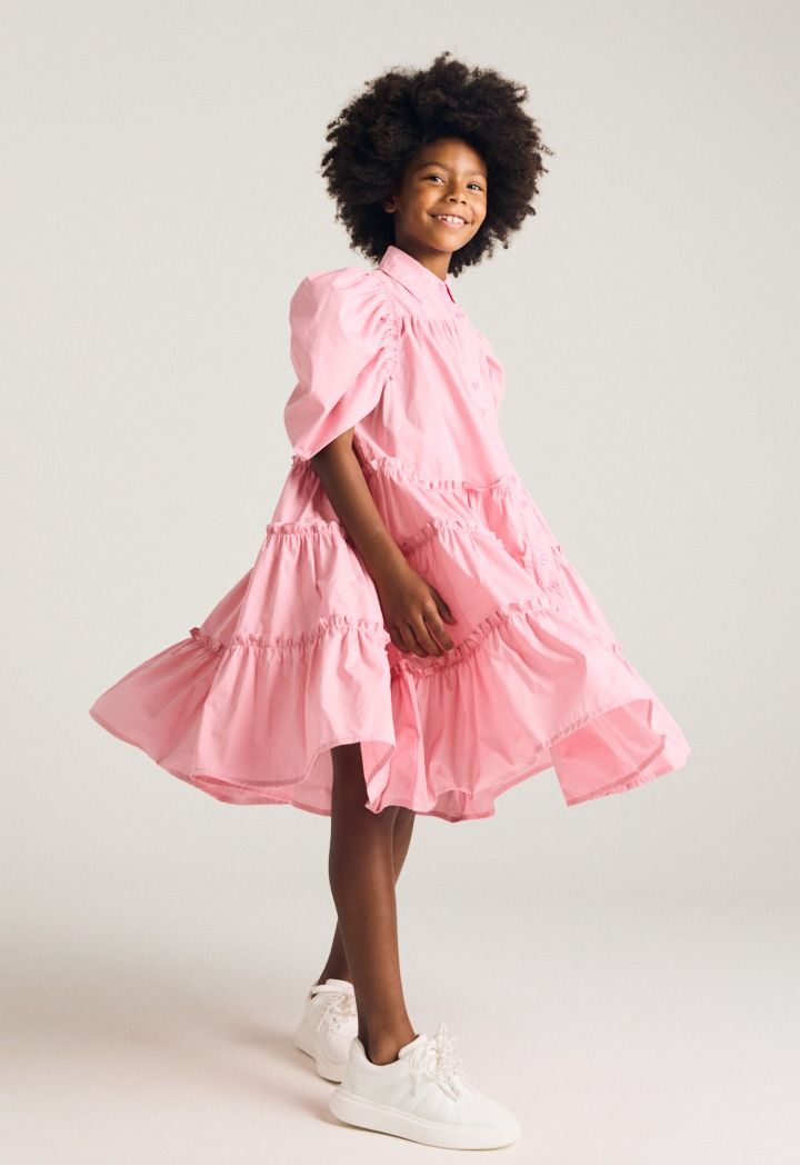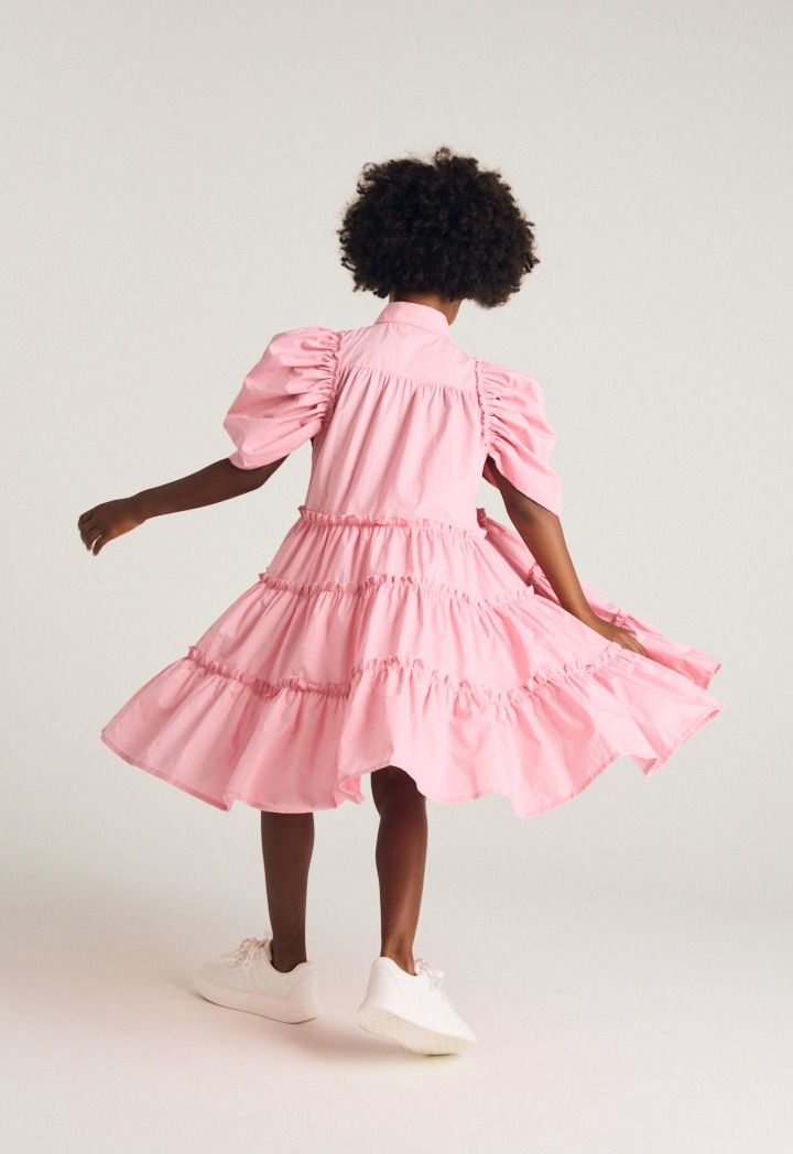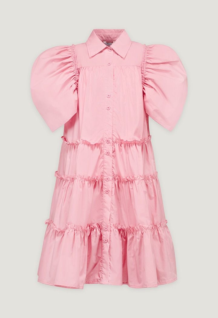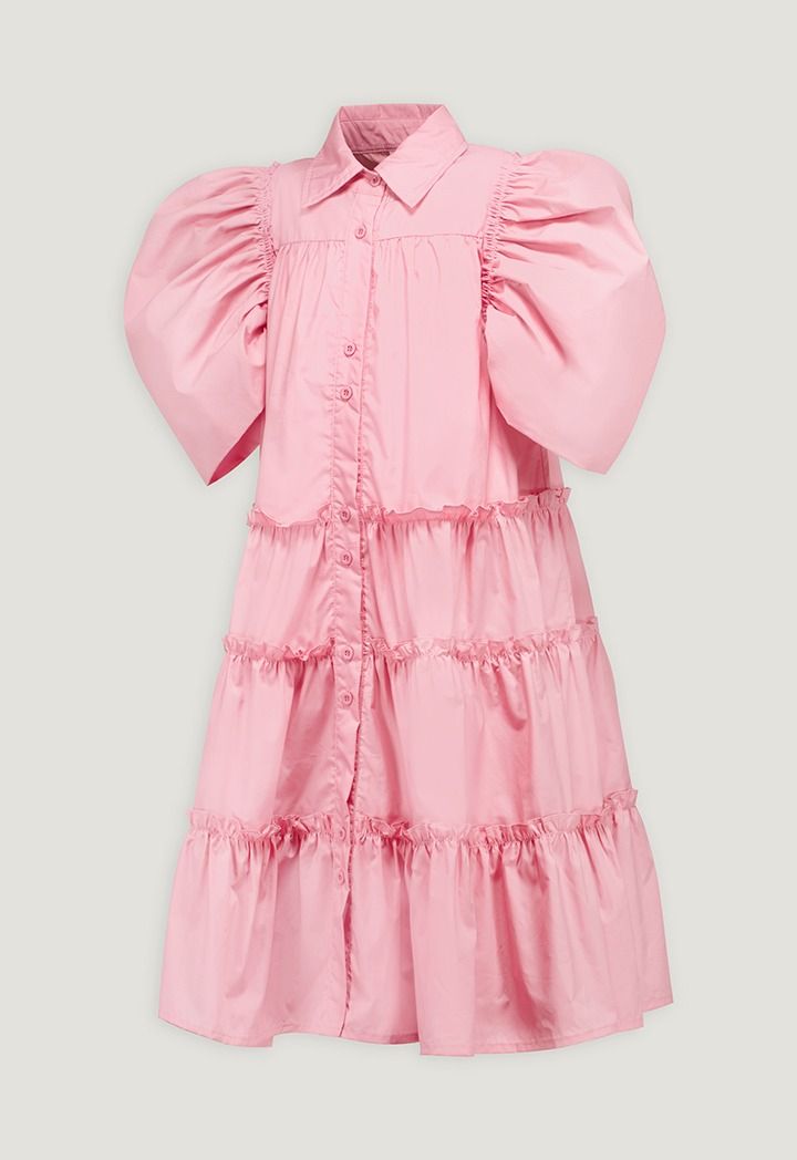 A solid dress that features a tiered design and puff short sleeves.