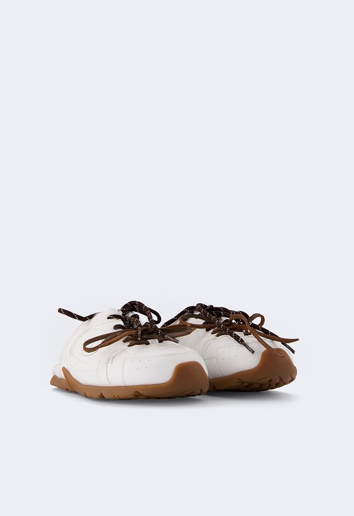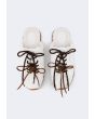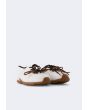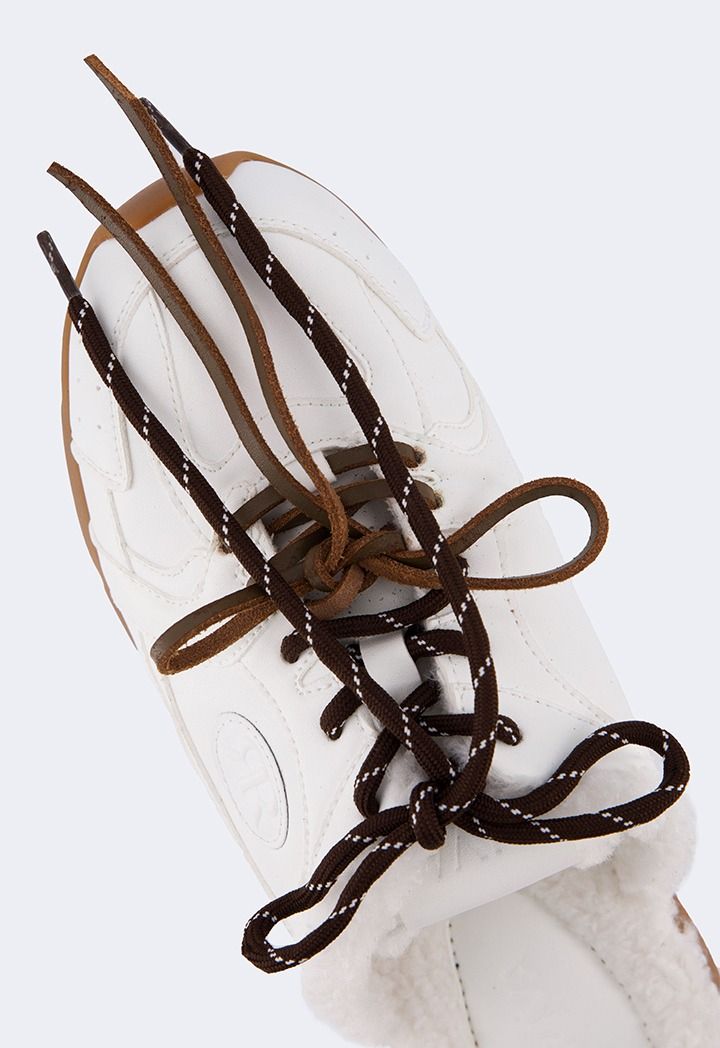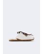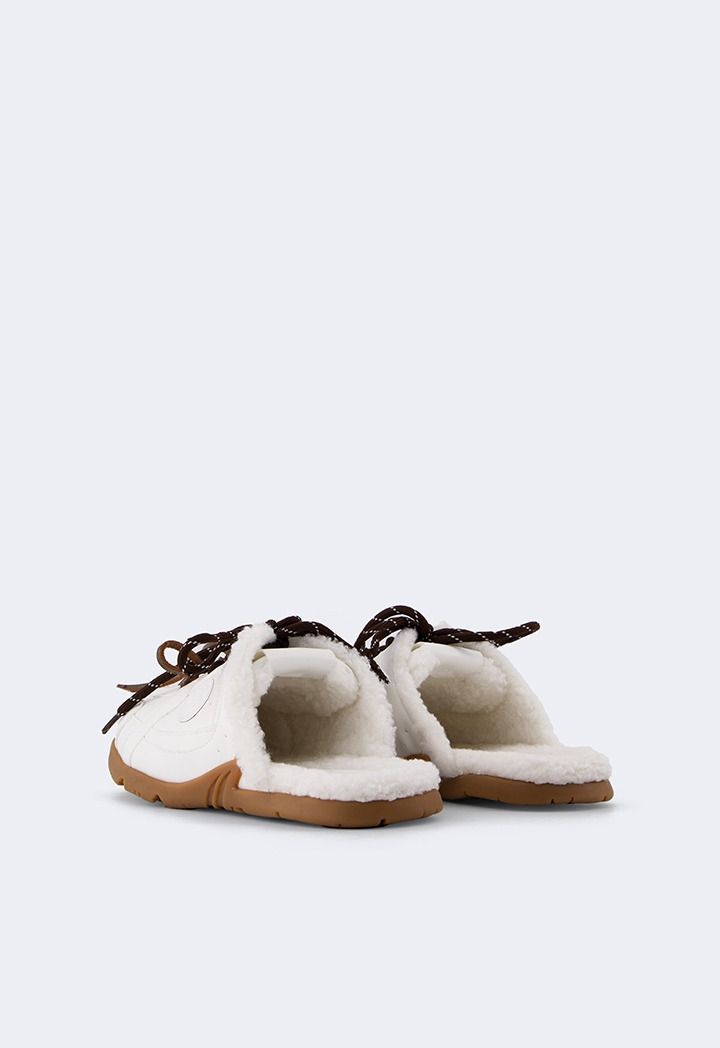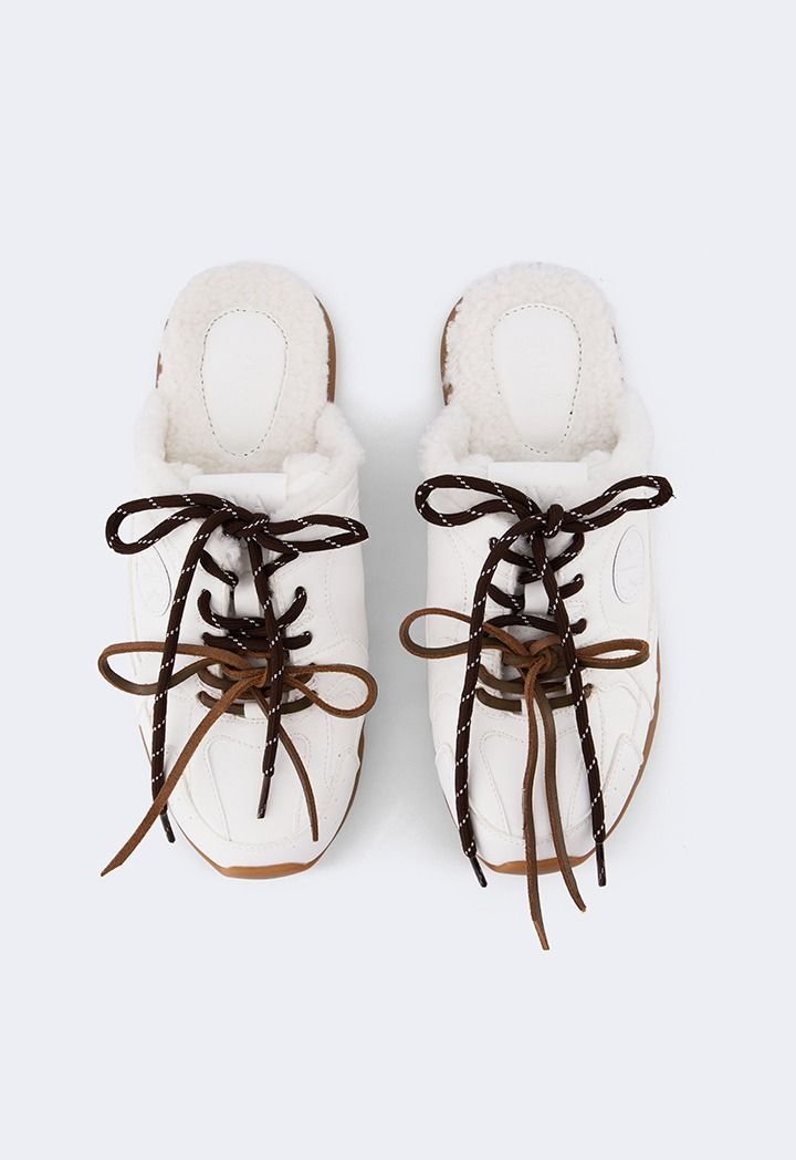 A cozy-chic pair of PU leather mules with inner shearling details and a tie laces, perfect for stylish comfort.