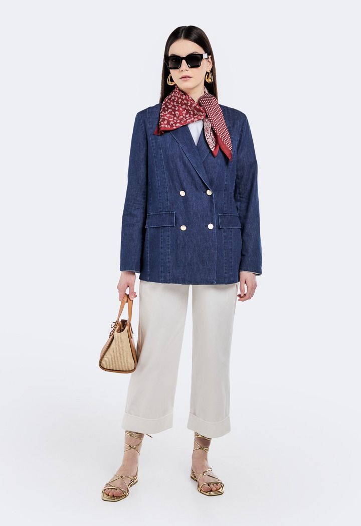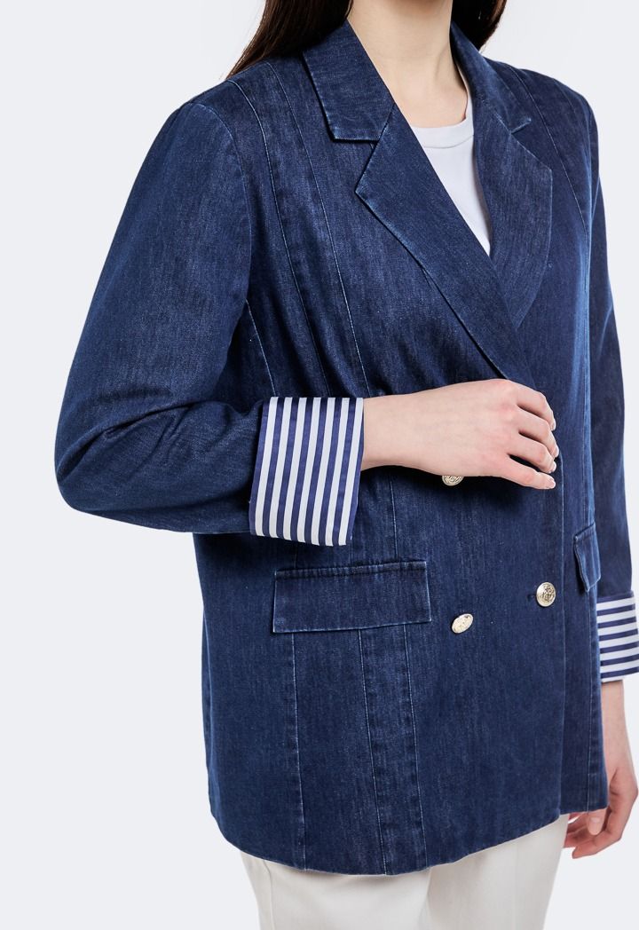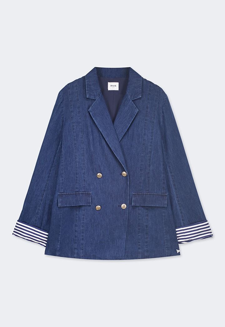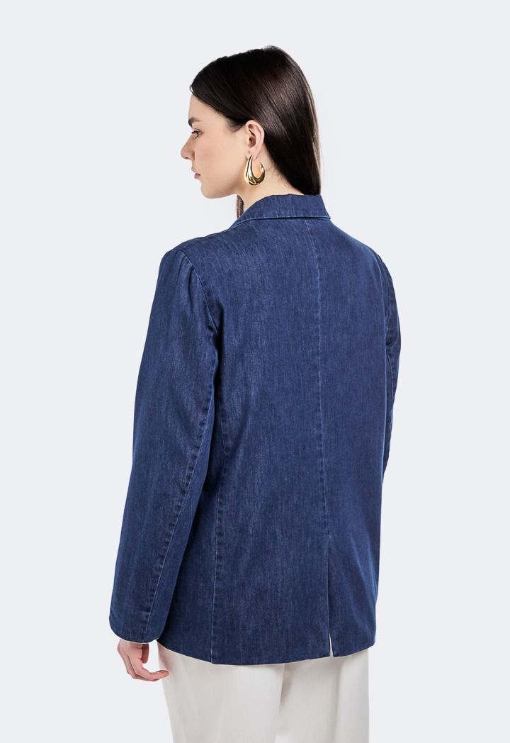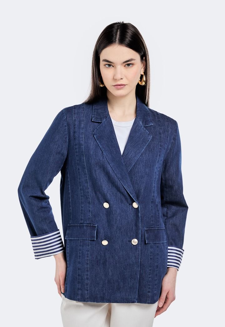 Design: Solid, Attached Lining, Faux Pockets, Denim, Double Breasted