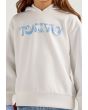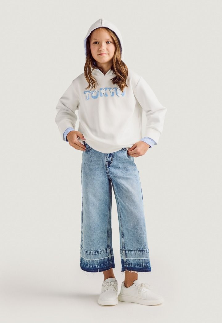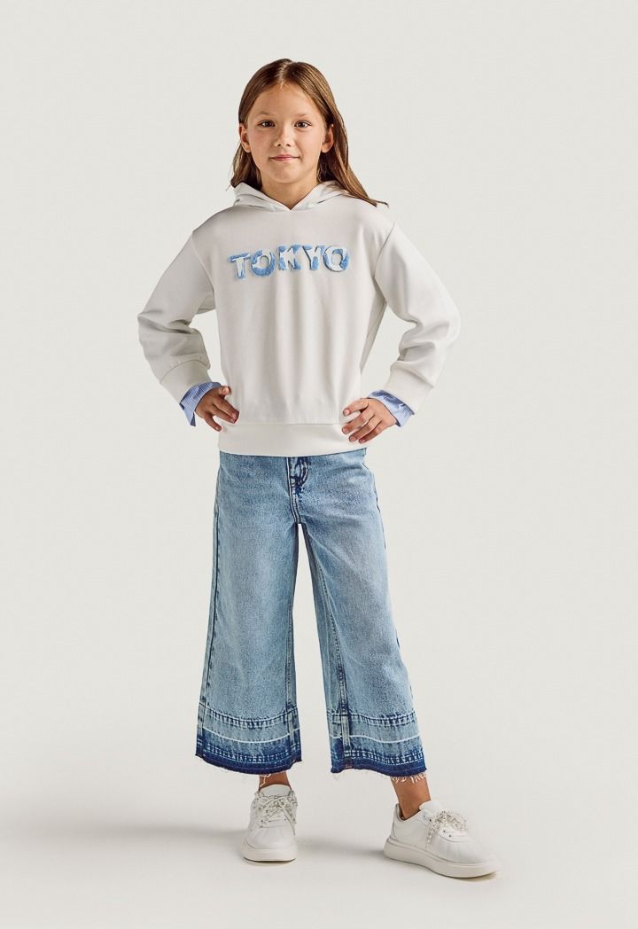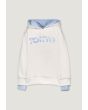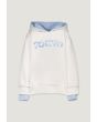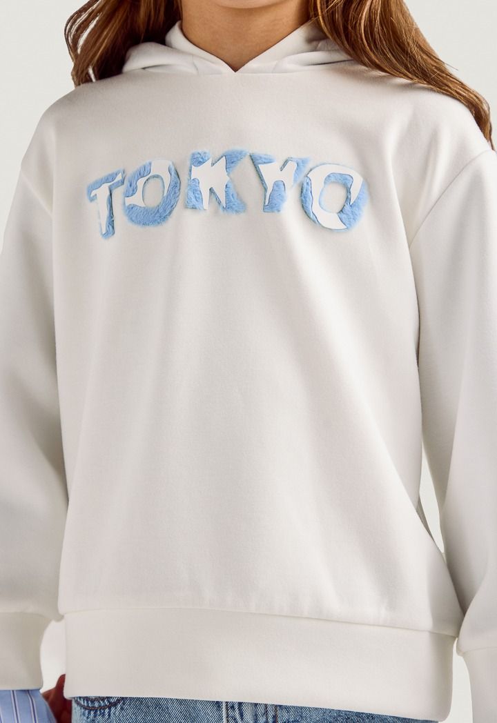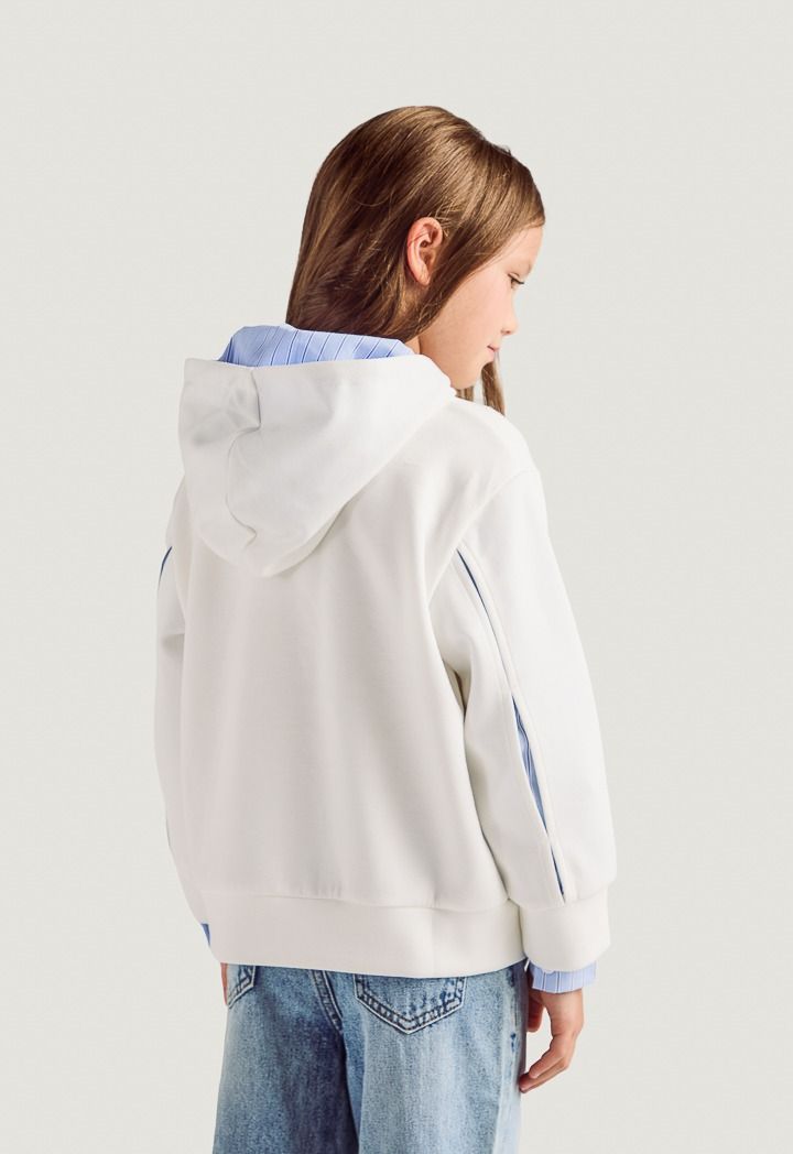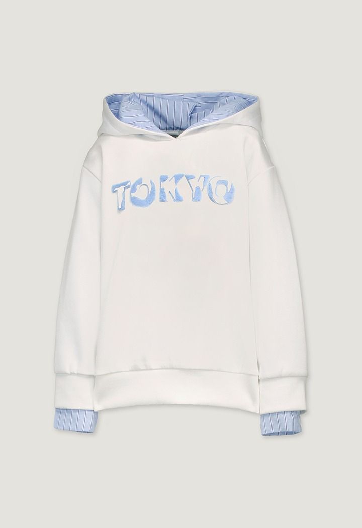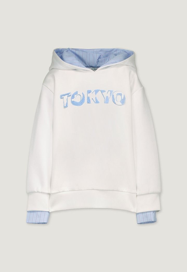 A knitted hoodie that features a faux fur embossed design with striped details.
