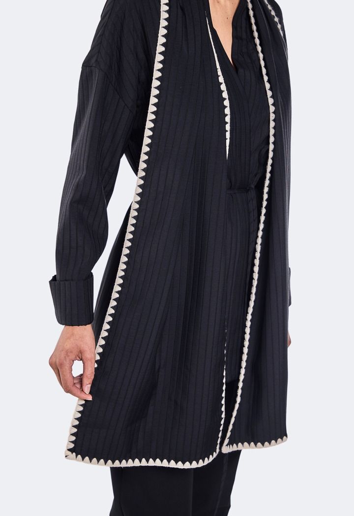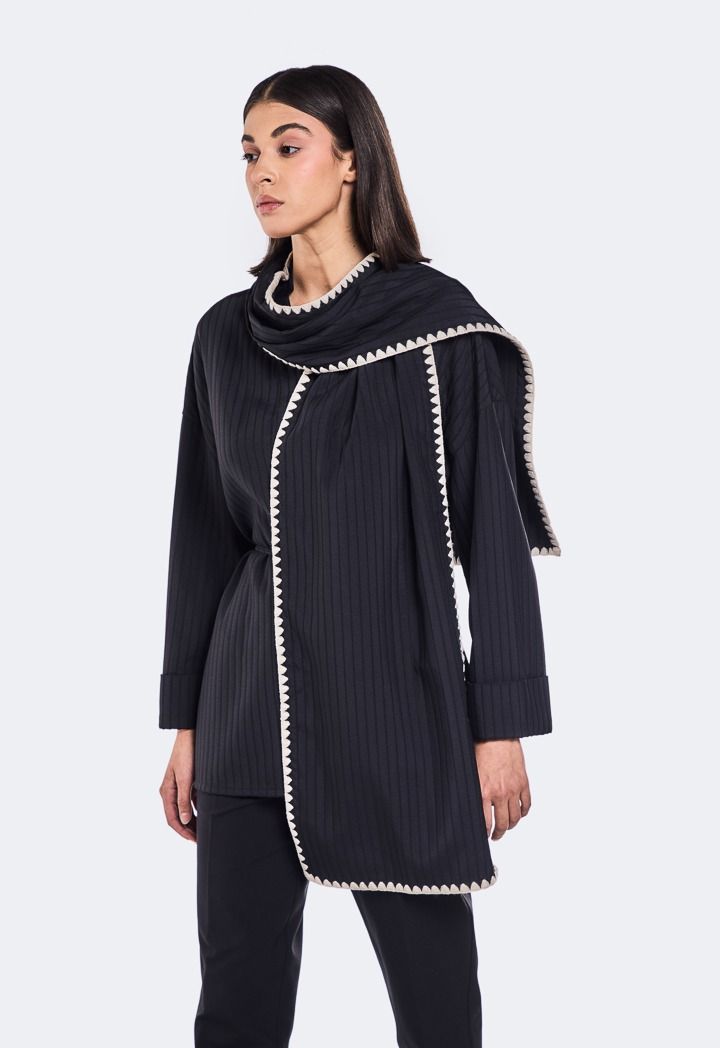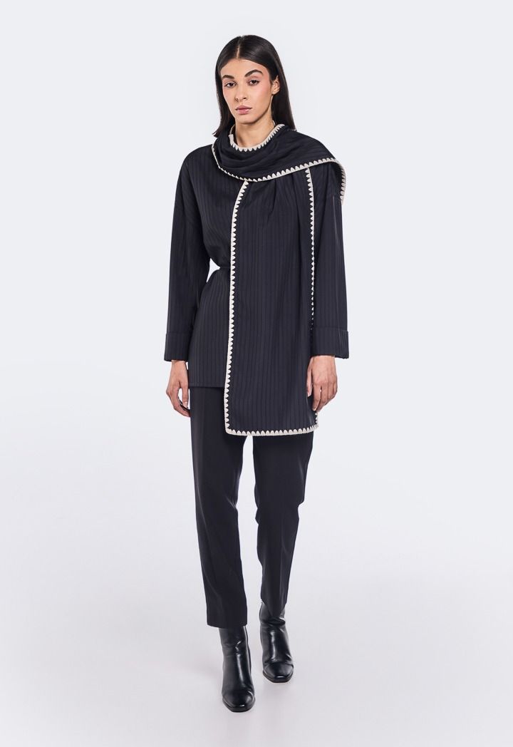 Design: Solid, Striped, Belted, Detachable Scarf With Embroidered Trim