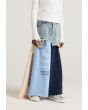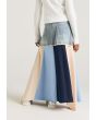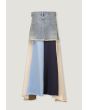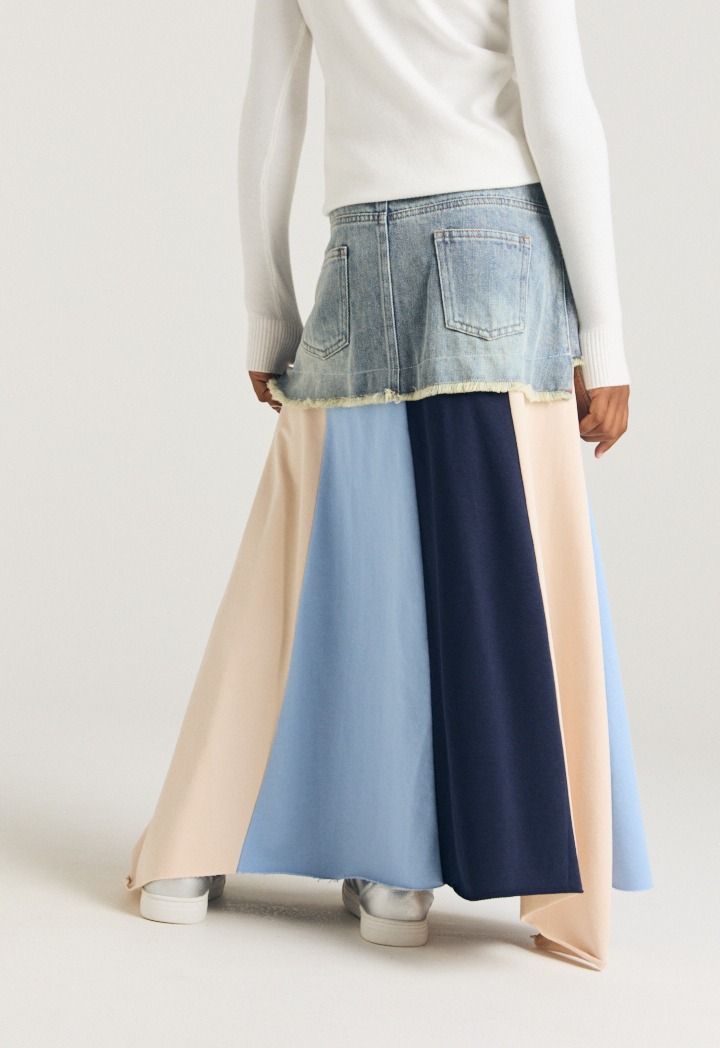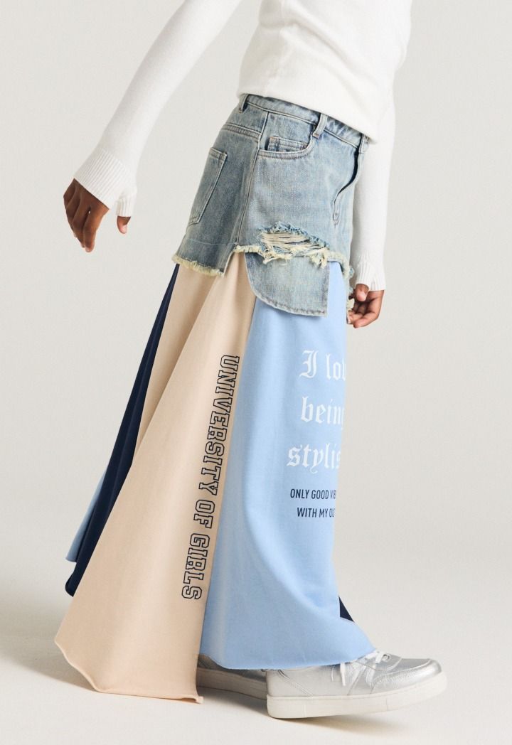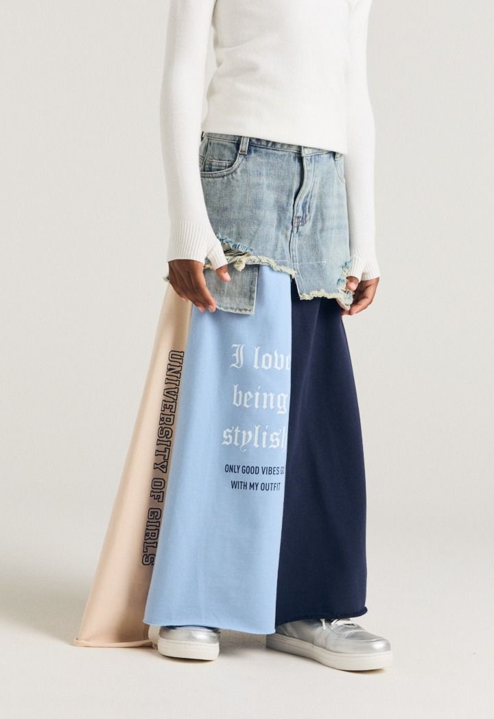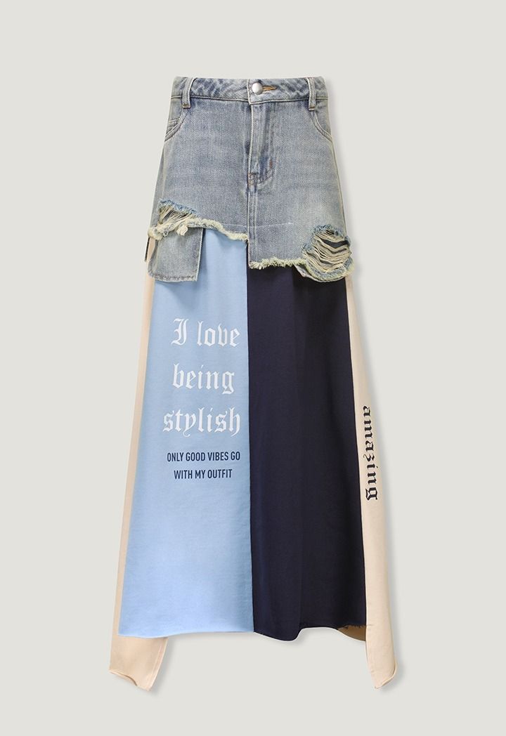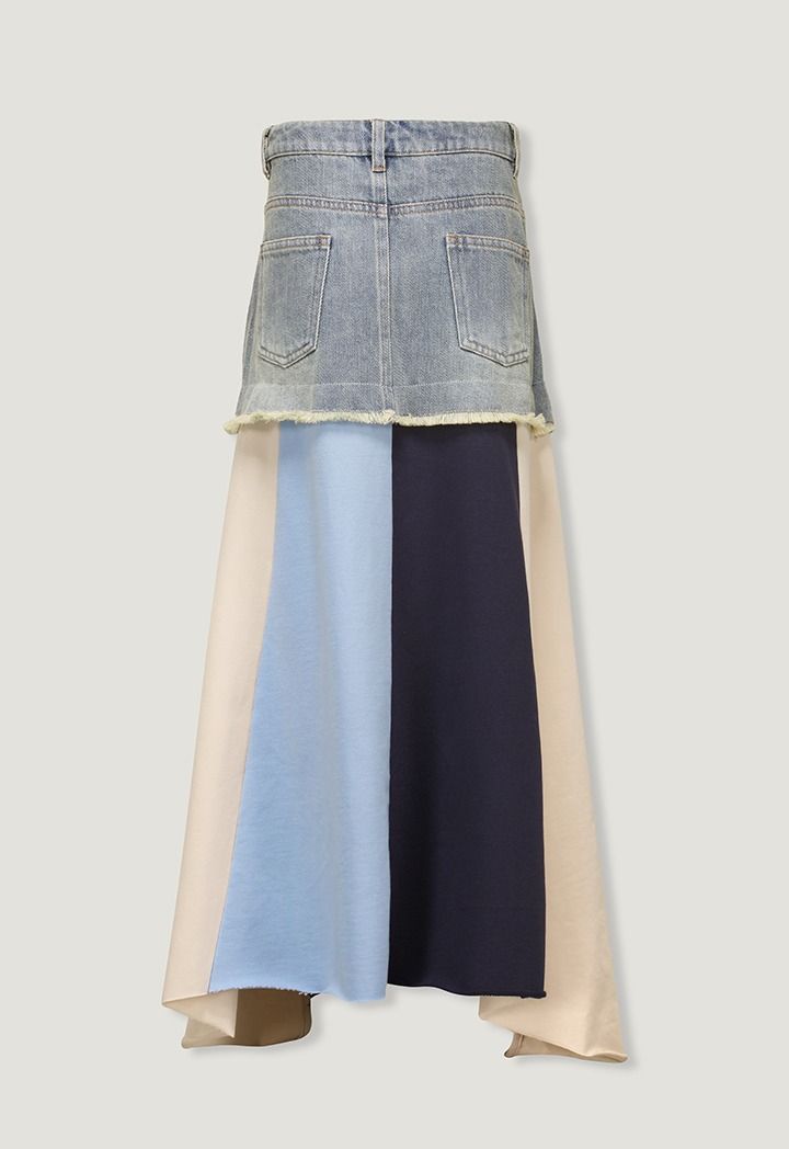 A unique denim skirt that features multicolored hem with various prints.