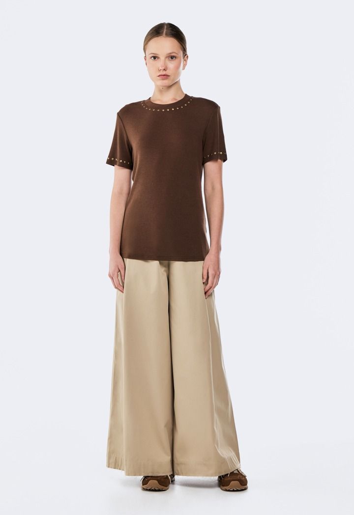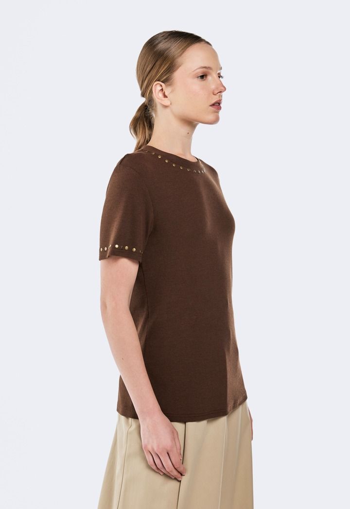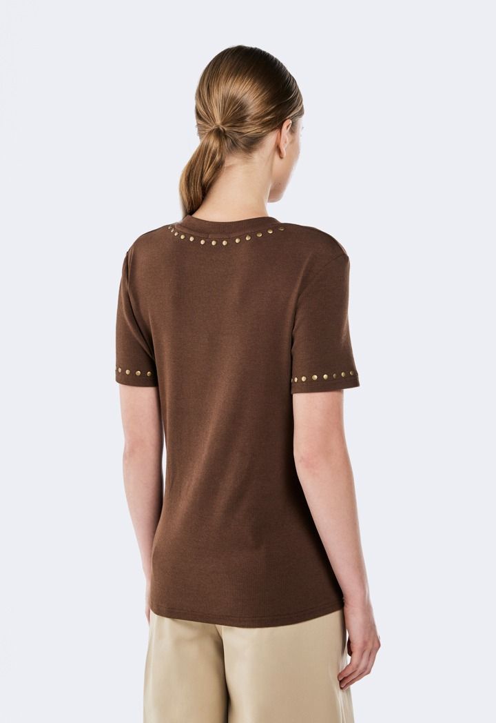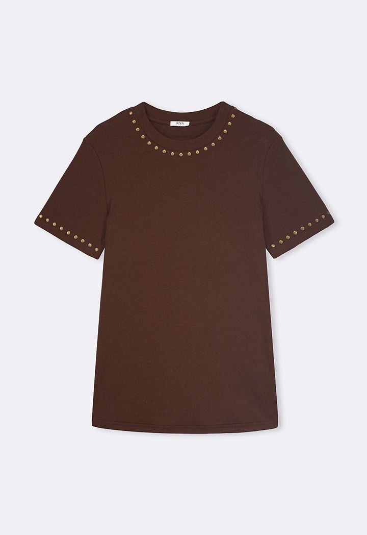 Add a bold edge to your look with this stud-embellished ribbed T-shirt, combining textured fabric and striking details for a modern statement.