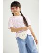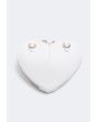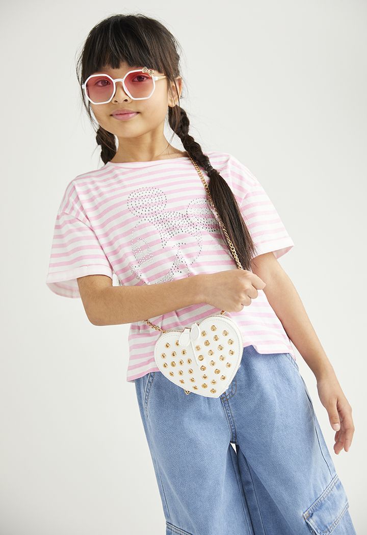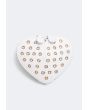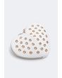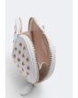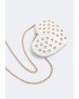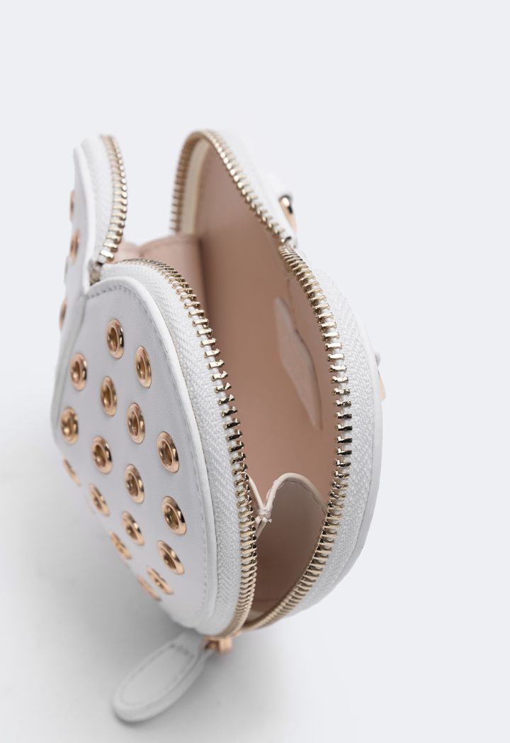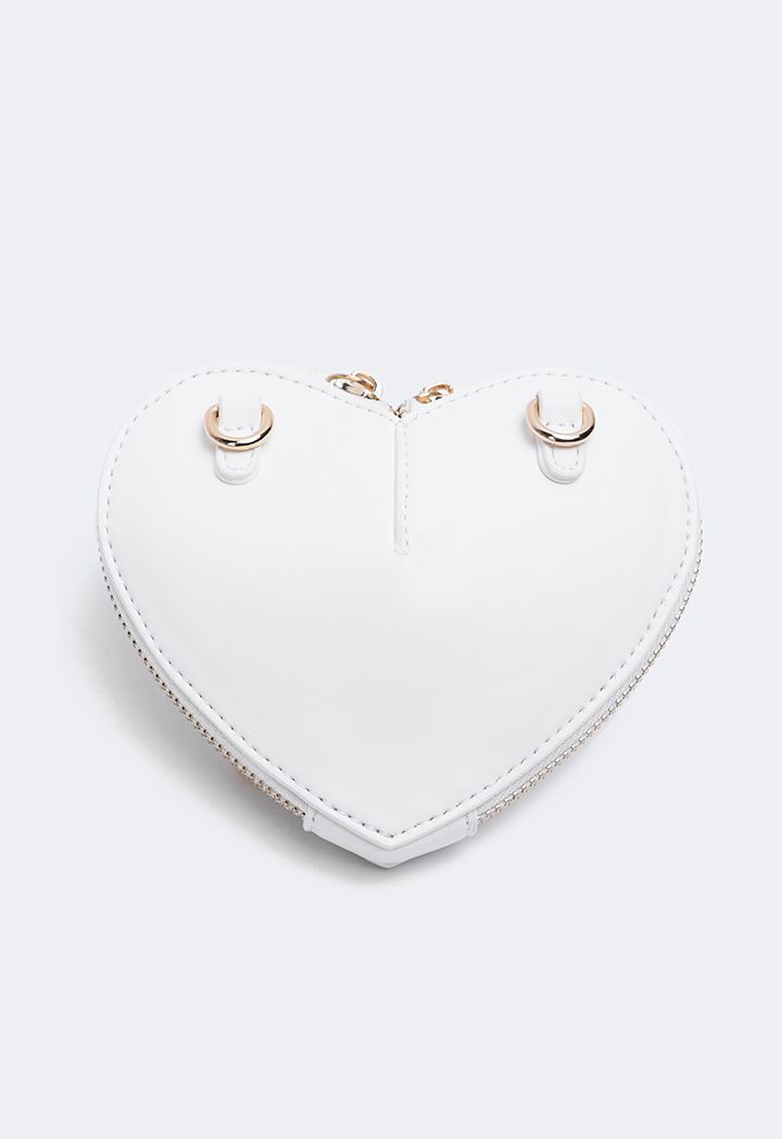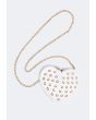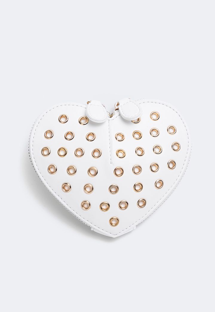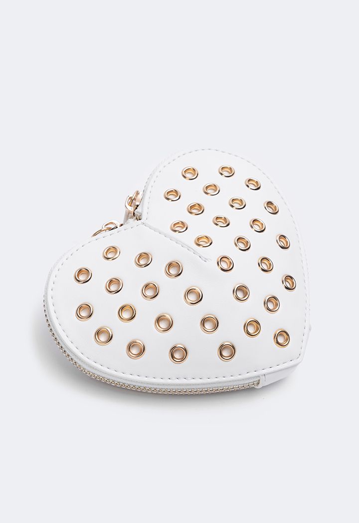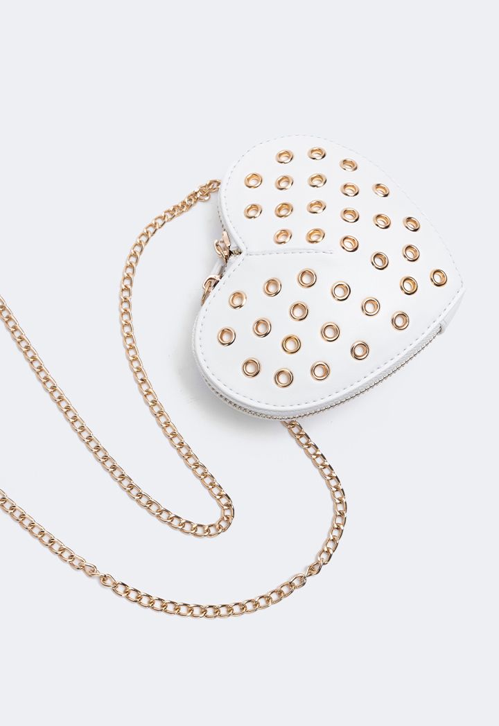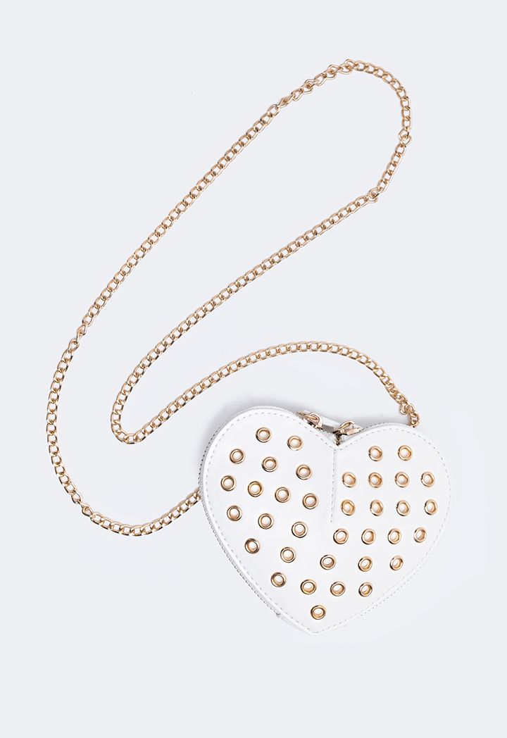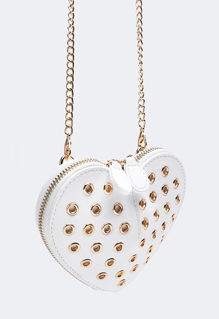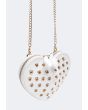 A heart shaped crossbody bag that features a studded design and a shoulder chain.