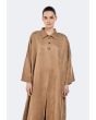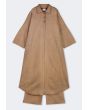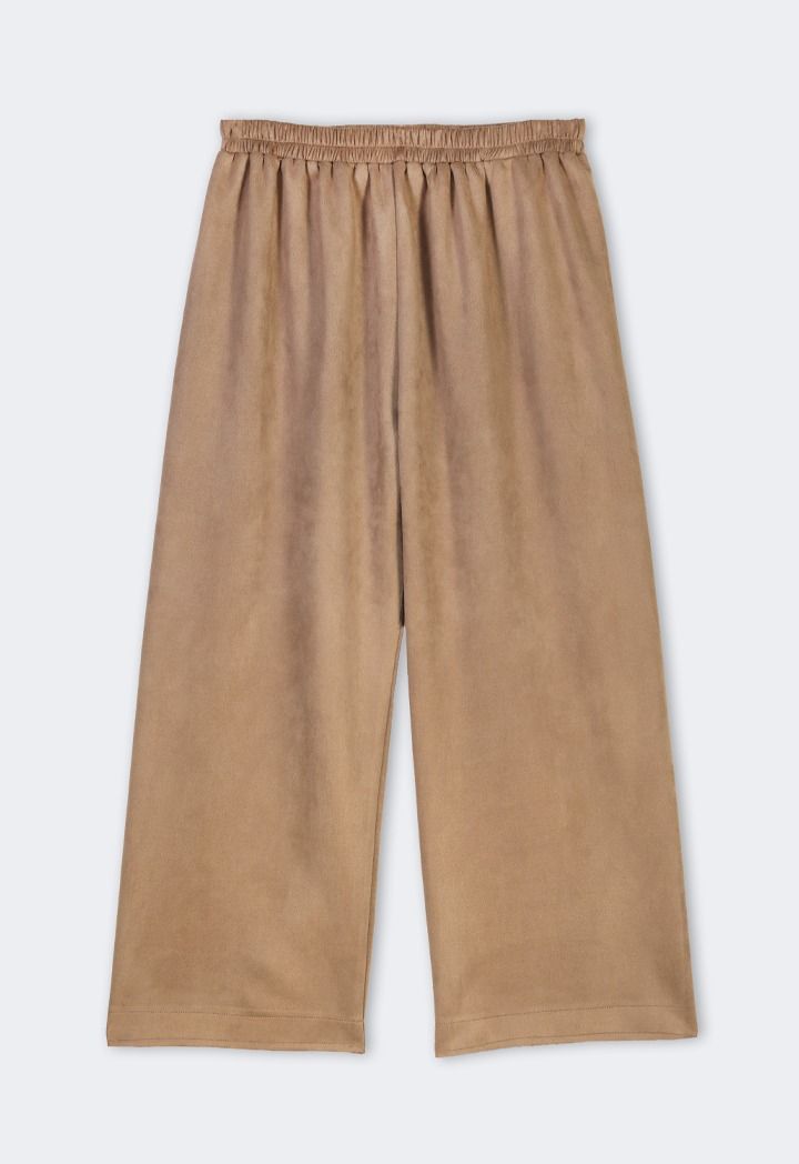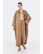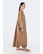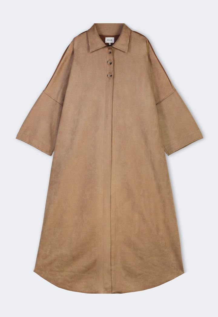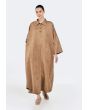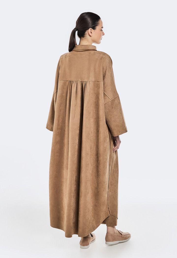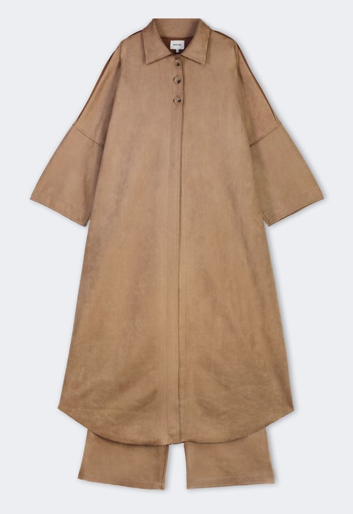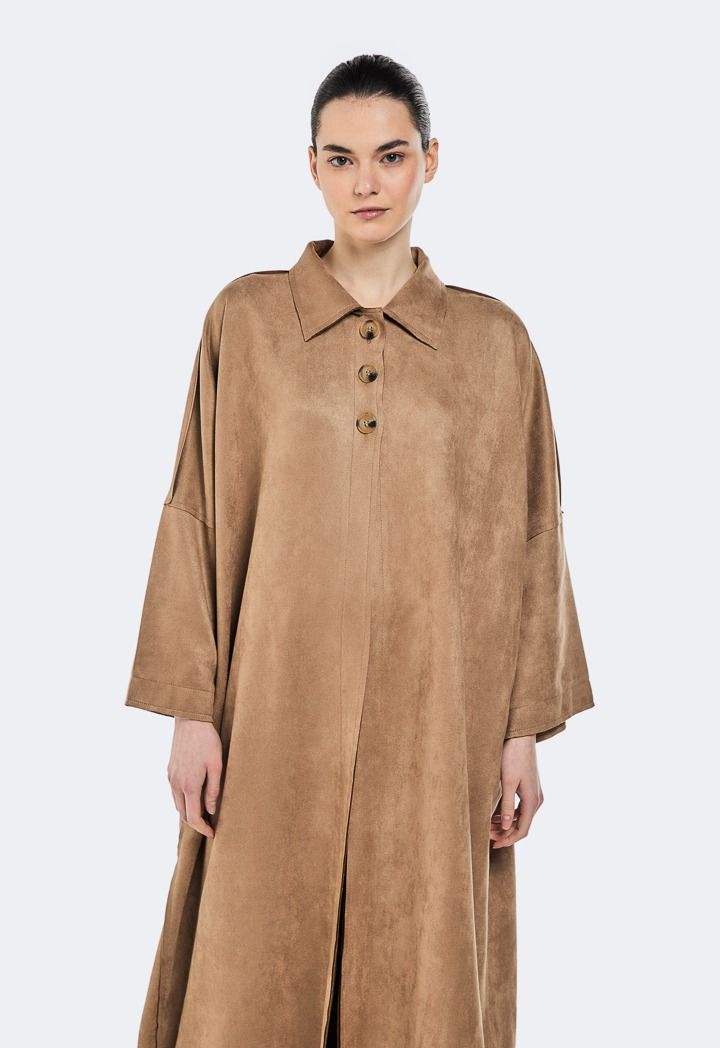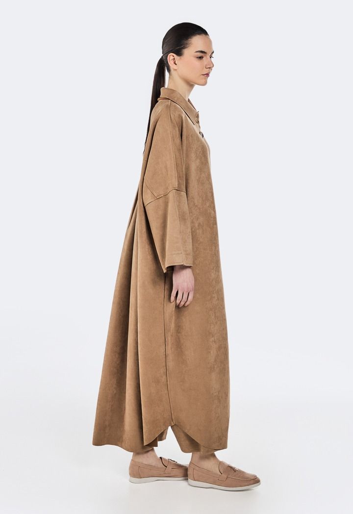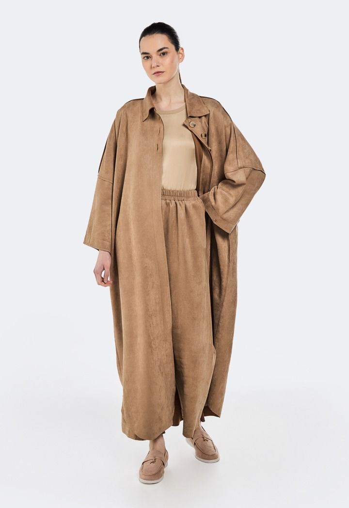 A modest set that features a buttoned suede abaya and a pair of regular fit trousers.