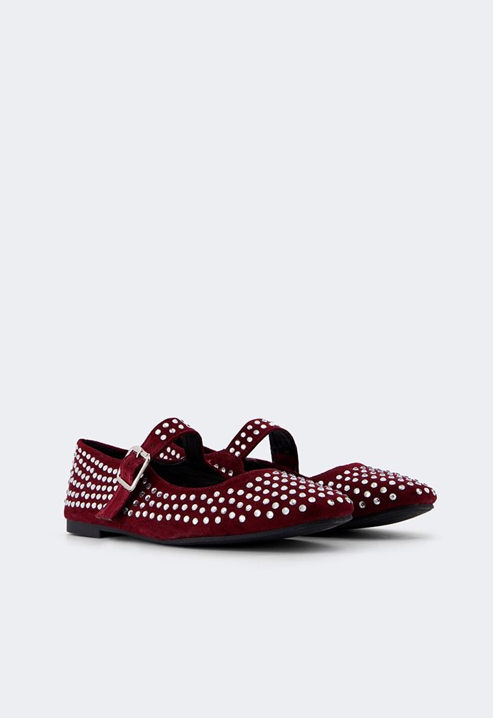 These ballet flats from are embellished with silver-ringed crystals, made from PU leather with buckled straps.
