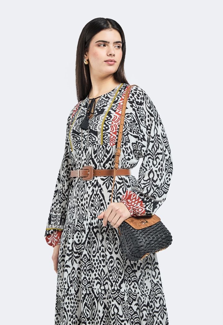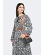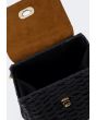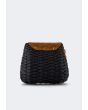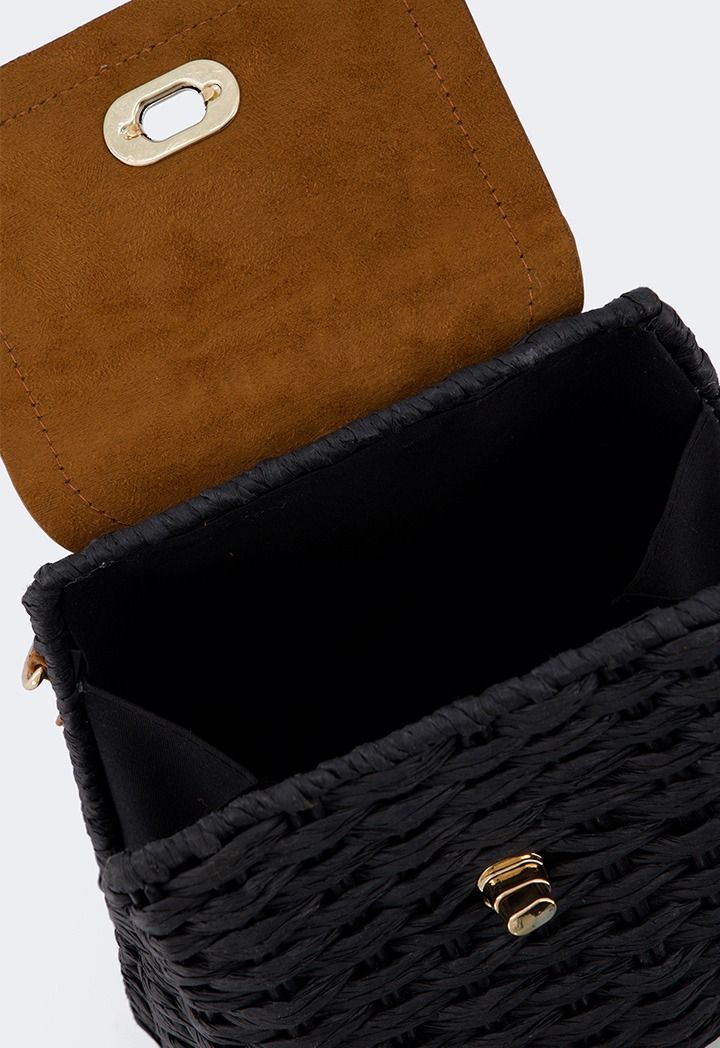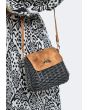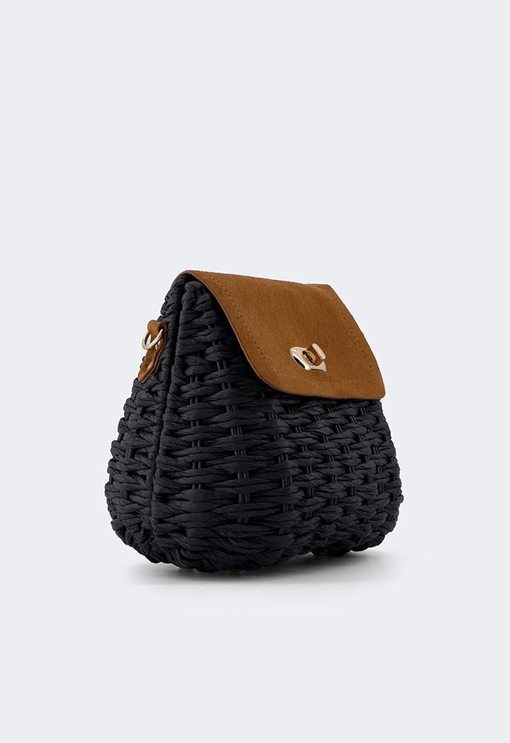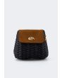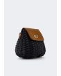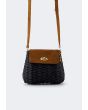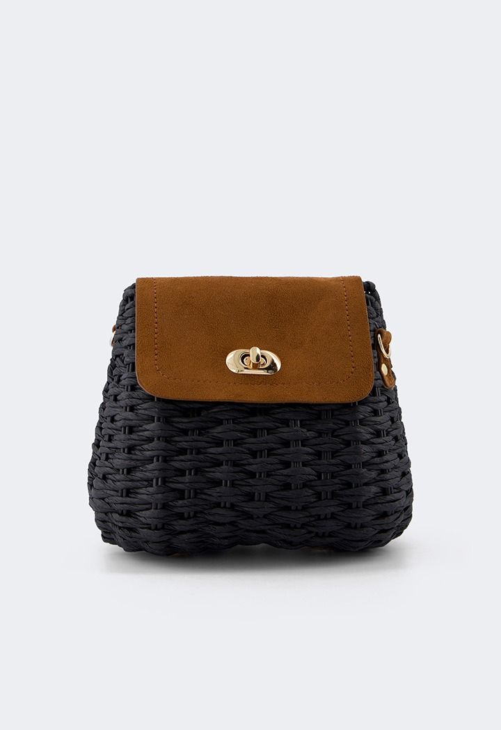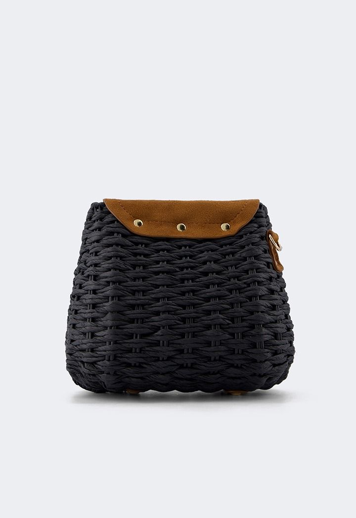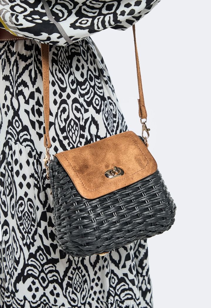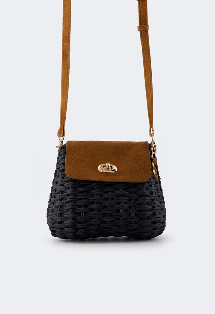 A modern bag that features a faux straw suede design and a shoulder strap.