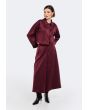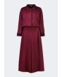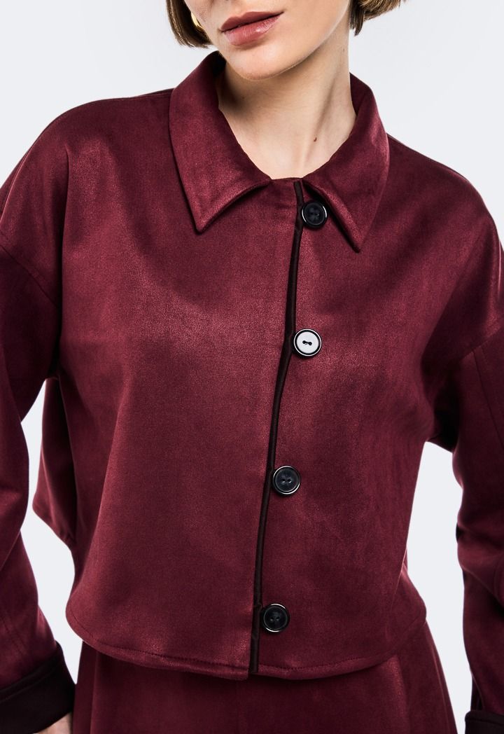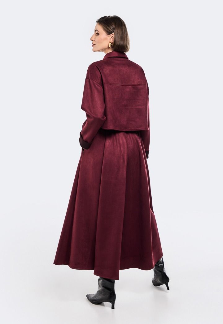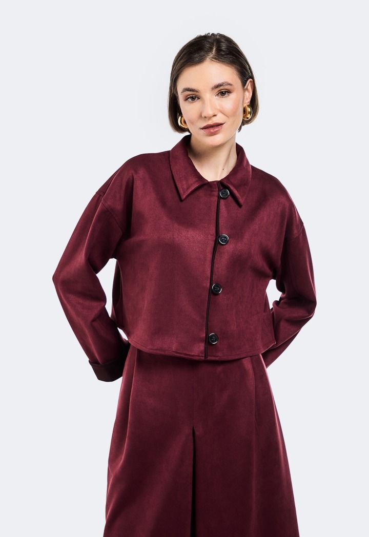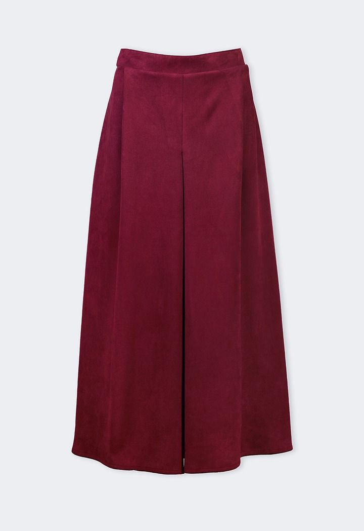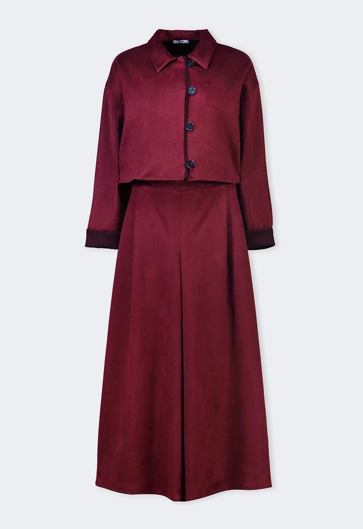 A modest set that features a buttoned suede Shirt and a pair of palazzo trousers.