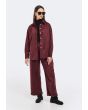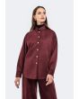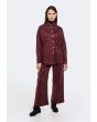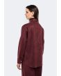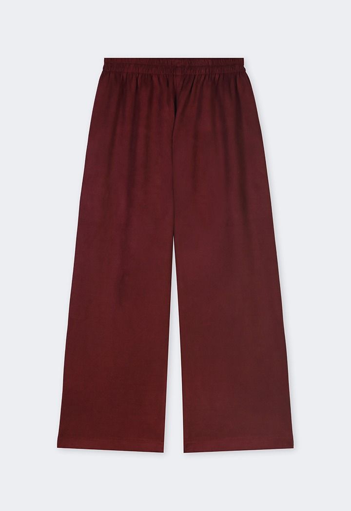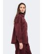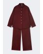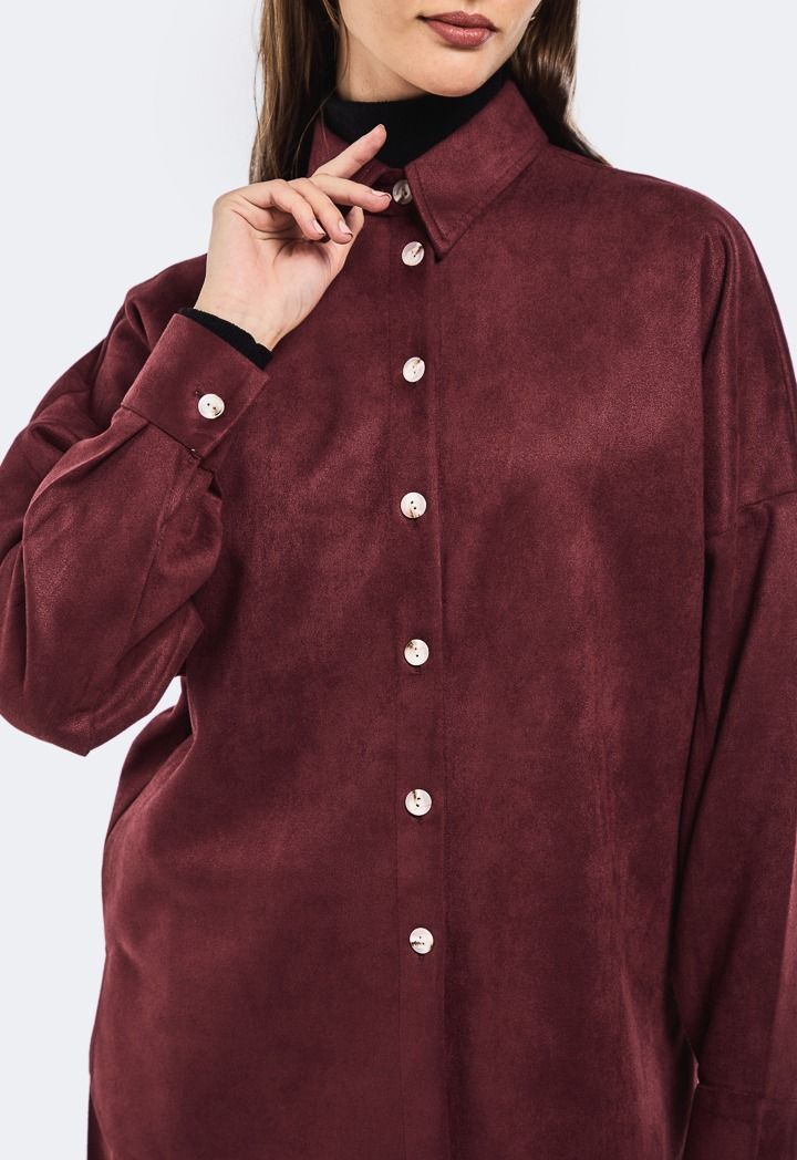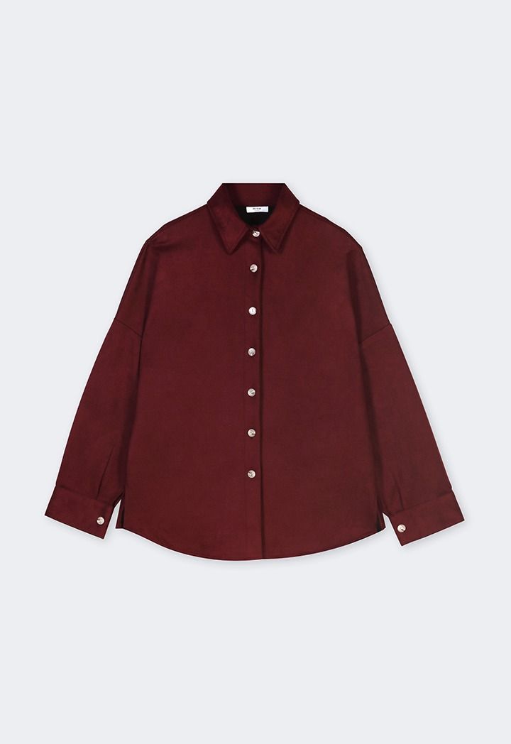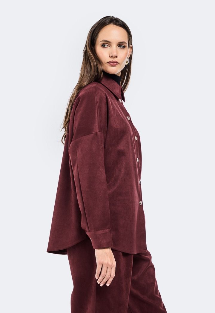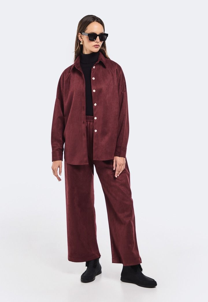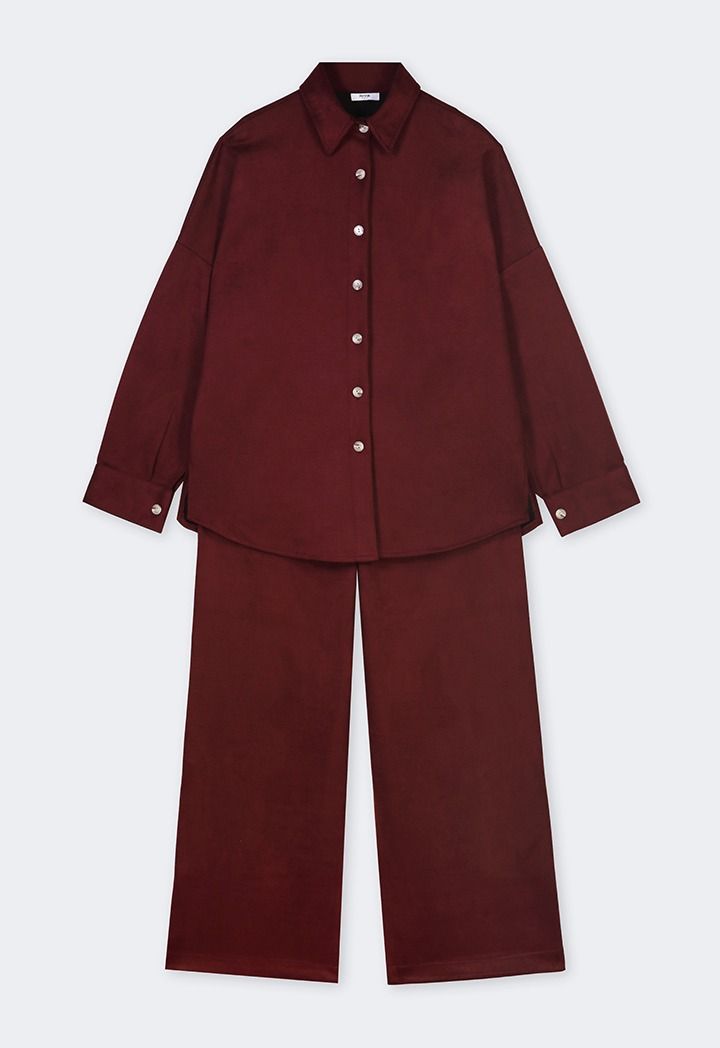 A modest set that features a buttoned suede Shirt and a pair of trousers.