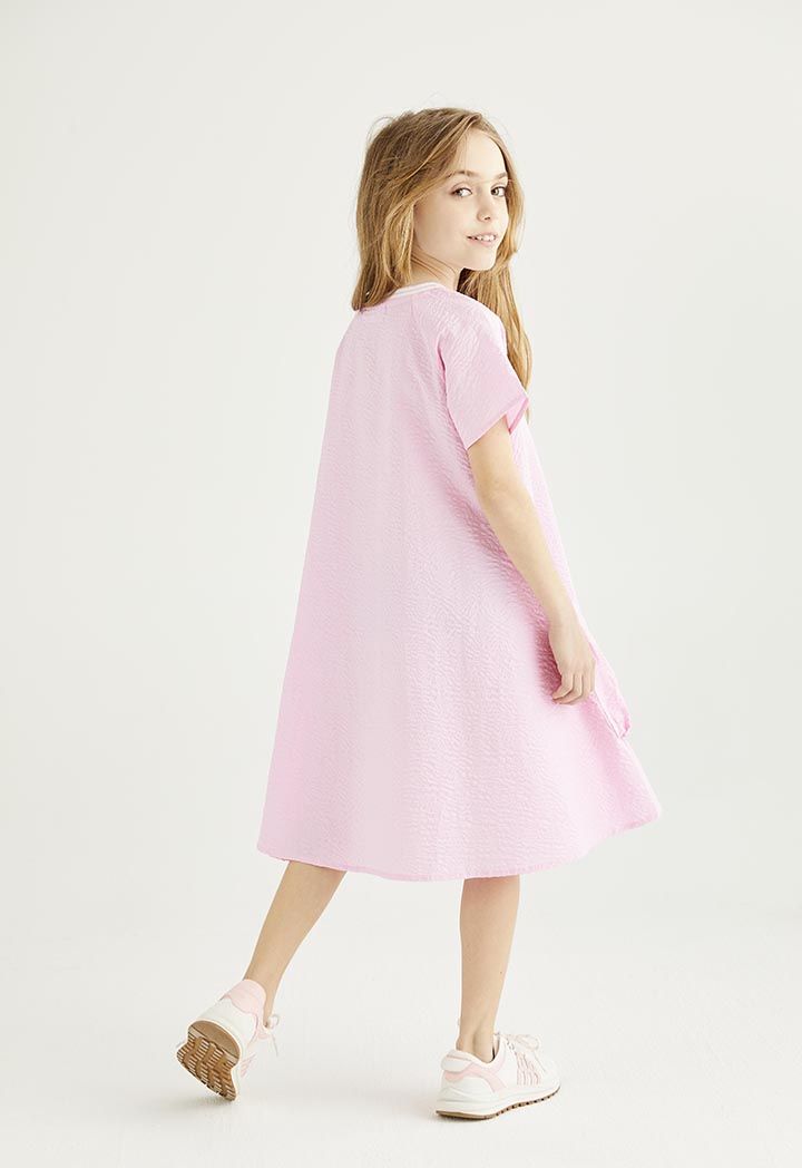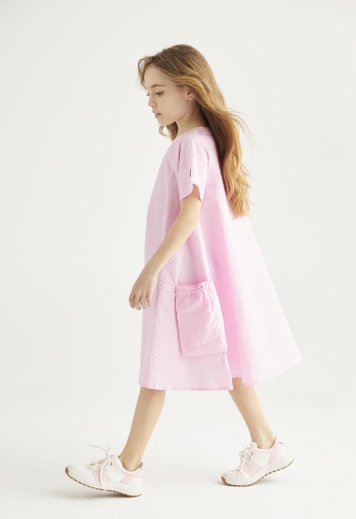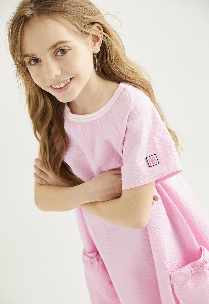 A cute summer dress that features an oversized fit, short sleeves and front pockets.