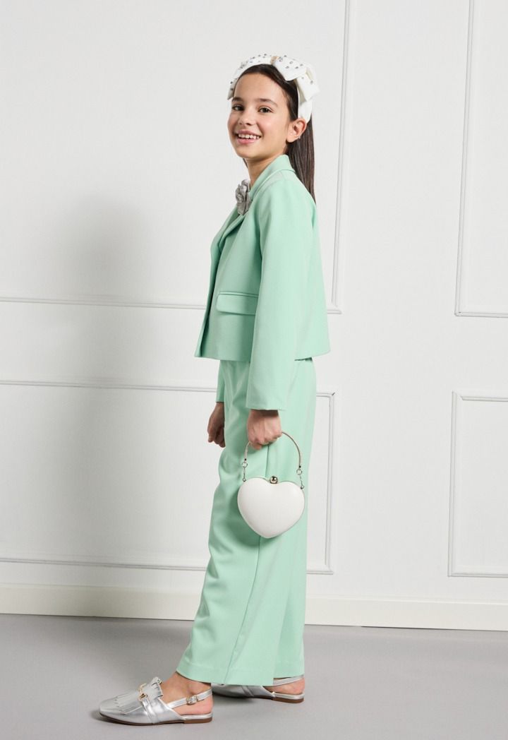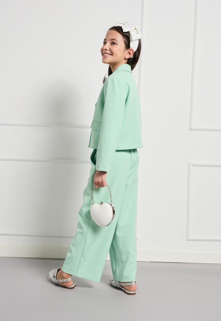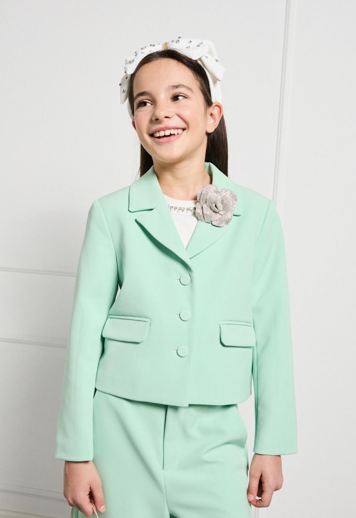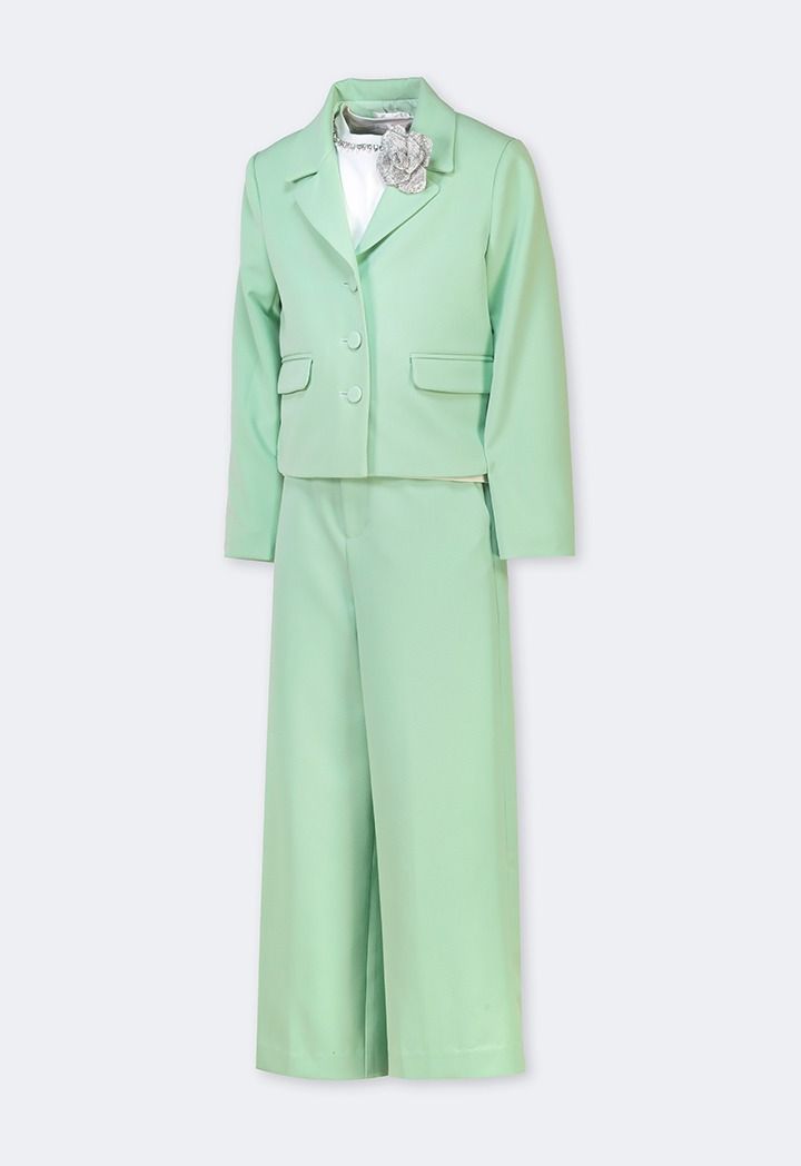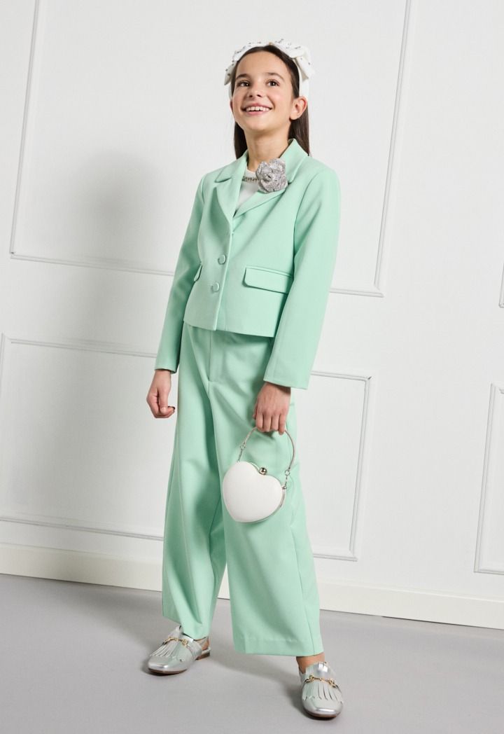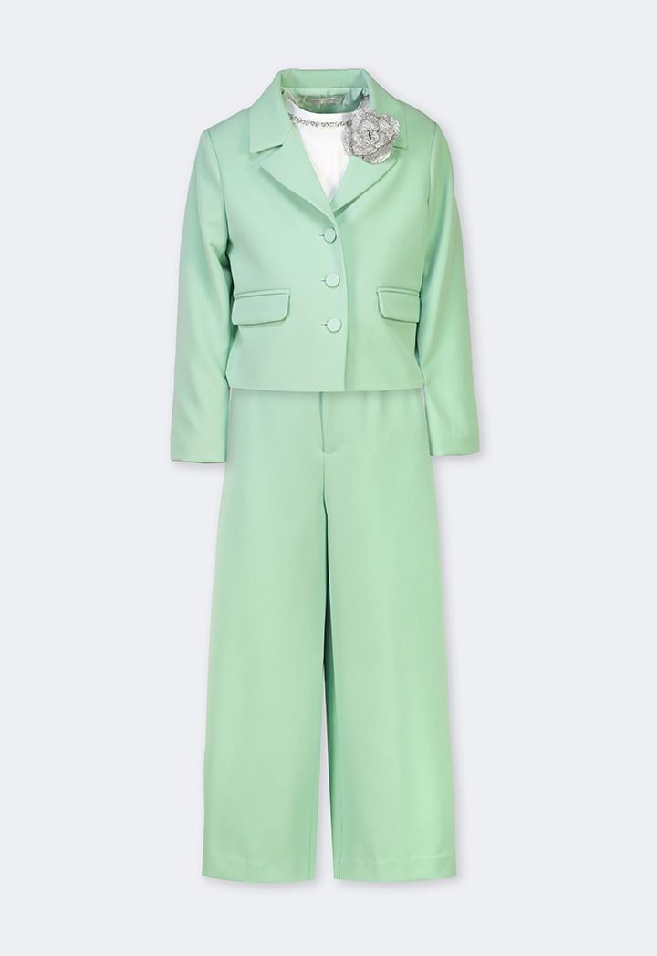 Your little girl would get both style and comfort wearing this set. Featuring a t shirt, blazer and a matching pair of trousers.