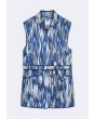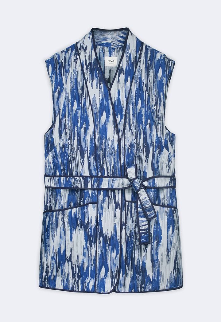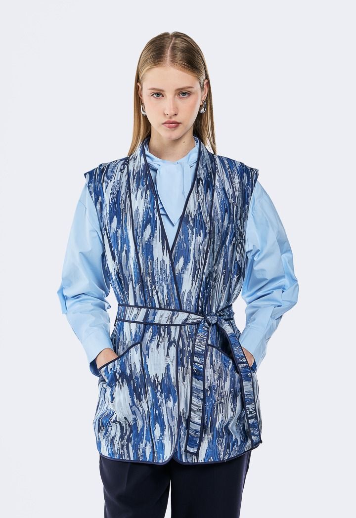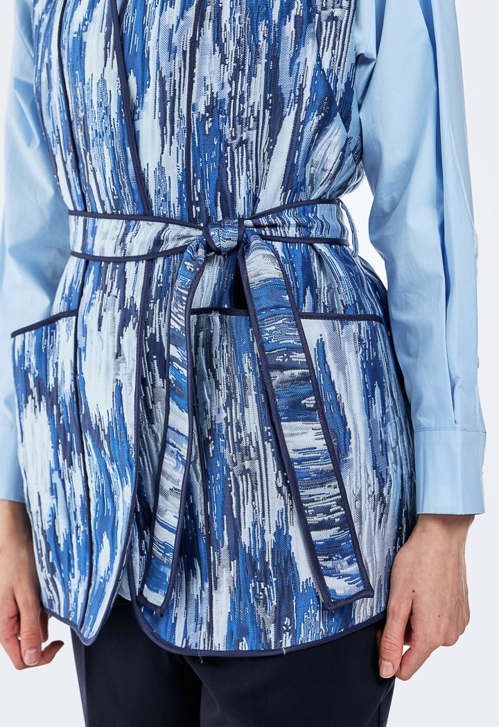 Chic vest with textured jacquard design offers a comfortable and structured feel. A multicolor pattern and the sleeveless silhouette allow for easy layering and diverse styling options.