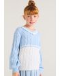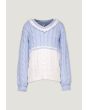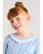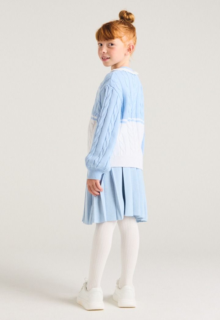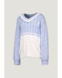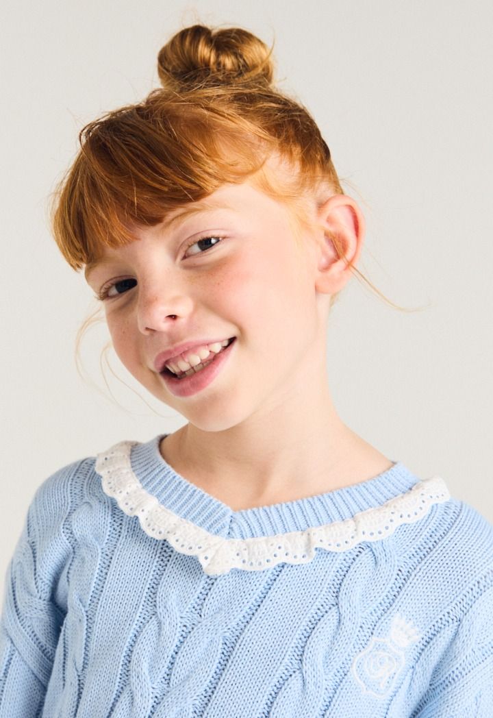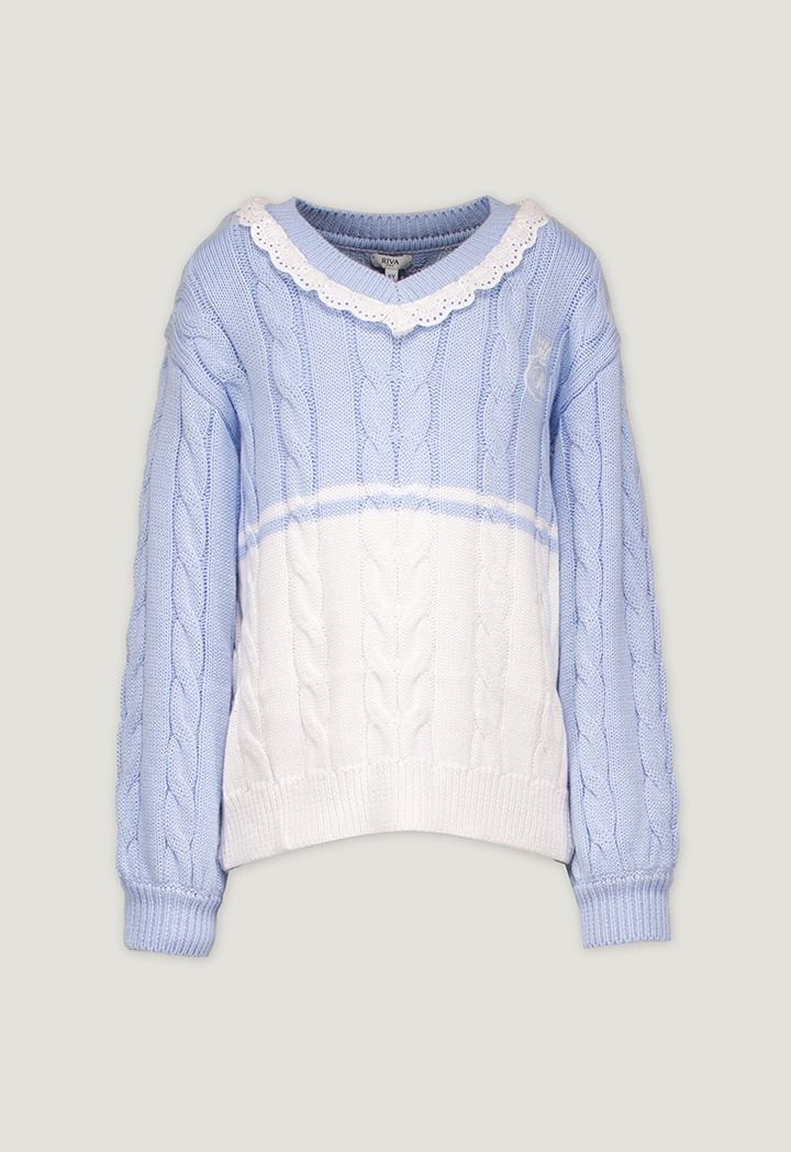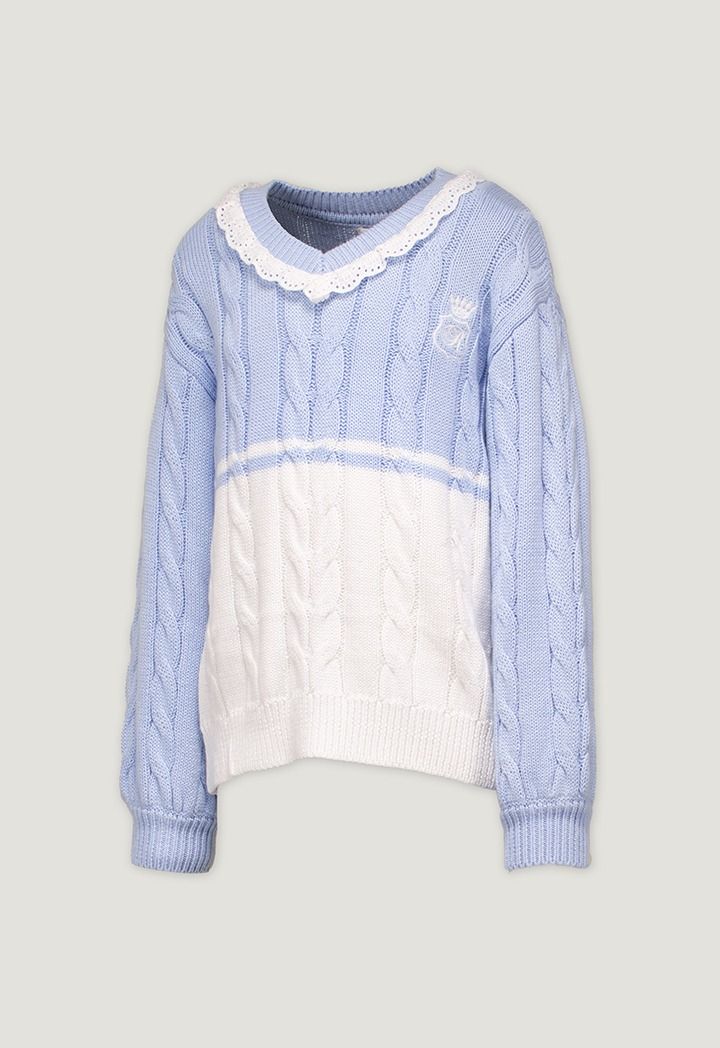 A contrast knitted sweater that features a textured design with schiffli details.