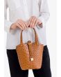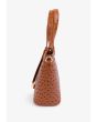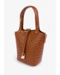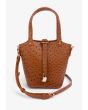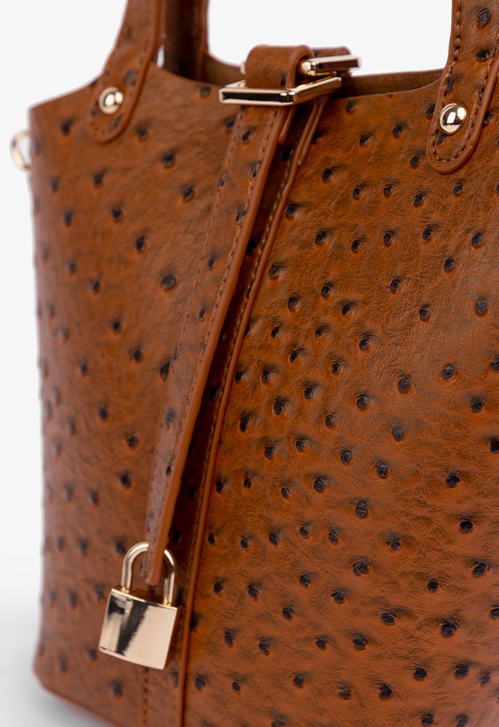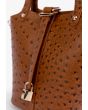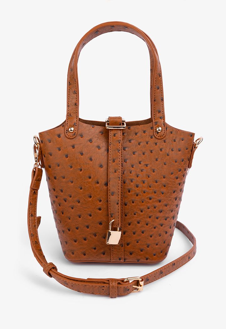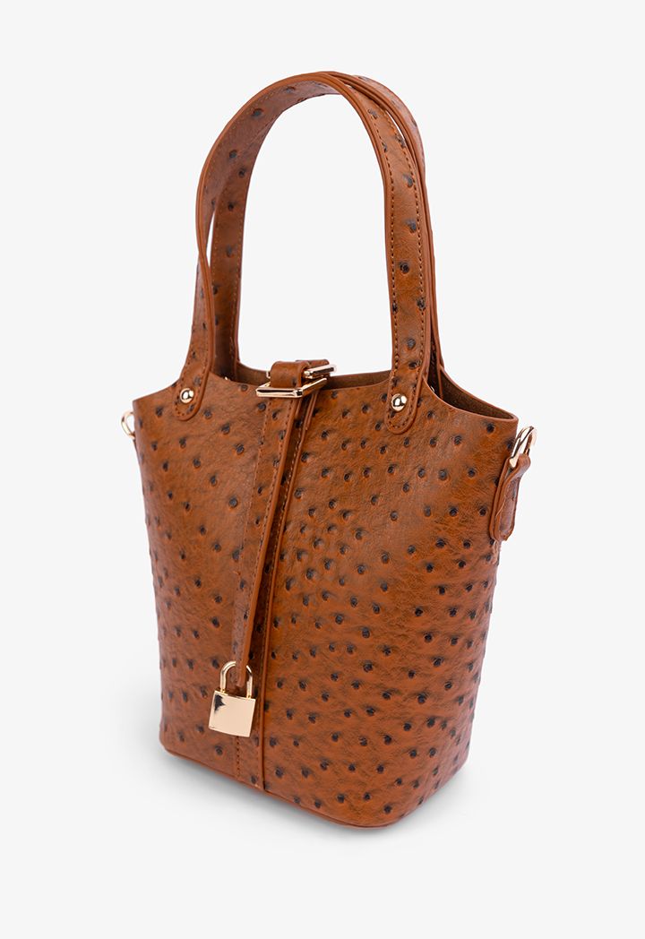 This unique bucket bag is featured in a faux textured ostrich, it includes top handles and an open top.