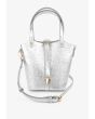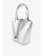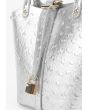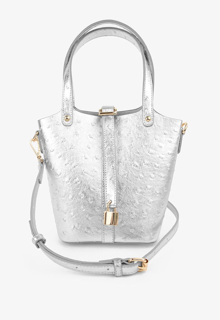 This unique bucket bag is featured in a faux textured ostrich, it includes top handles and an open top.