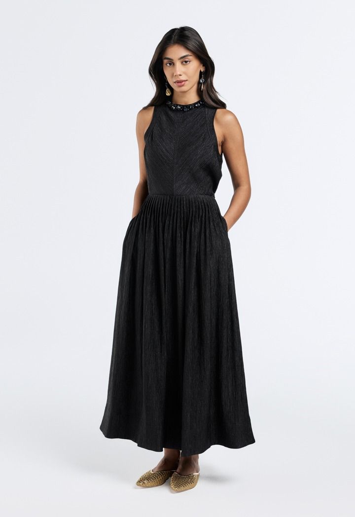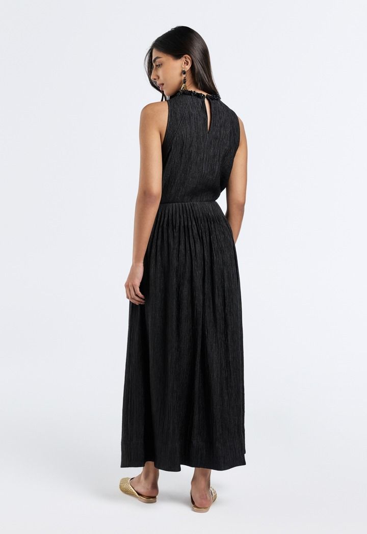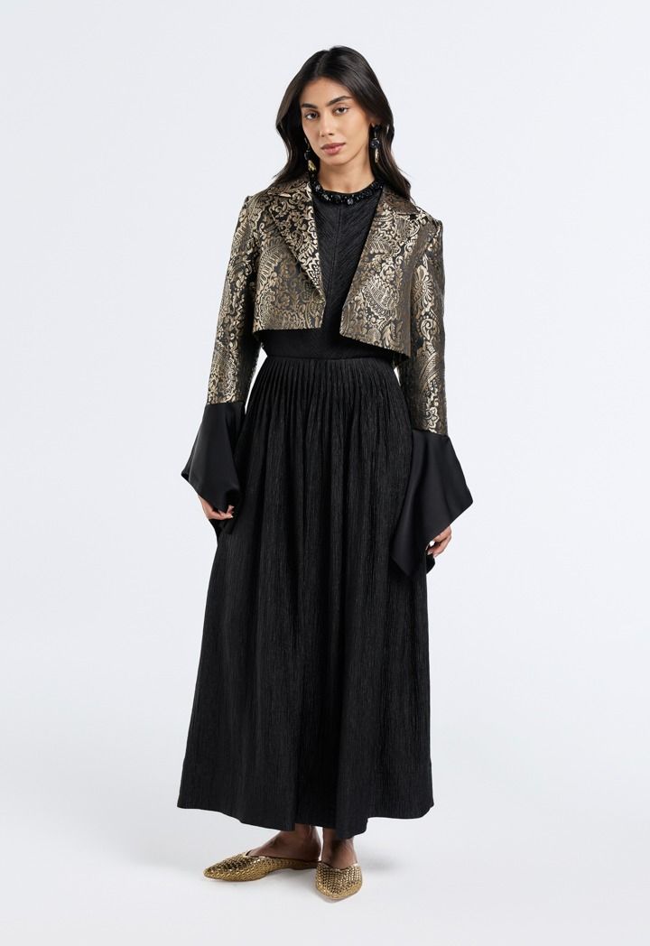 Soft textures and pleated details create a graceful, flowing silhouette.