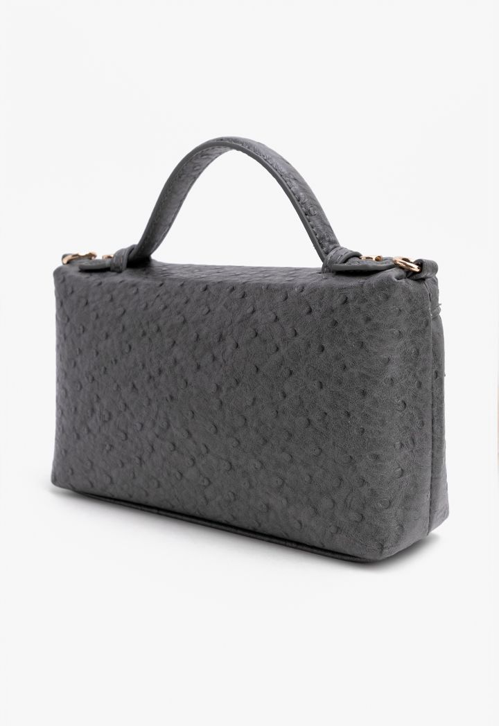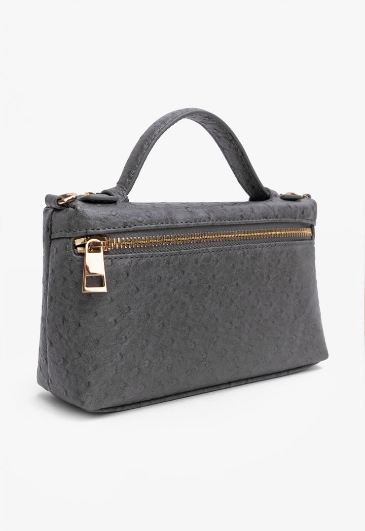 Design : Textured, One main compartment, top carry handle, Chain link shoulder strap, Interior zipped pocket Closure : Zipper
