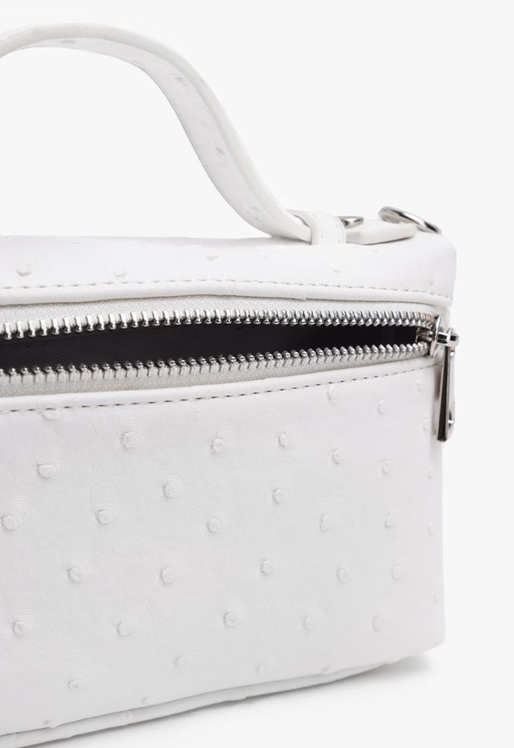 Design : Textured, One main compartment, top carry handle, Chain link shoulder strap, Interior zipped pocket Closure : Zipper