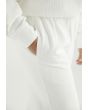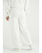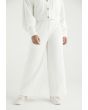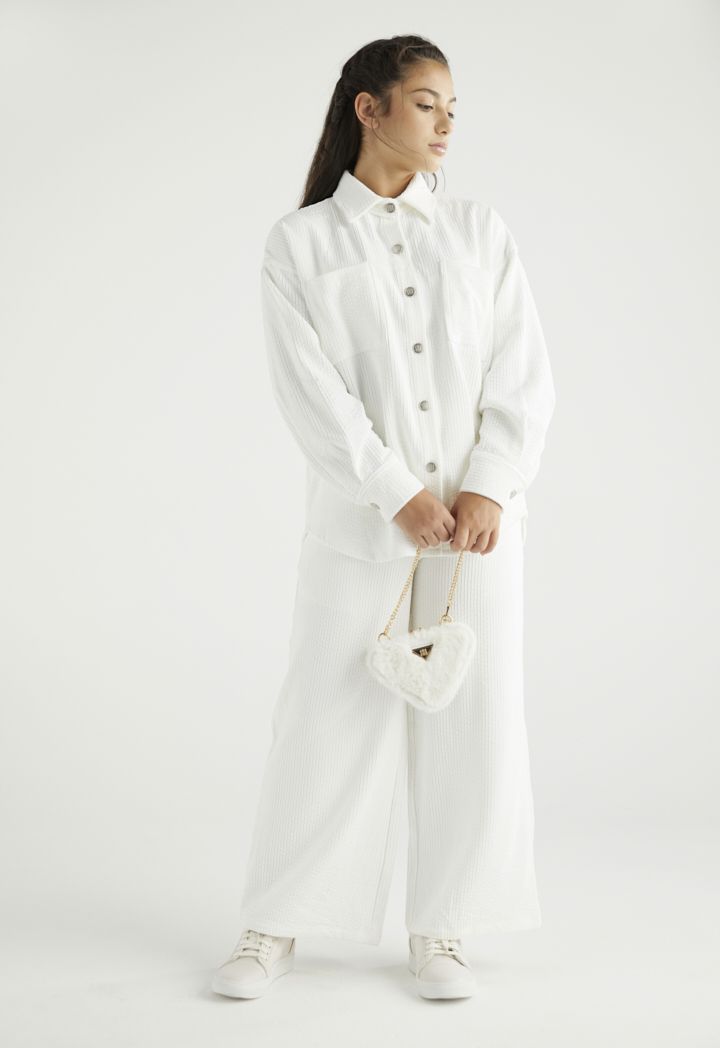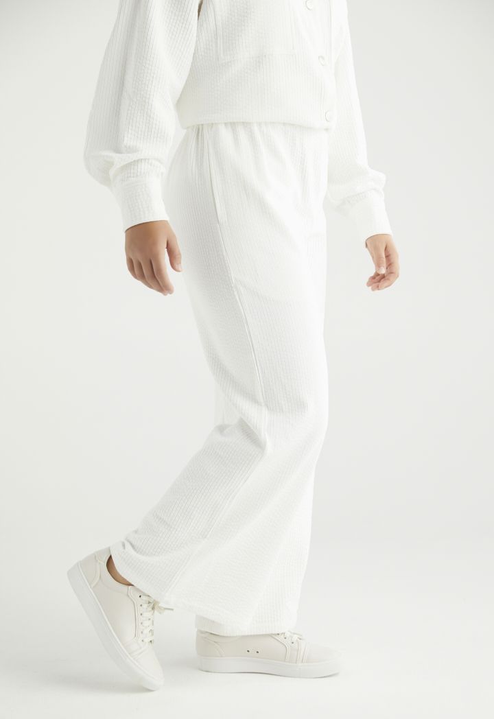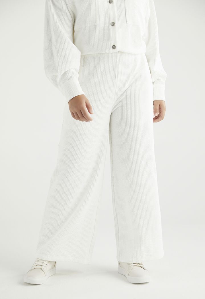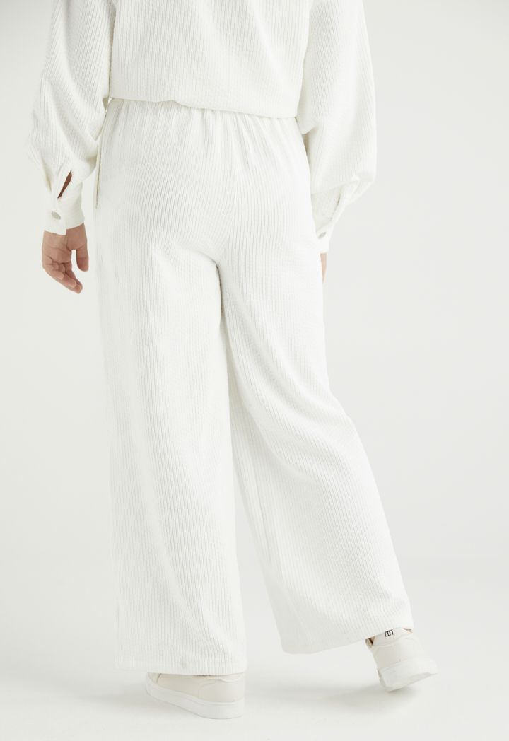 An alluring pair of pants that features a textured striped design and an elastic waist .