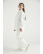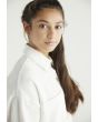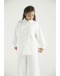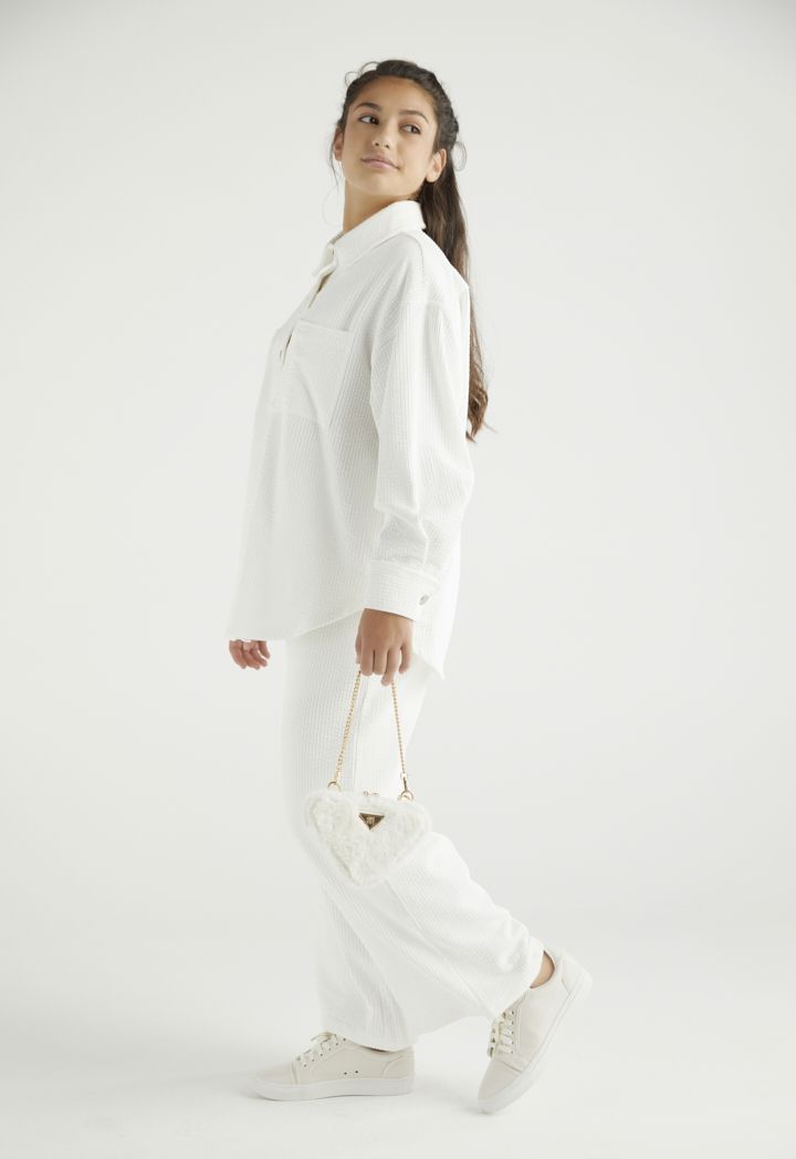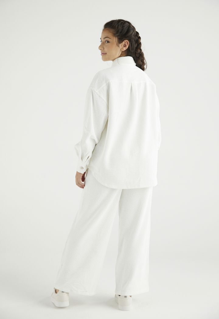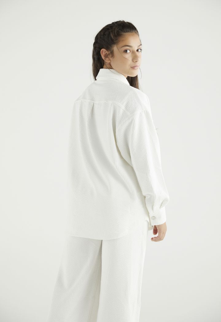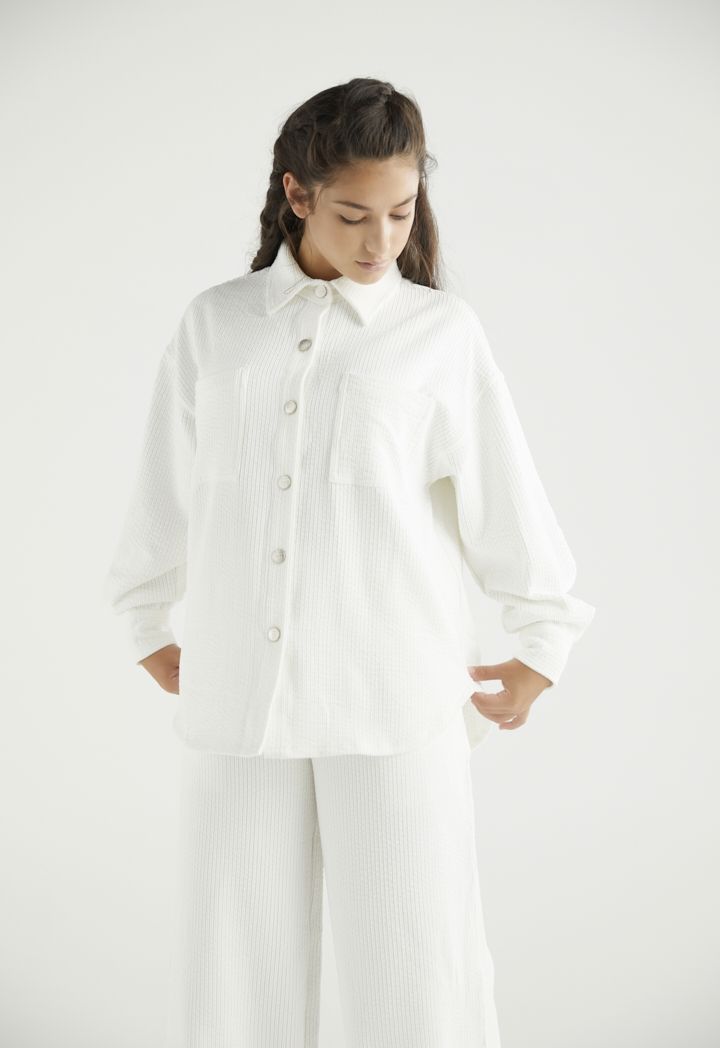 An alluring shirt jacket that features a textured striped design and front buttons .