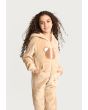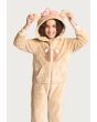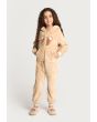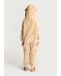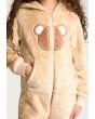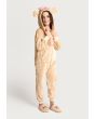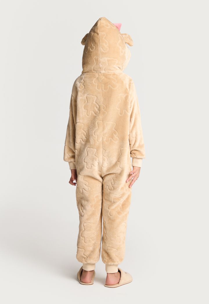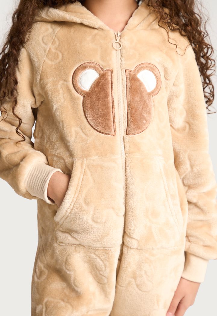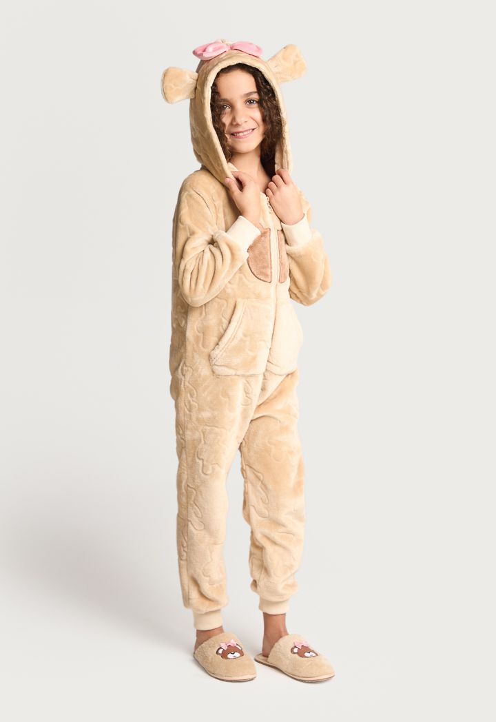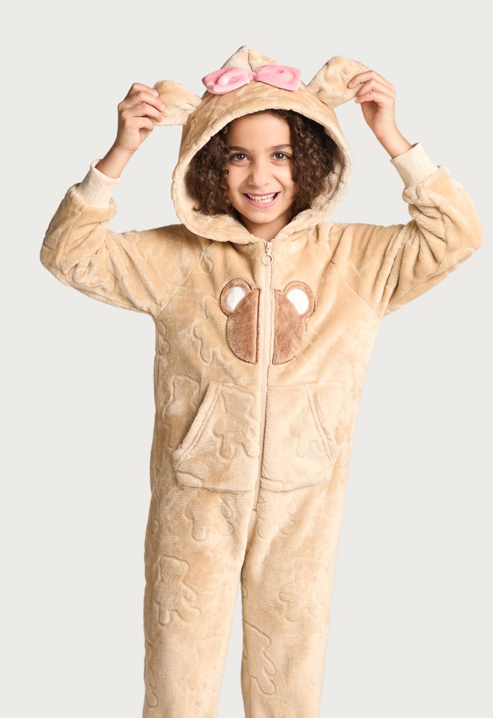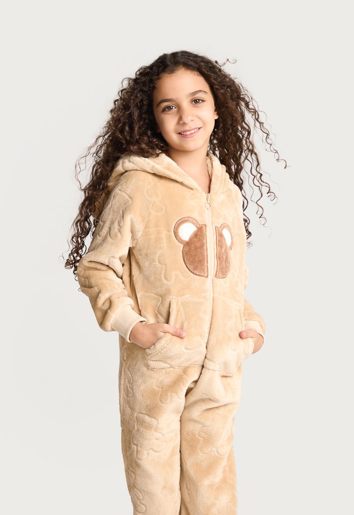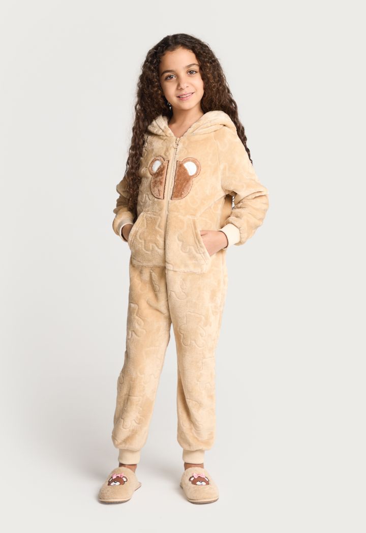 A textured cozy onesie that features a warm hoodie, long sleeves and a front zipper.