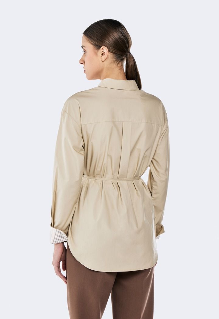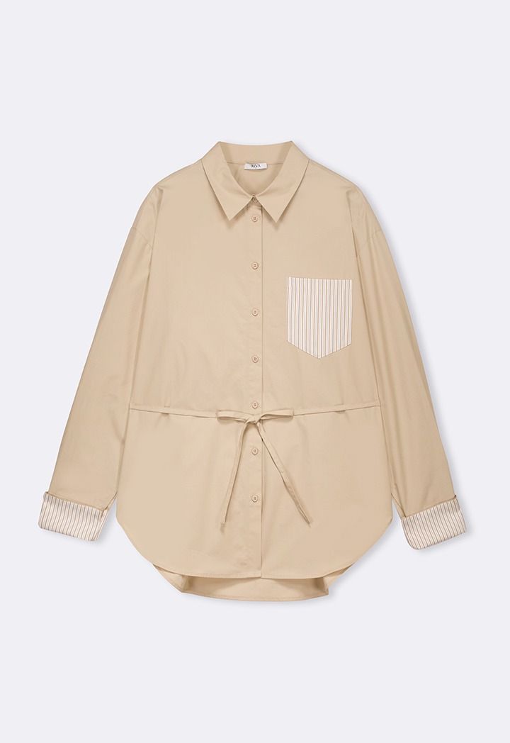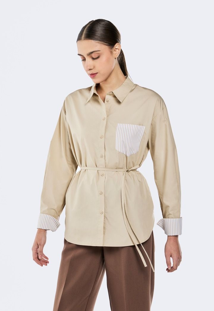 Make a sophisticated statement with our stripe-detailed shirt, featuring a chic tie-belt that cinches the waist for a modern, feminine finish.