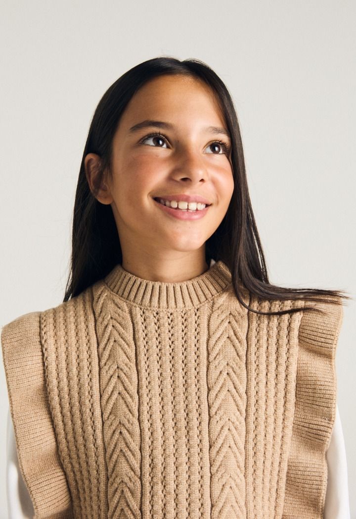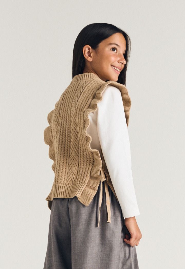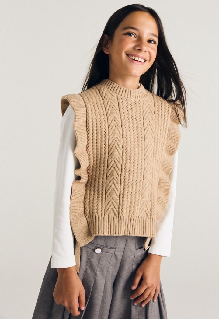 A textured ruffled vest that features a not so basic design to elevate your daughters style.