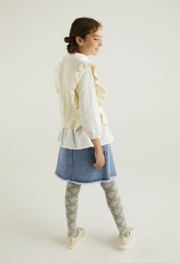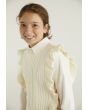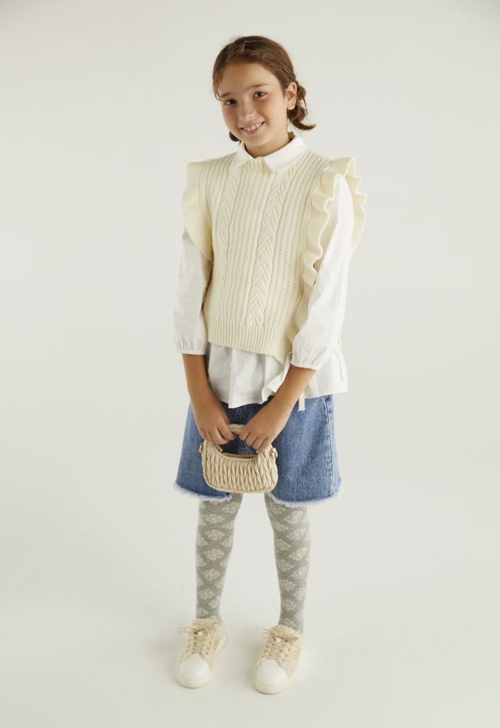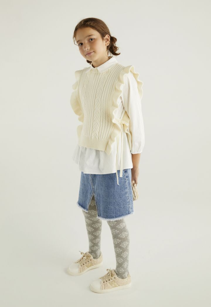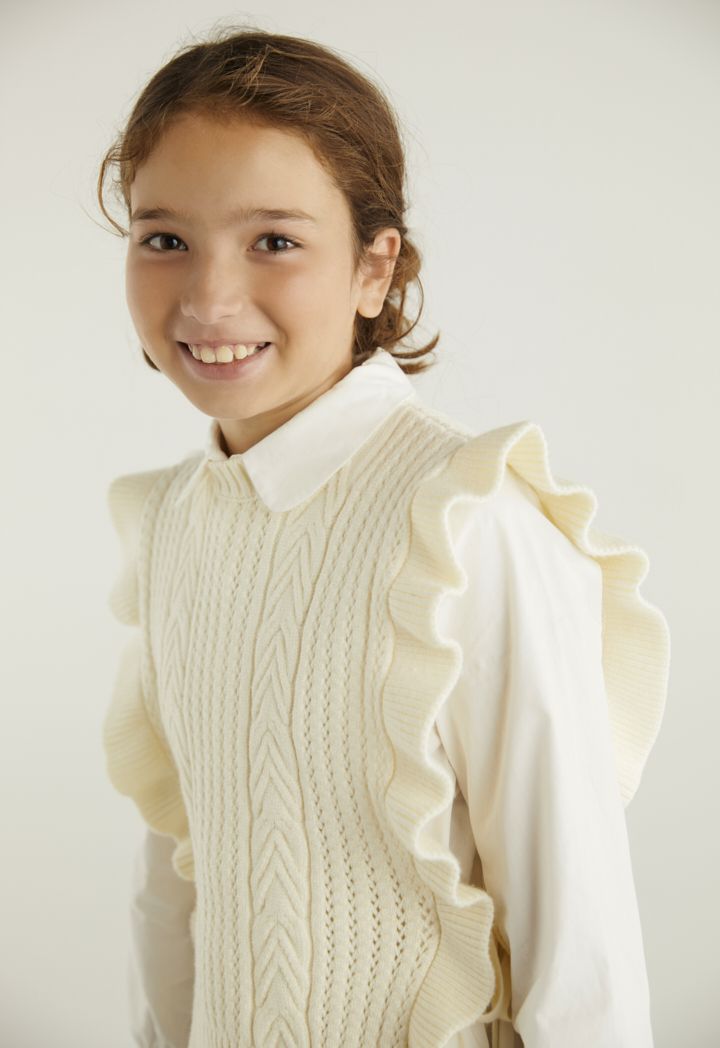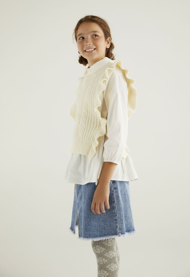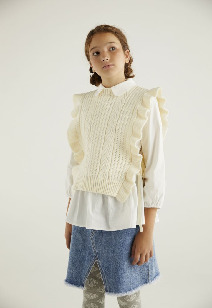 A textured ruffled vest that features a not so basic design to elevate your daughters style.