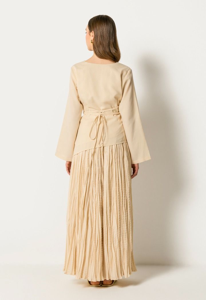 A soft tie-waist top and crinkled pleated skirt for an easy, twirly look you can style for weekdays or celebrations.