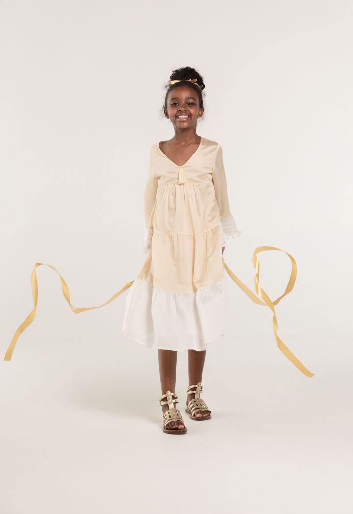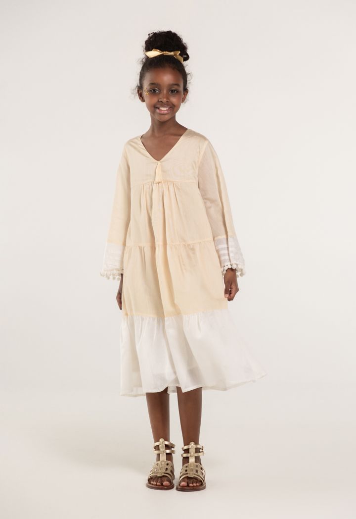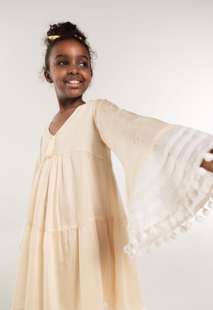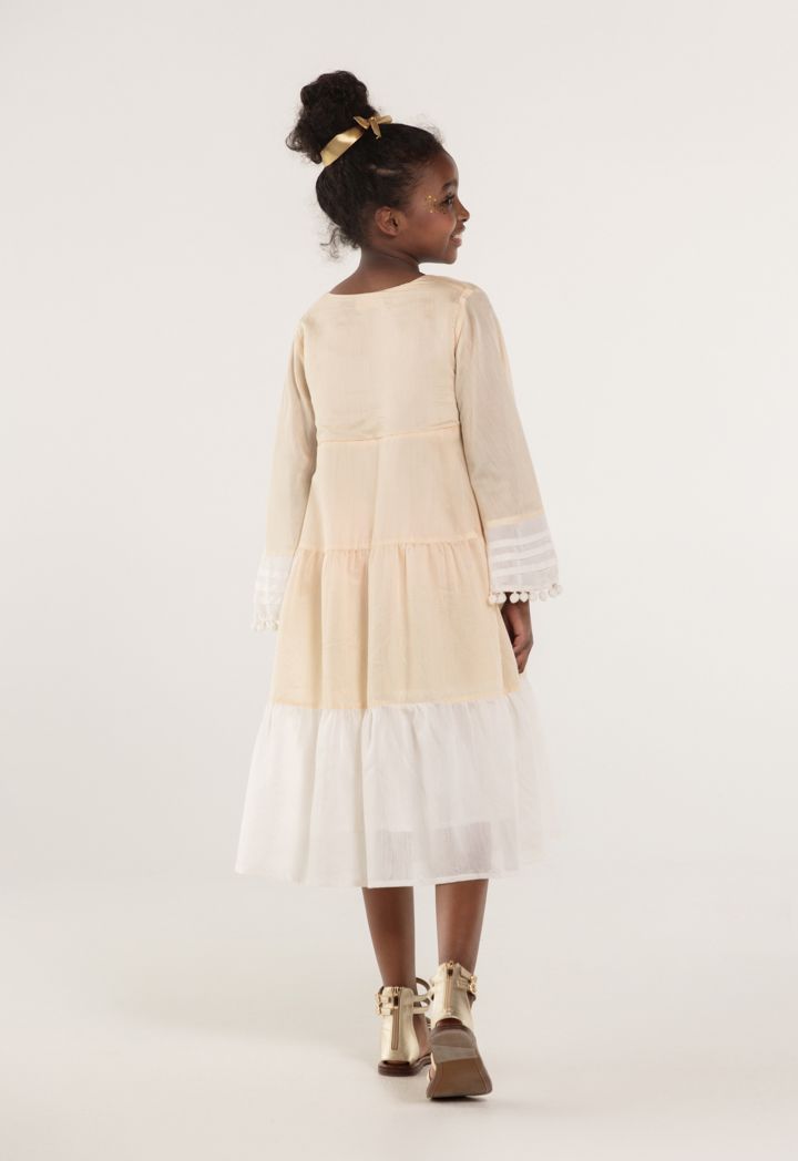 This Classy Dress is an excellent pick for your little girl. It is designed with Pom Poms Details and Tiered details for more appeal.