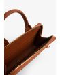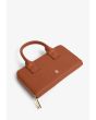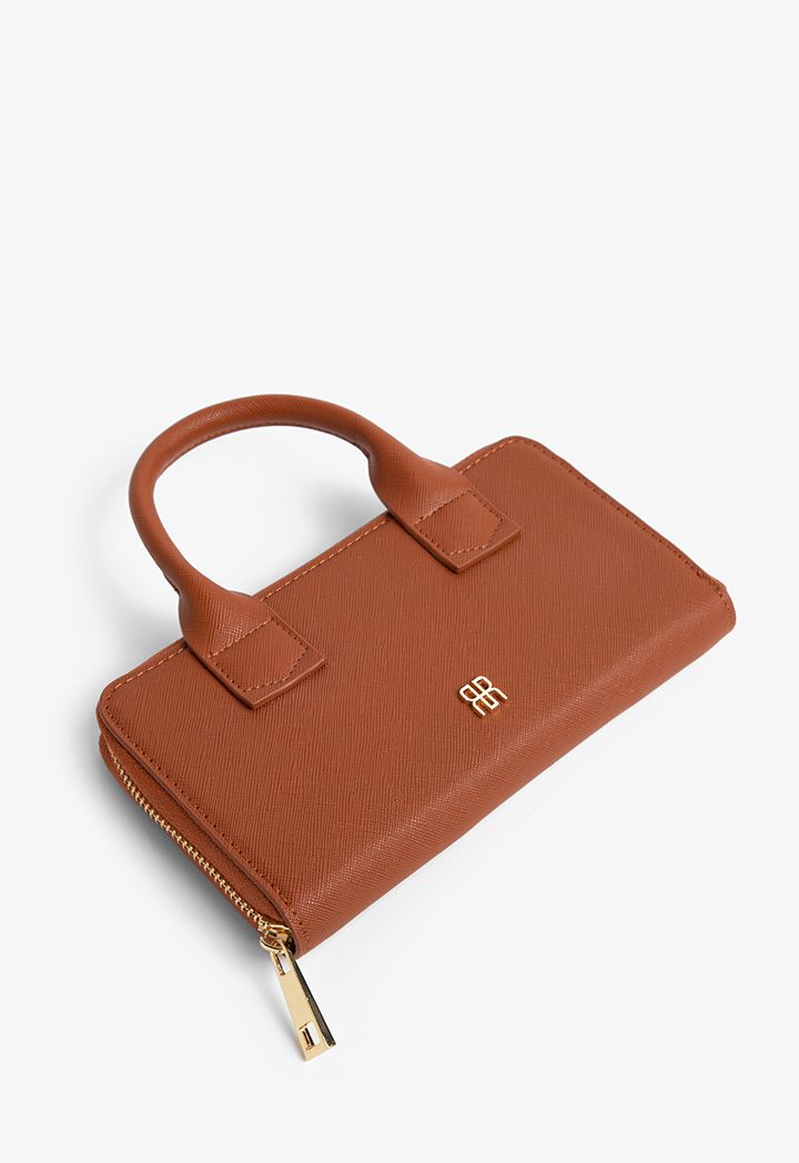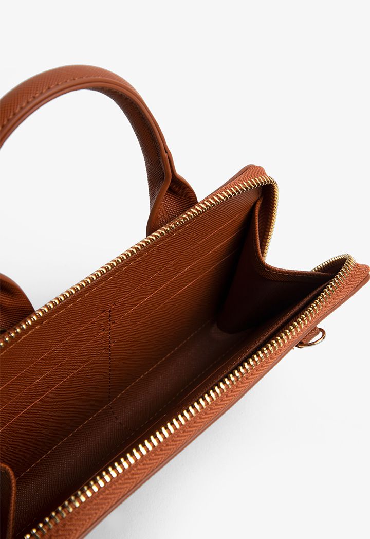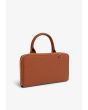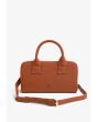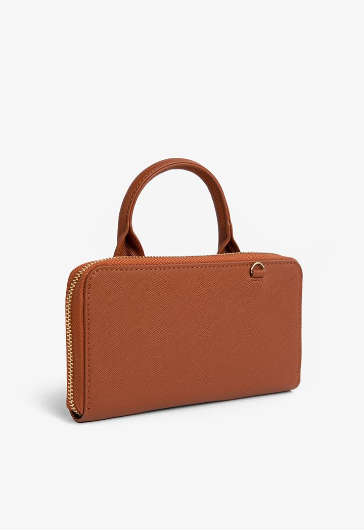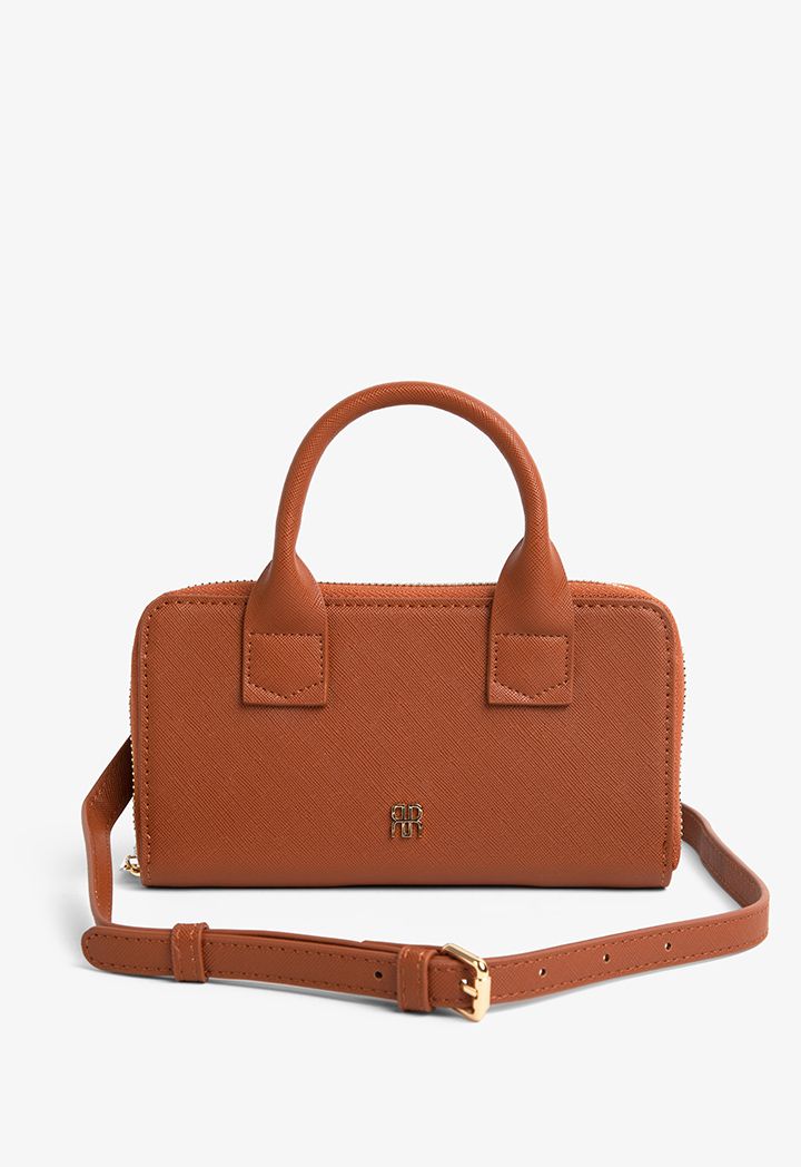 A solid pouch that features a top handle, inner compartments and a shoulder strap.