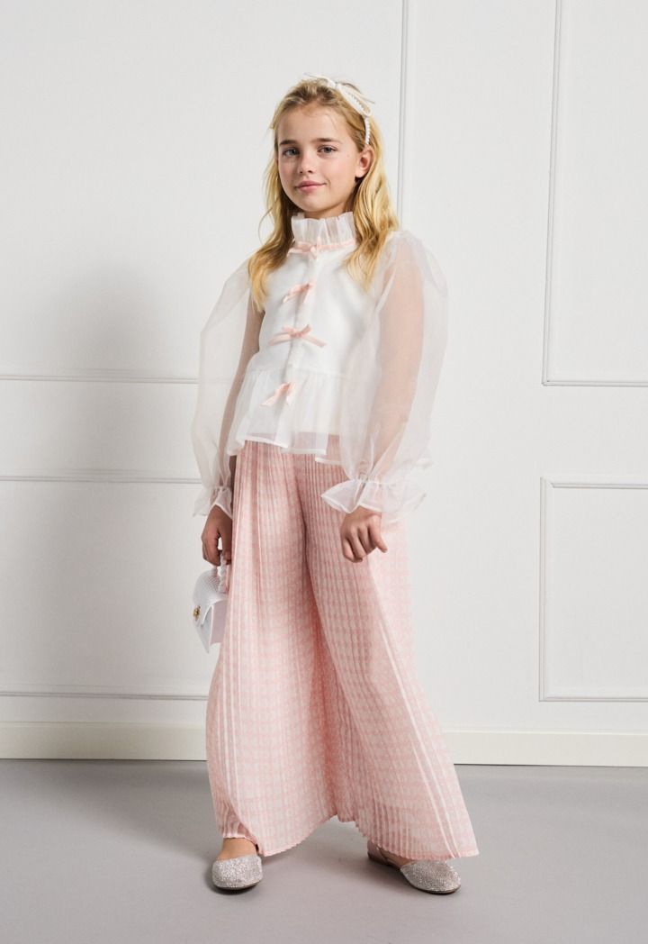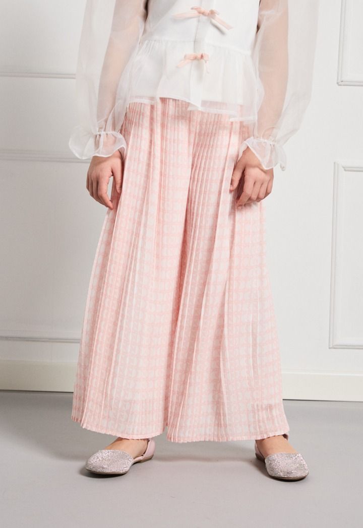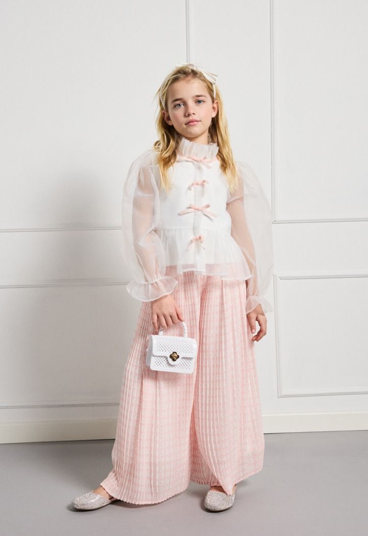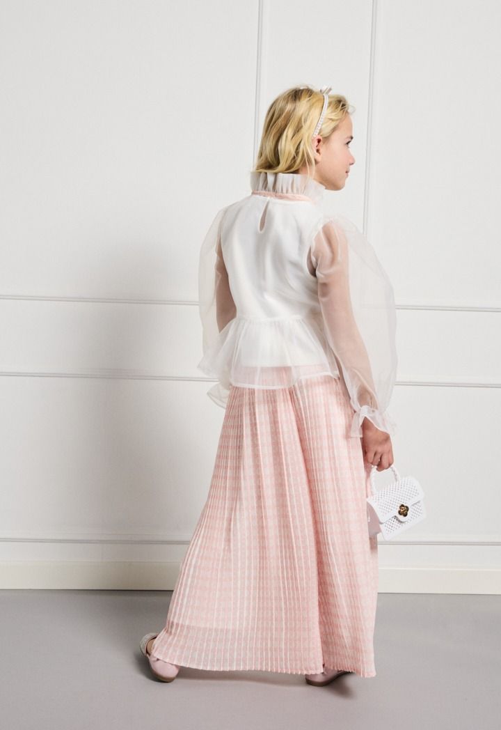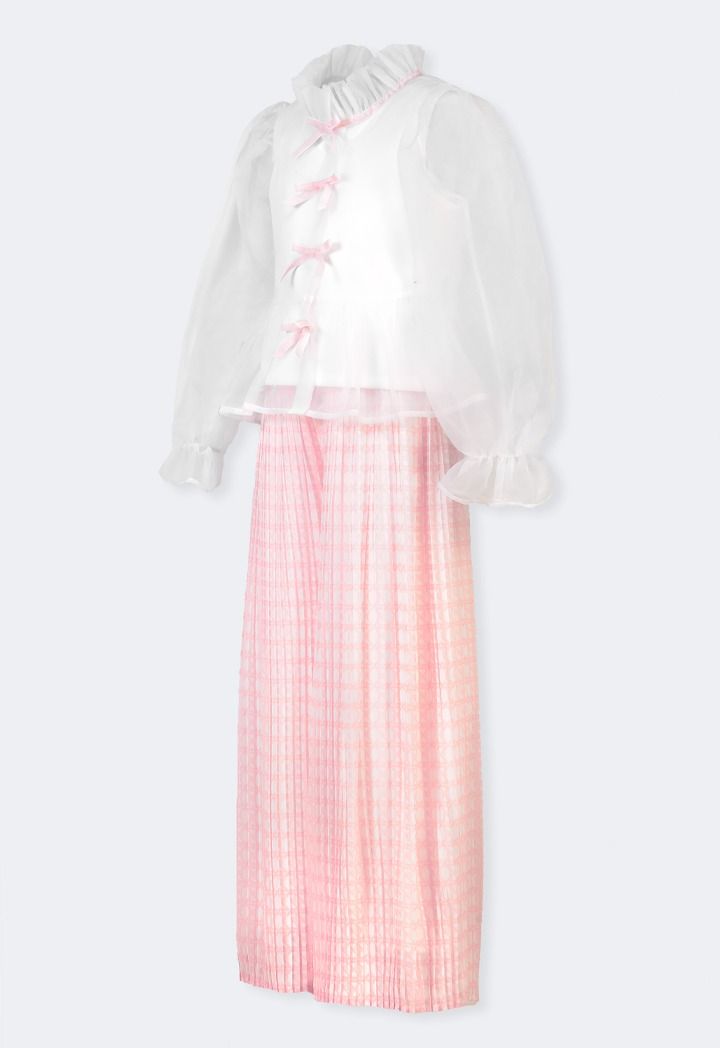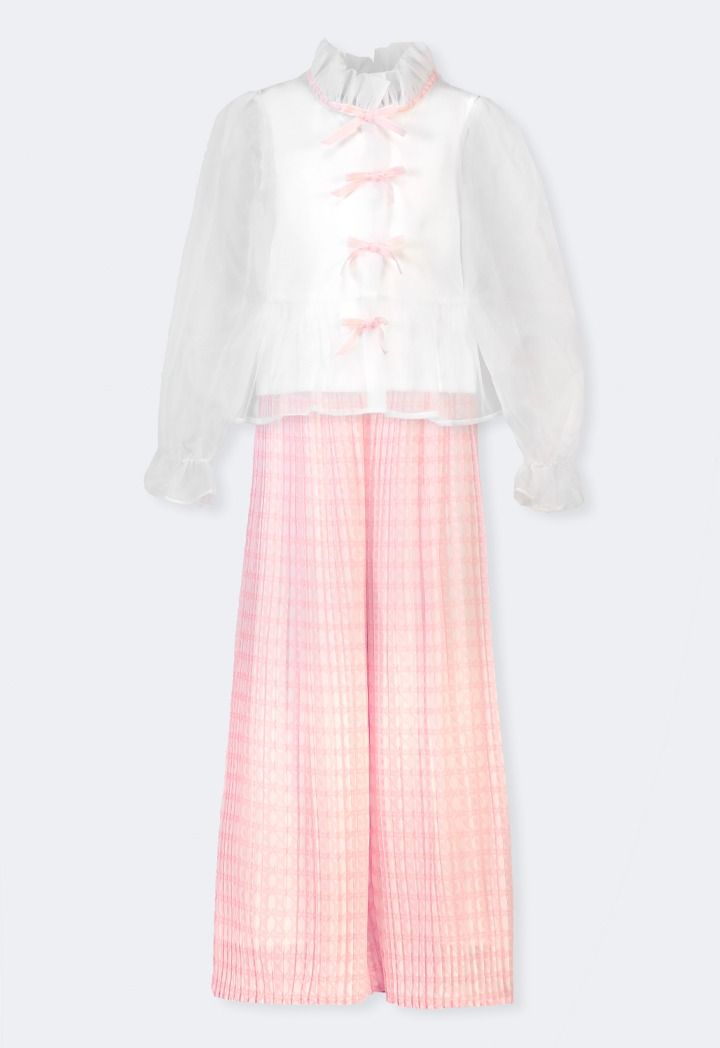 A set that features a ribbon embellished transparent shirt and a printed pleated dress.