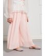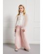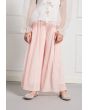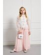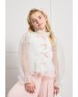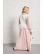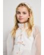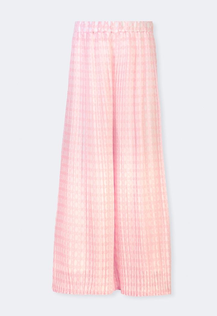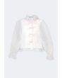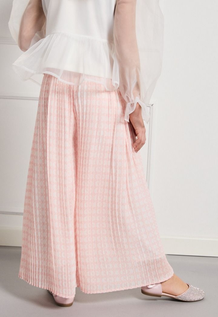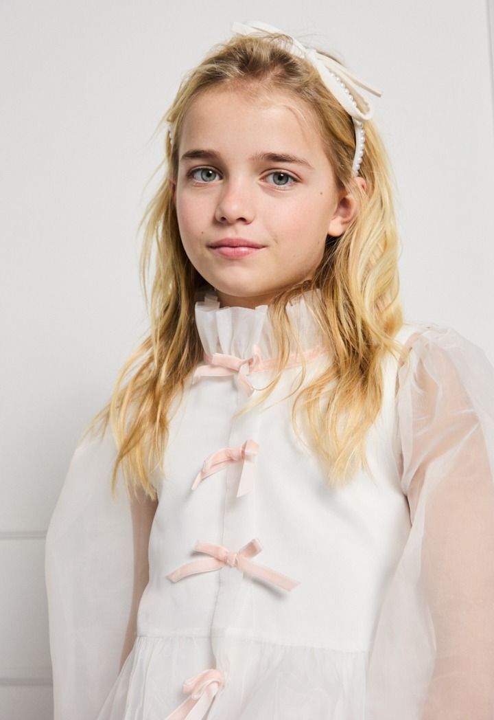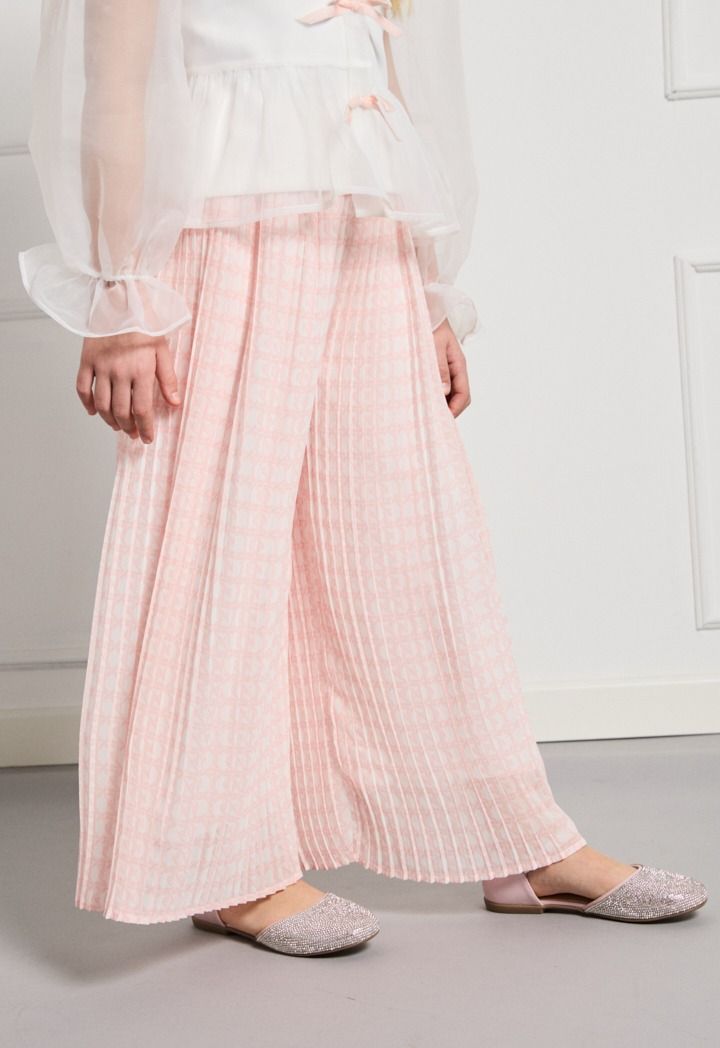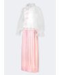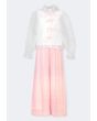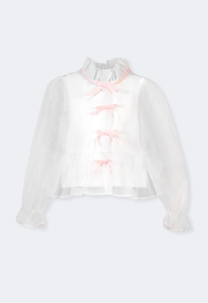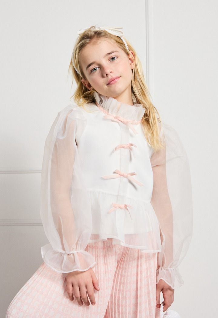 A set that features a ribbon embellished transparent shirt and a printed pleated dress.