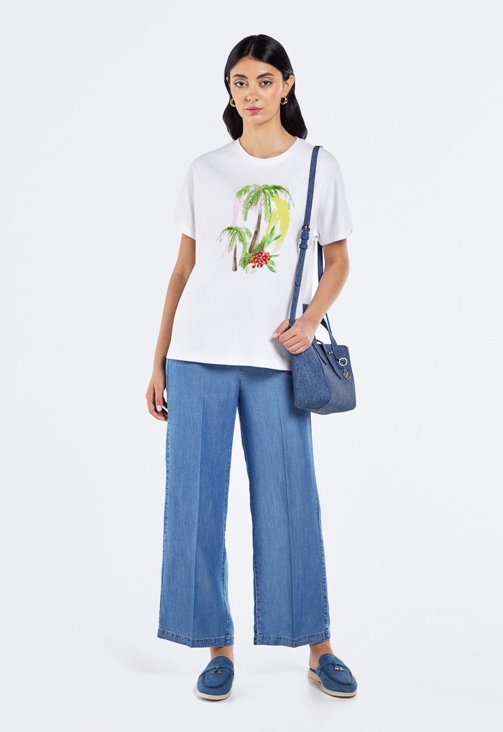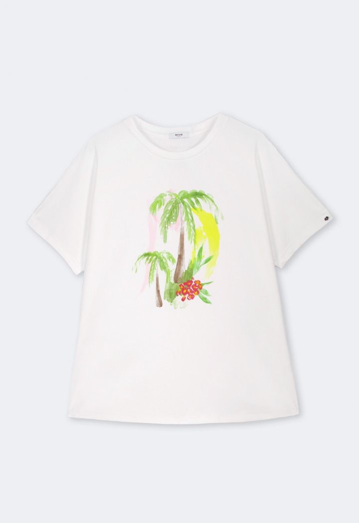This T-shirt is your go-to for laid-back days. It offers a breezy feel on warm days. The tropical print adds a playful touch, ensuring you make a statement with minimal effort.