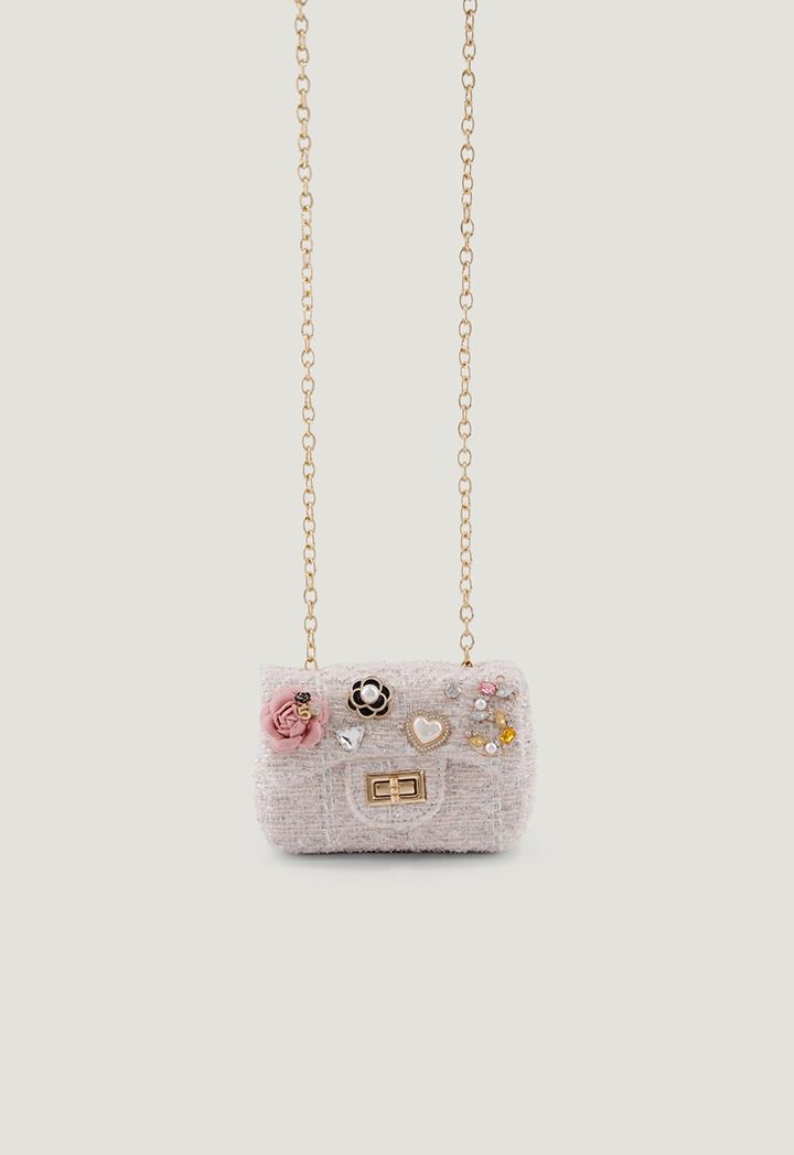 Petite tweed with lurex shimmer, sparkling pearls and gold hardware- a charring mini wonder for your little girl stylish escapades.