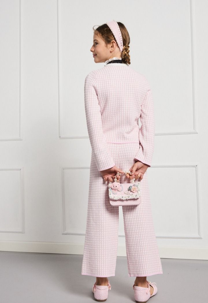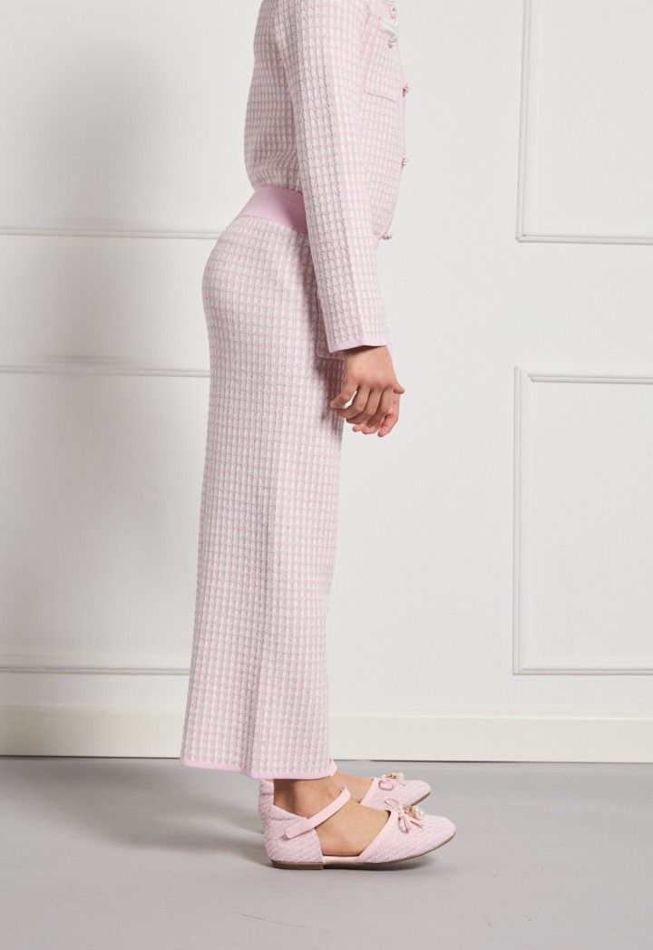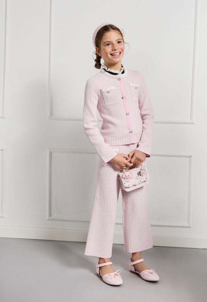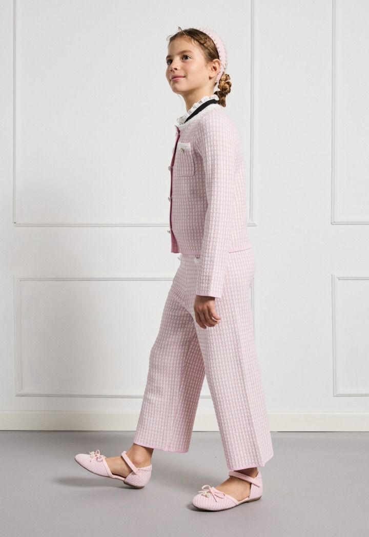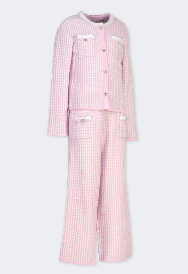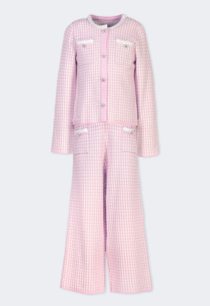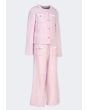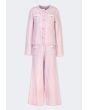 A classic tweed set that features a long sleeved jacket and a pair of pants.