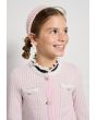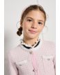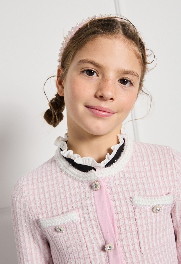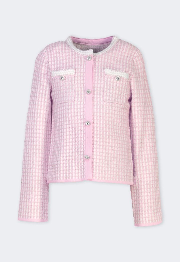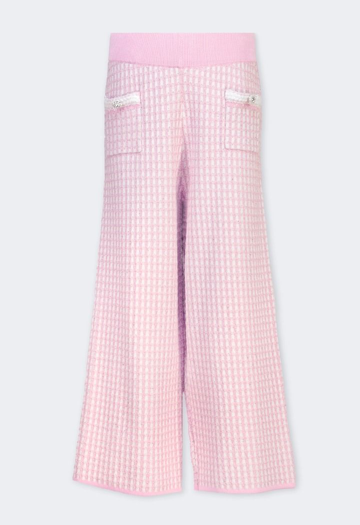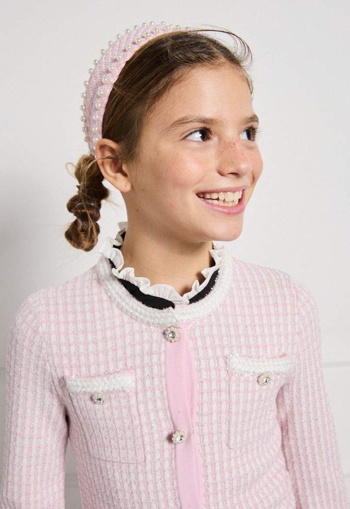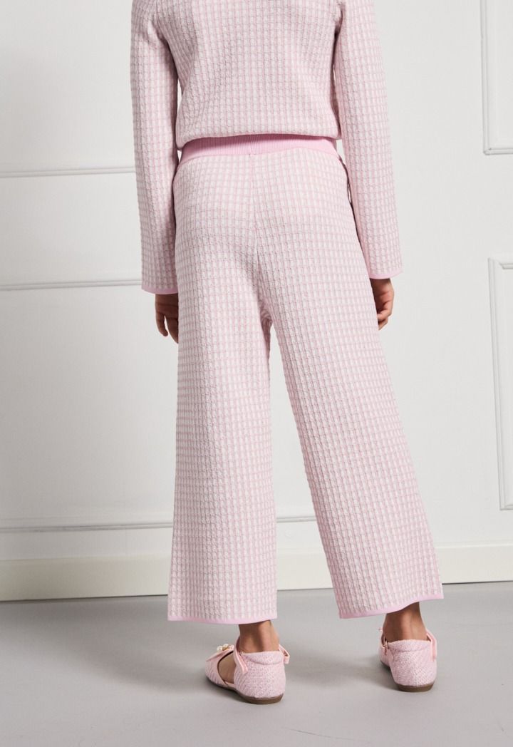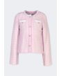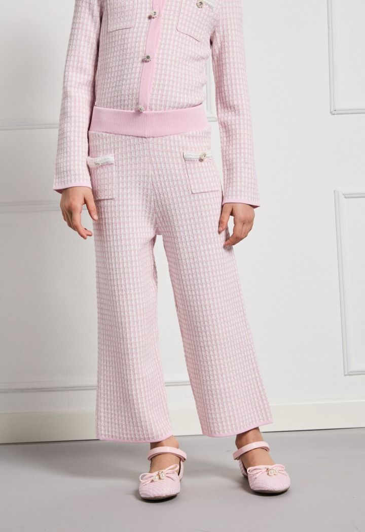 A classic tweed set that features a long sleeved jacket and a pair of pants.
