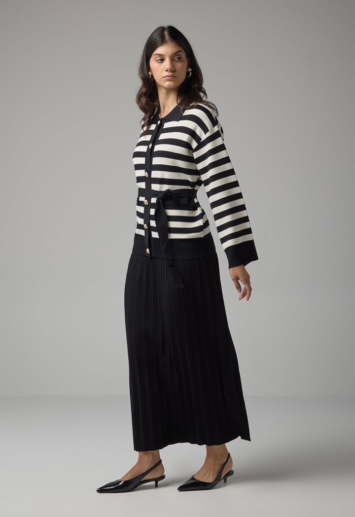 Design: Two-tone, Knitted, Belted, Front Flap Pockets, Ribbed Hem, Striped