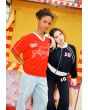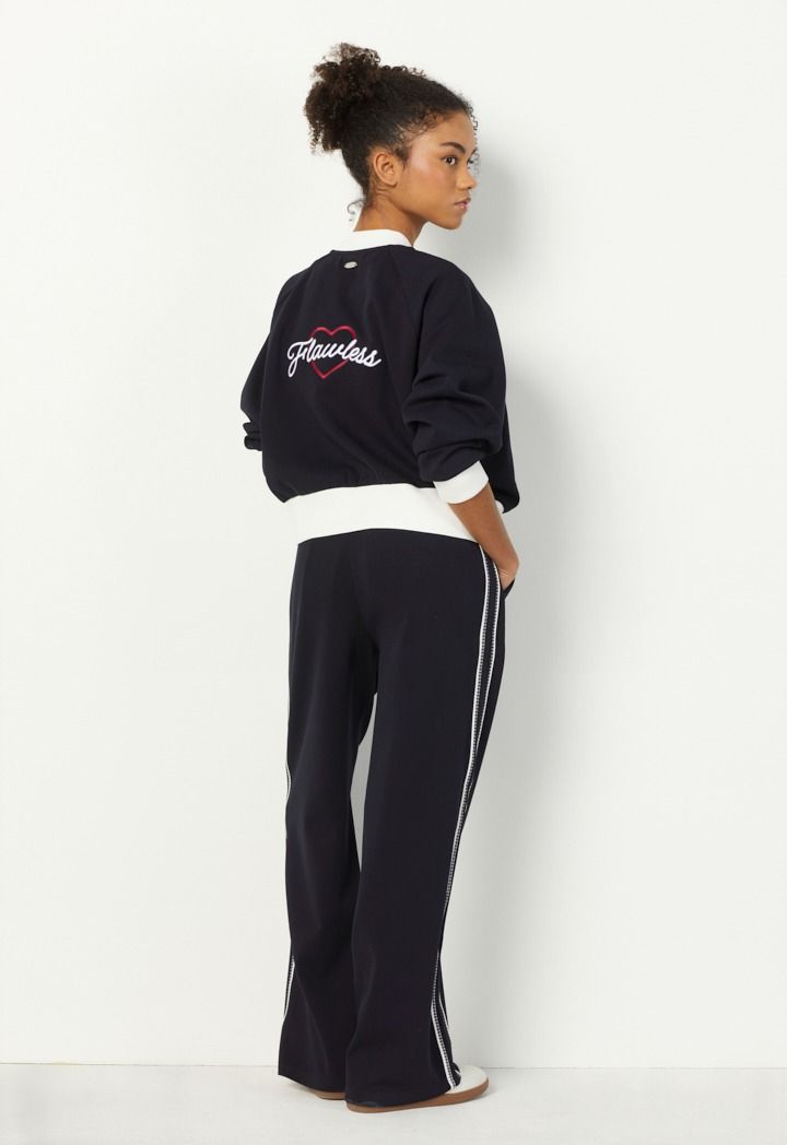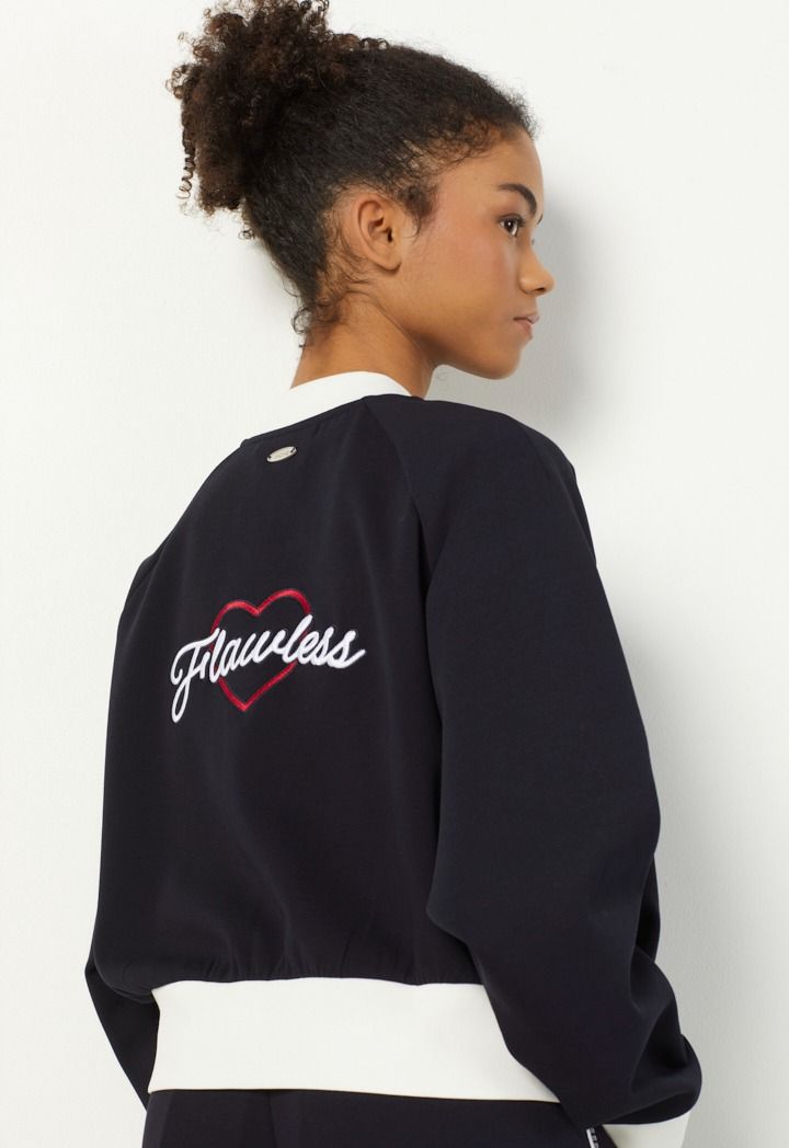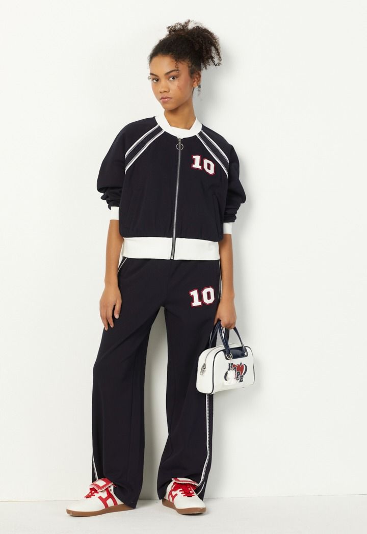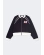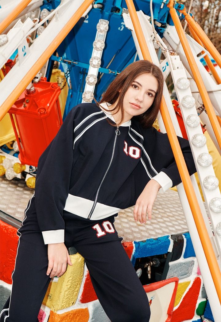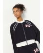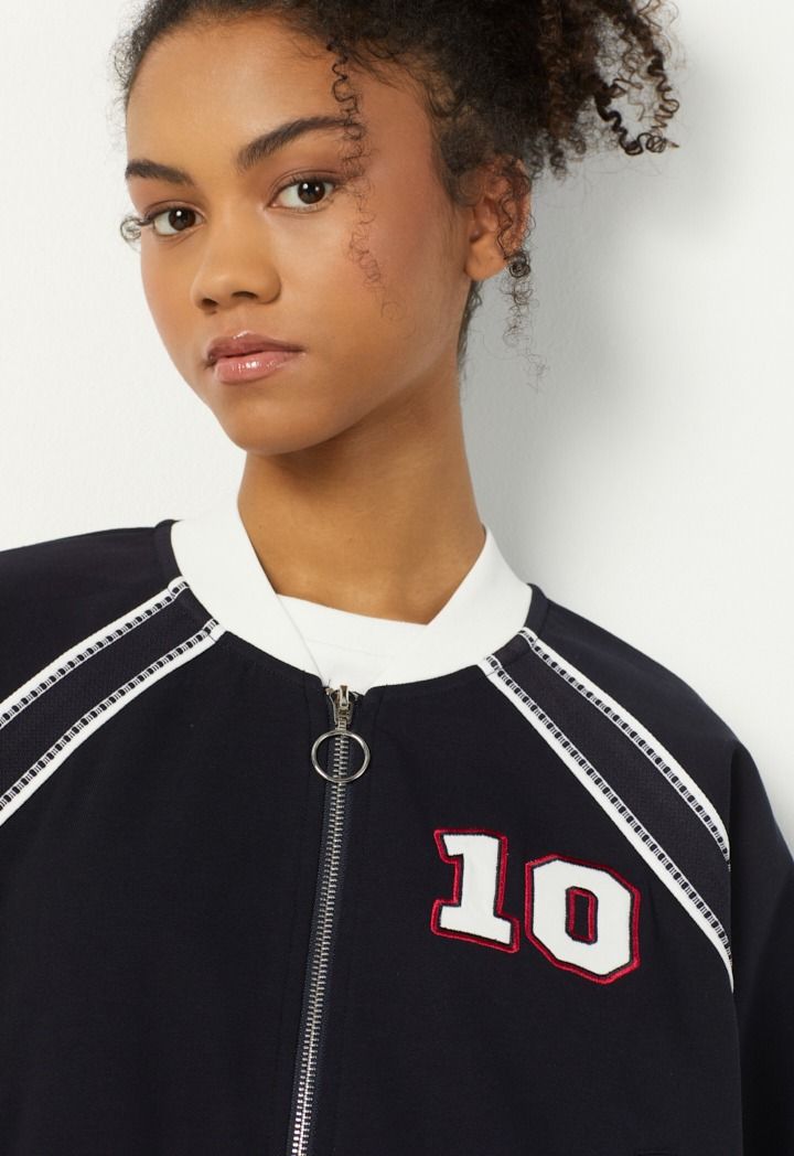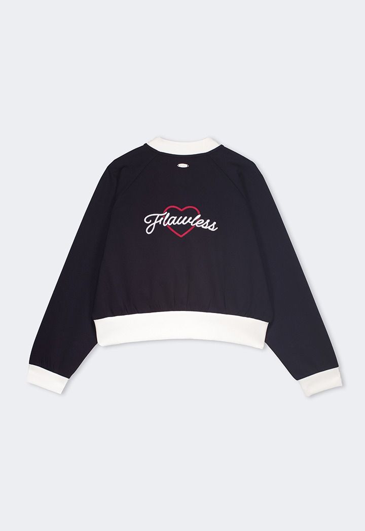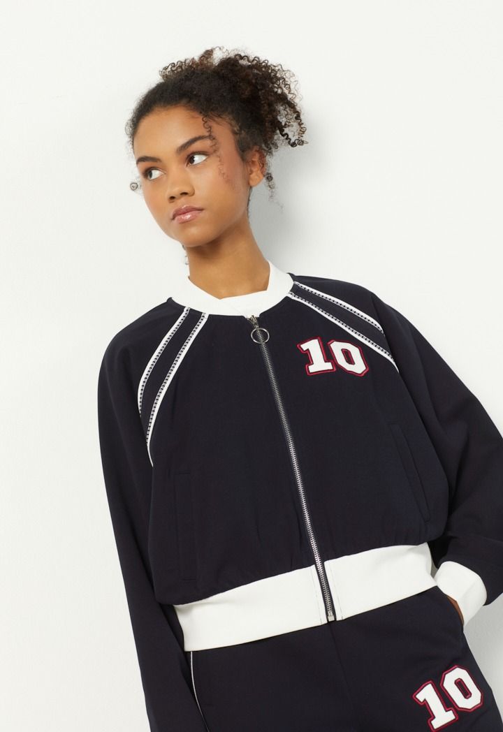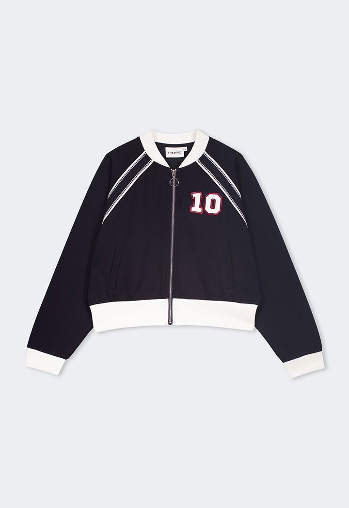 A trendy two-tone jacket featuring a metallic zipper and a Mandarin collar for a sleek and modern look.