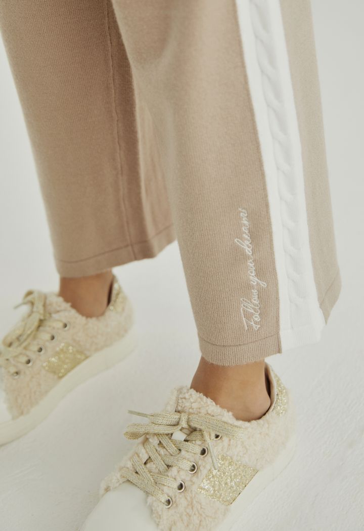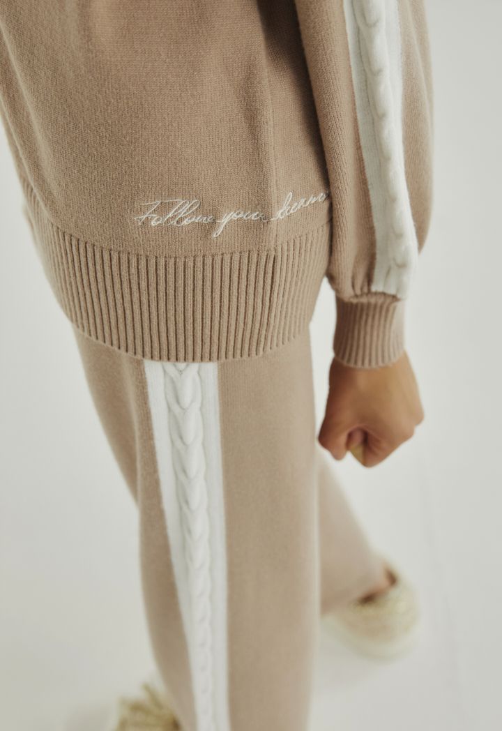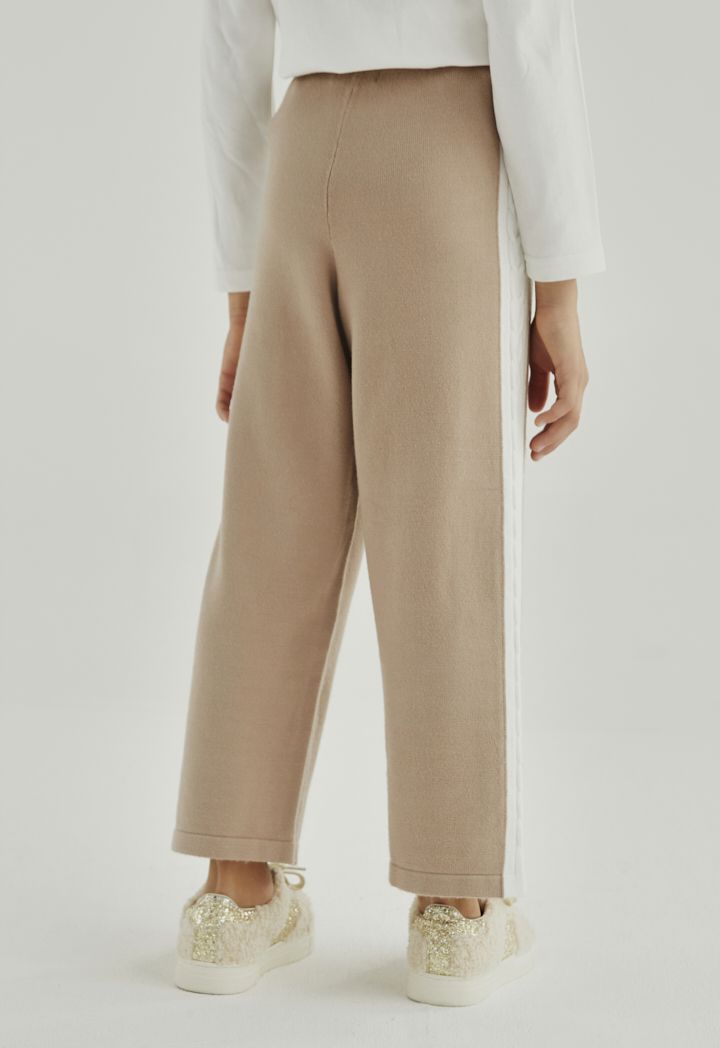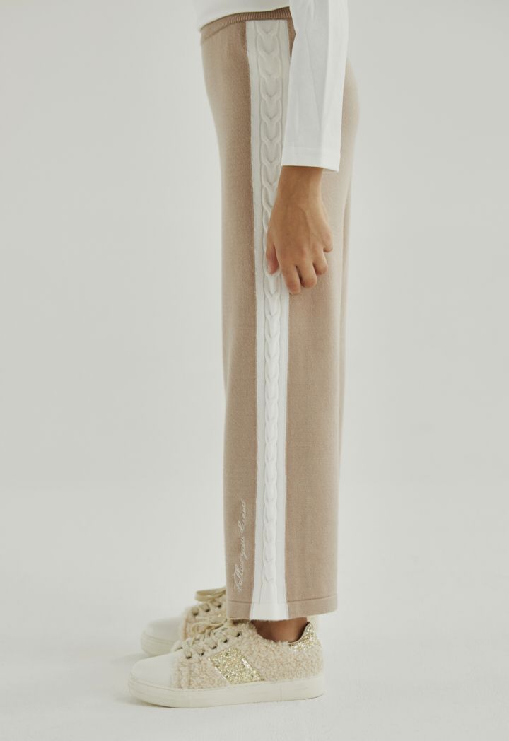 A two toned knitted pair of pants that are best styled with their matching jacket.