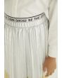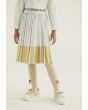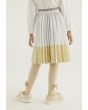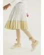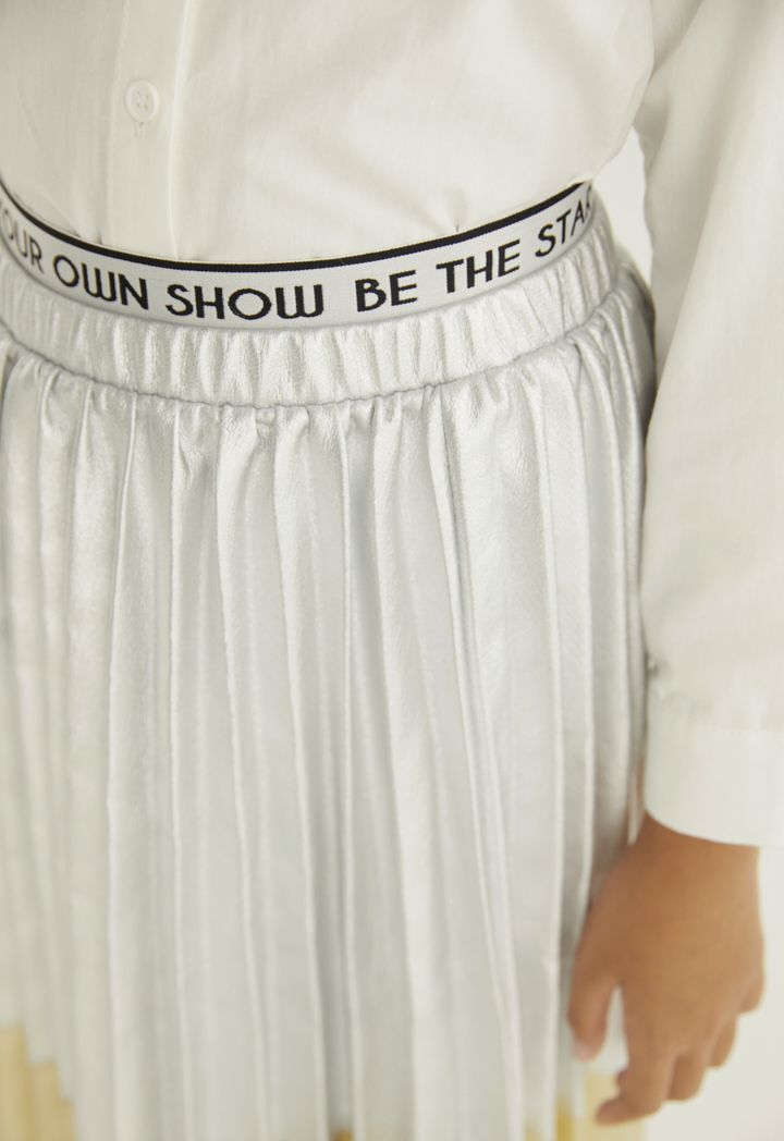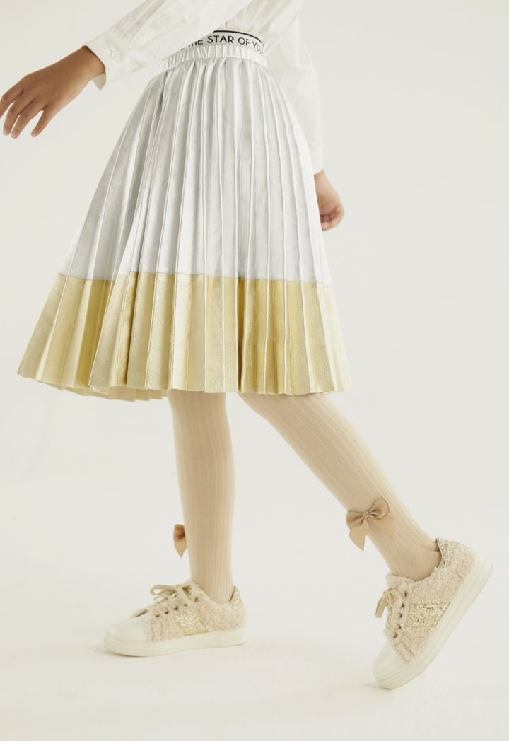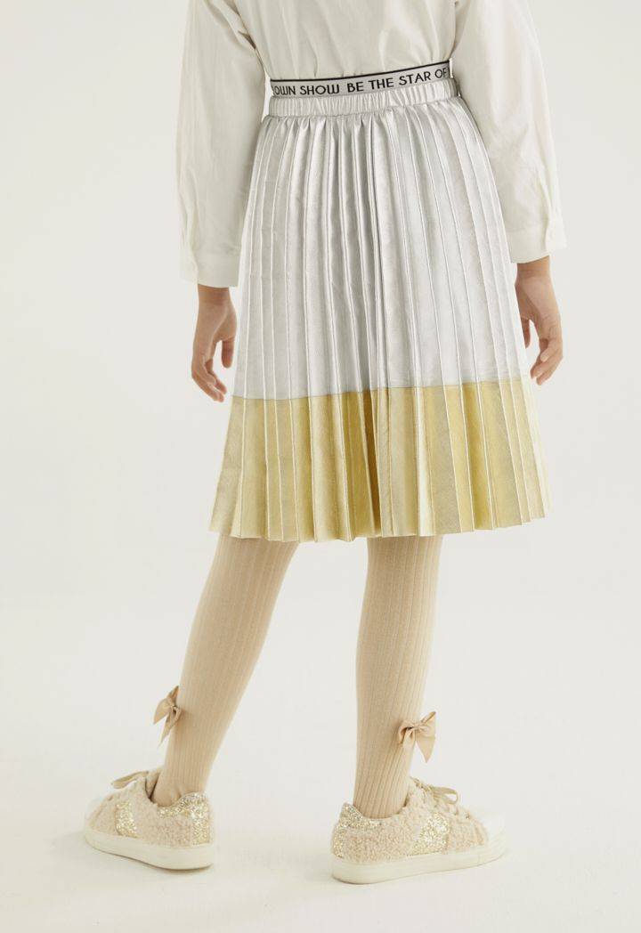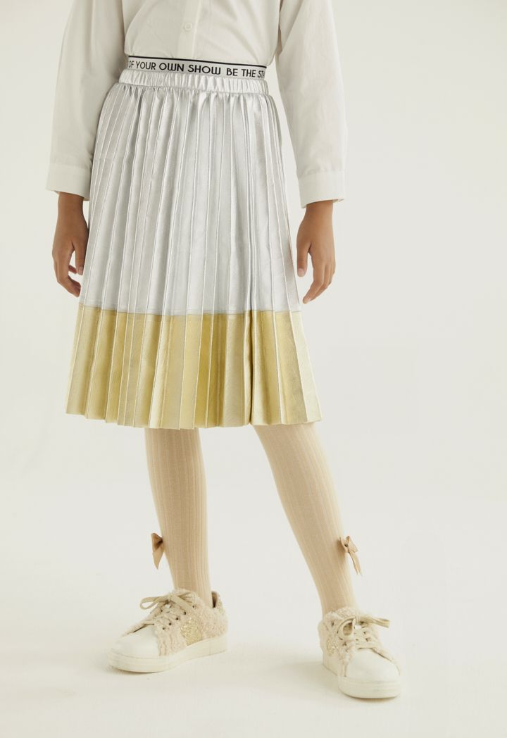 A metallic skirt that features a two toned pleated design that is hard to miss.