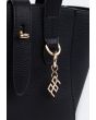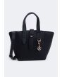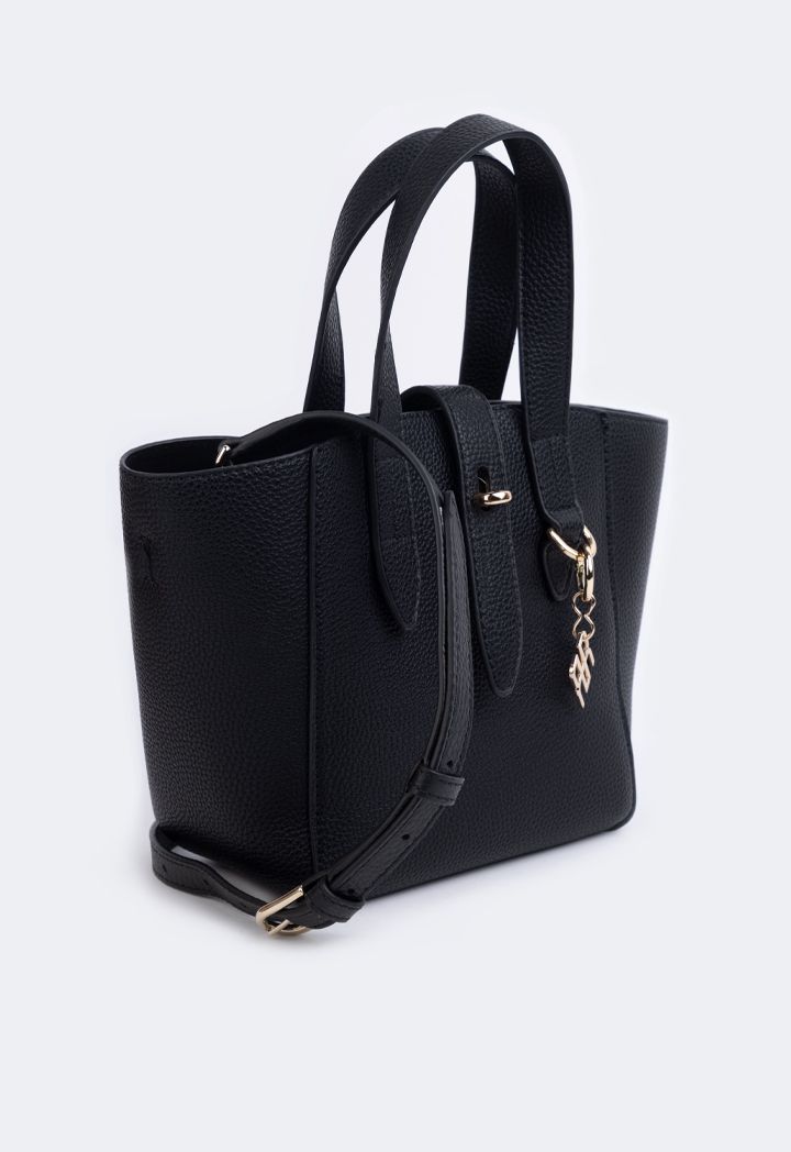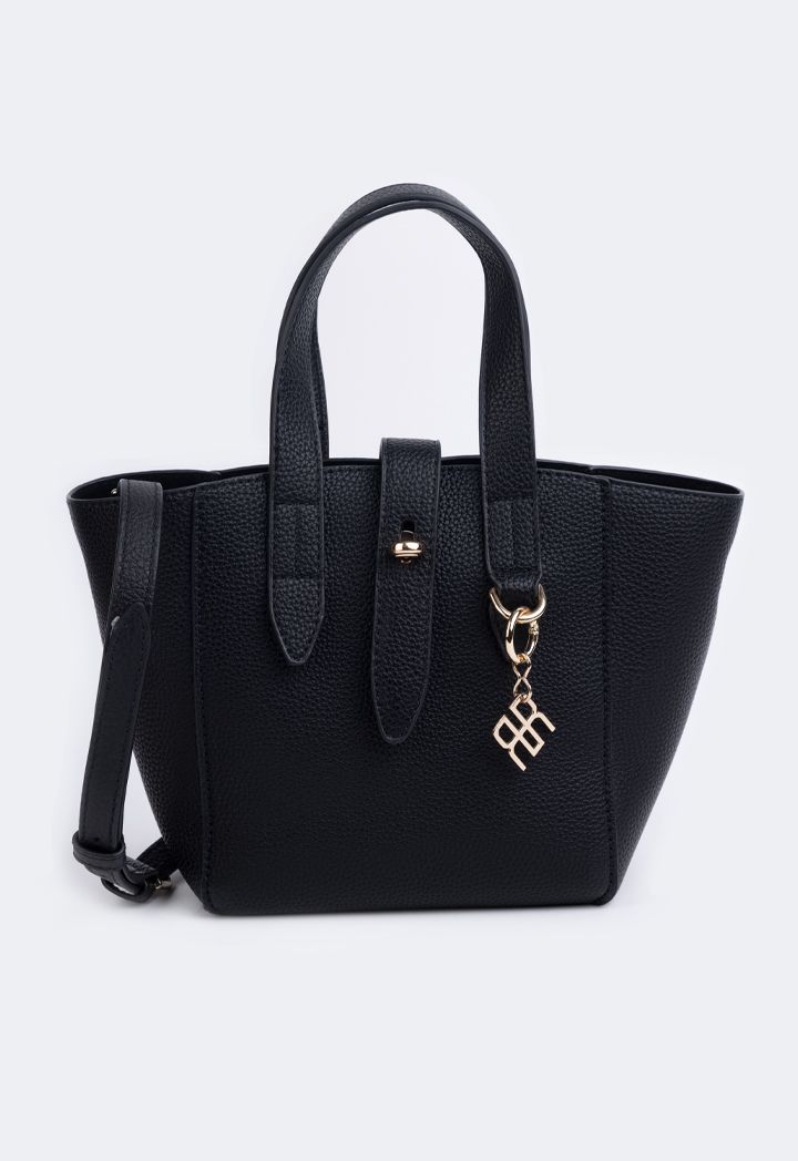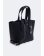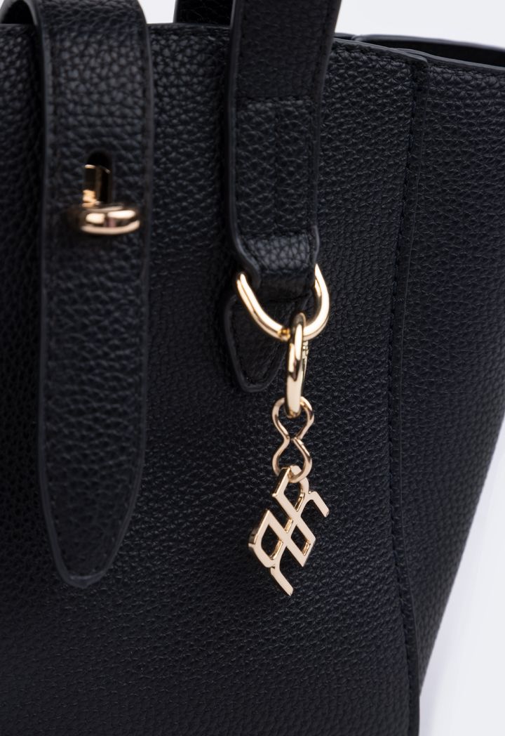 This unique bucket bag features a two toned PU leather design, it includes top handles and at Turn lock.