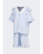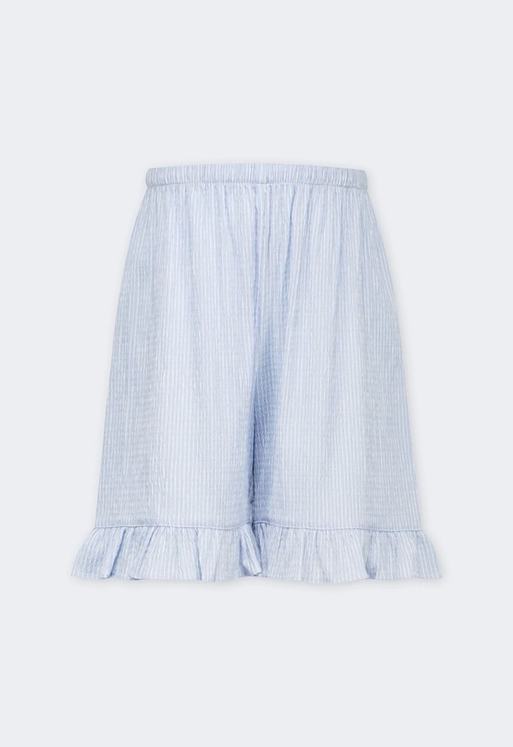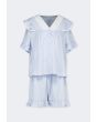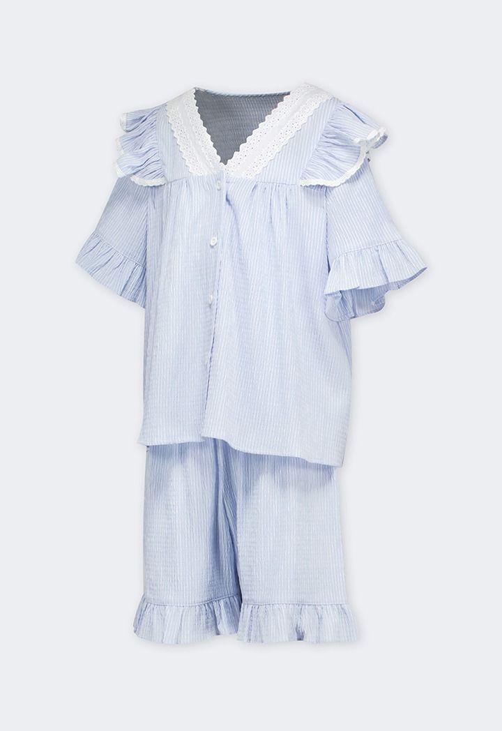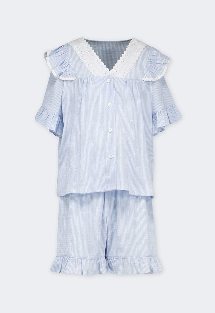 A light pajama set that features a buttoned sleep shirt and a pair of shorts that support a two toned crinkled design.