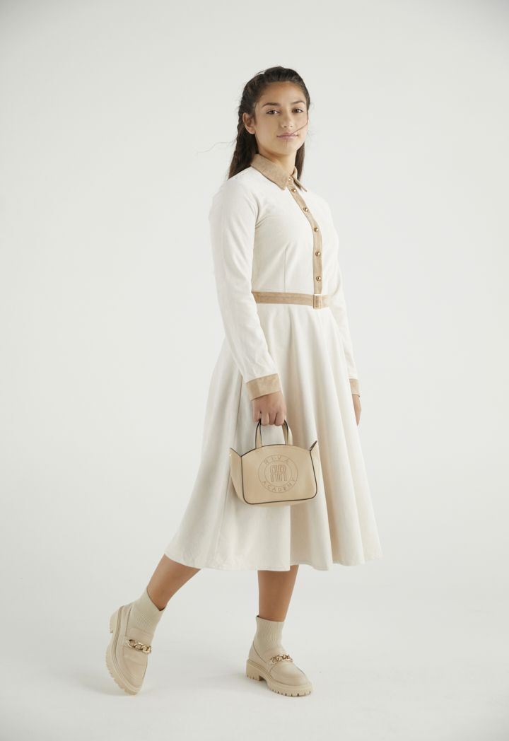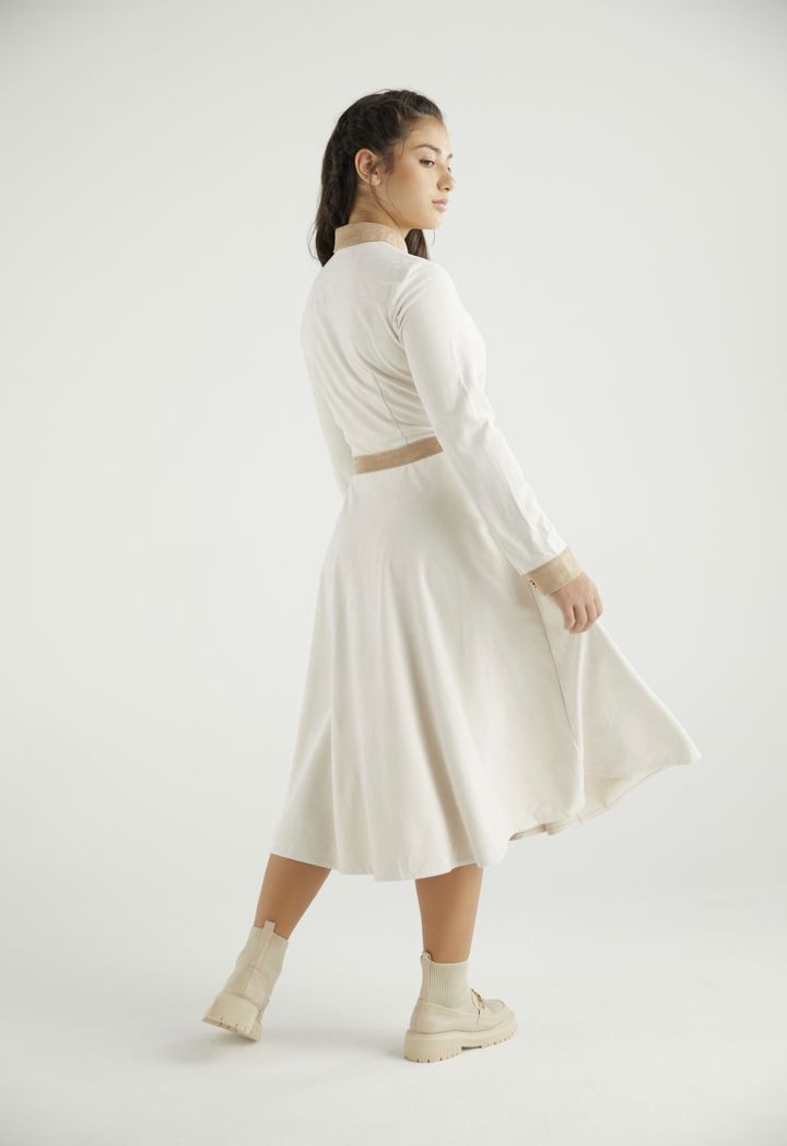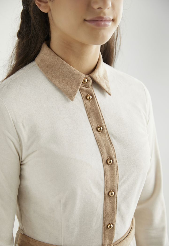 A suede dress that features a unique two toned and long sleeves design.