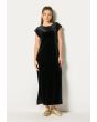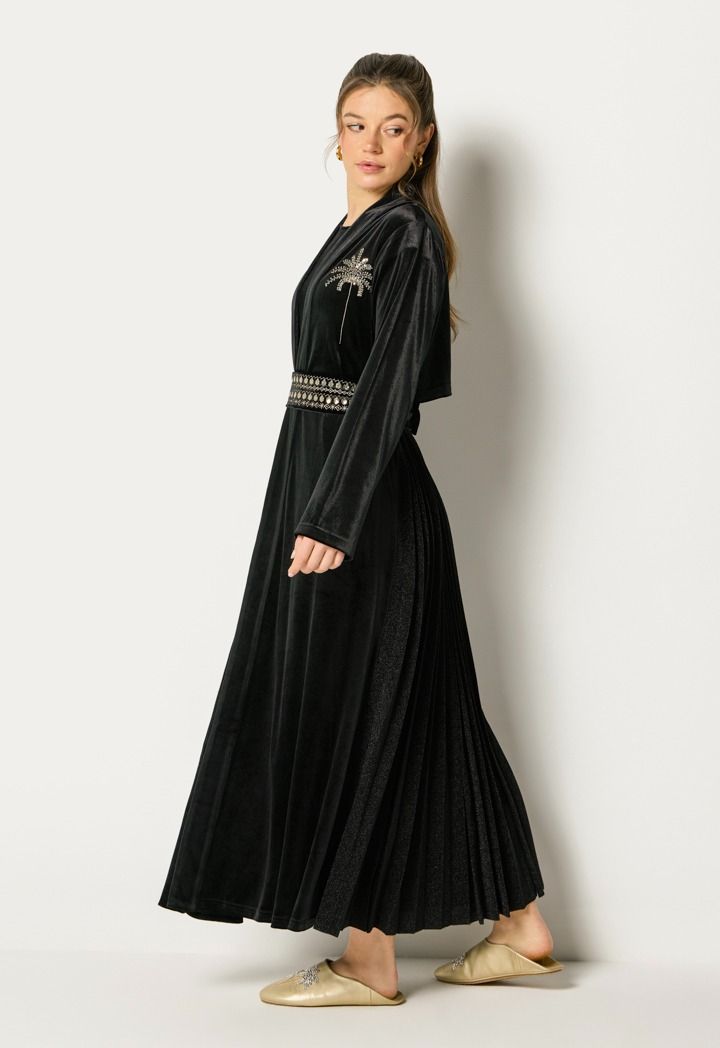 Design : Velvet, Embellished, Sequin, Shimmer Stretch Back Panel, Back Pleats, Waist Belt, Inner Sleeveless Velvet Dress with Side Slits