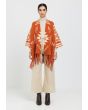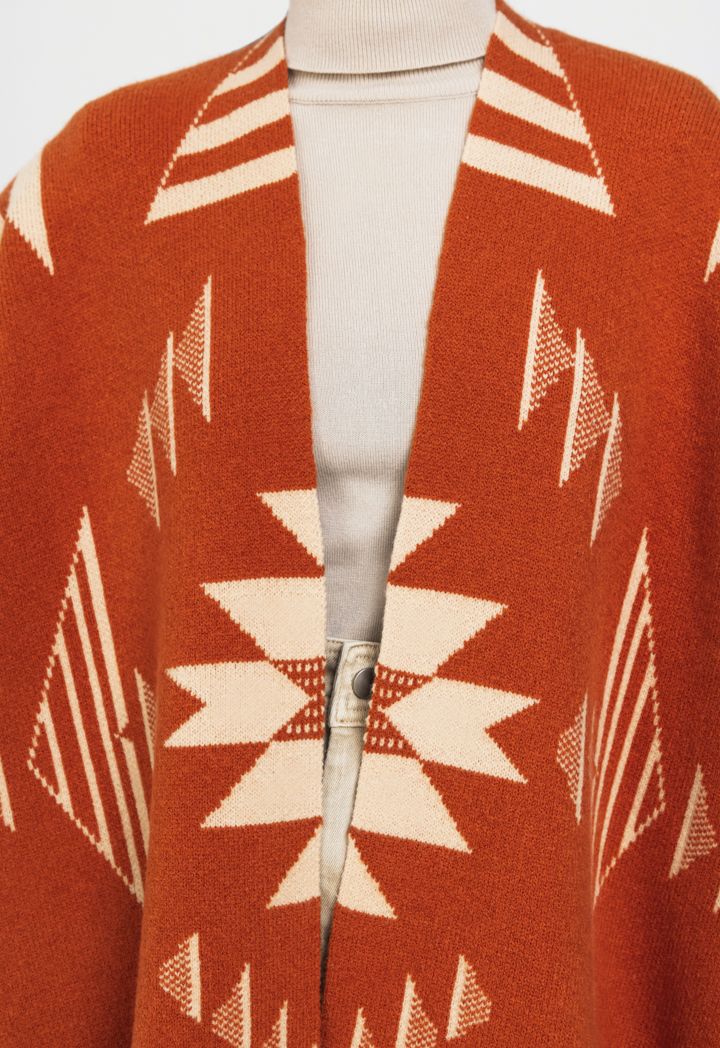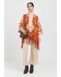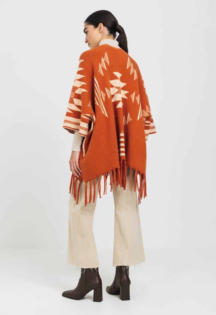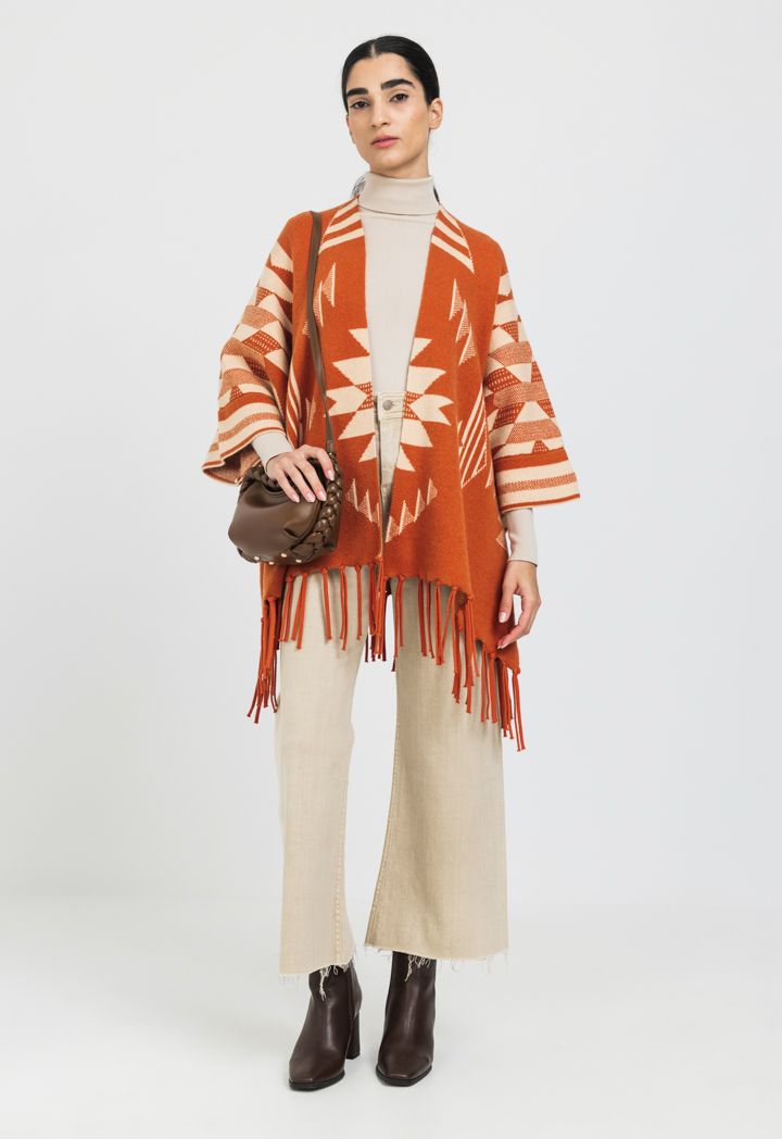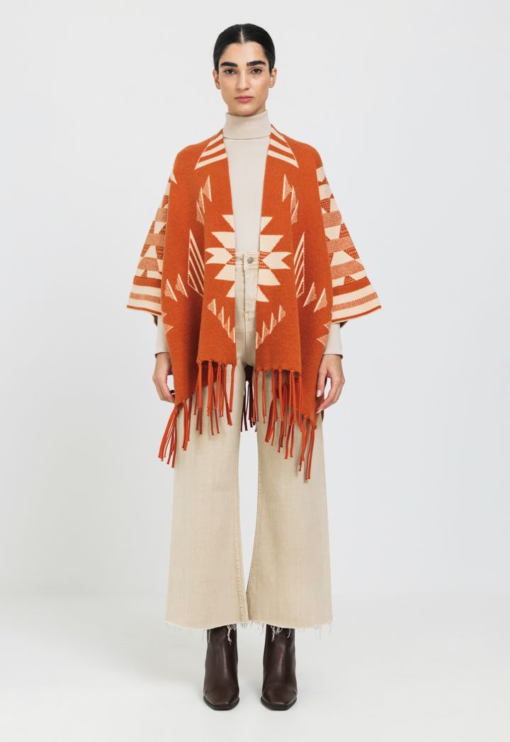 A beautiful woven winter poncho that is distinguished with its vibrant color and alluring fringes.