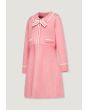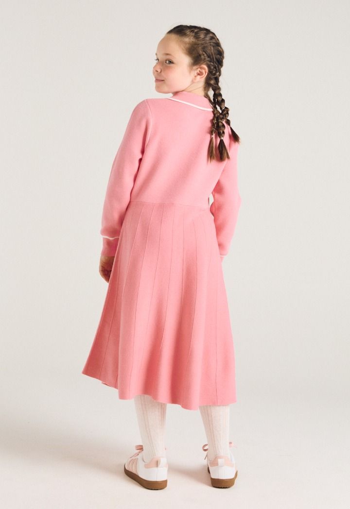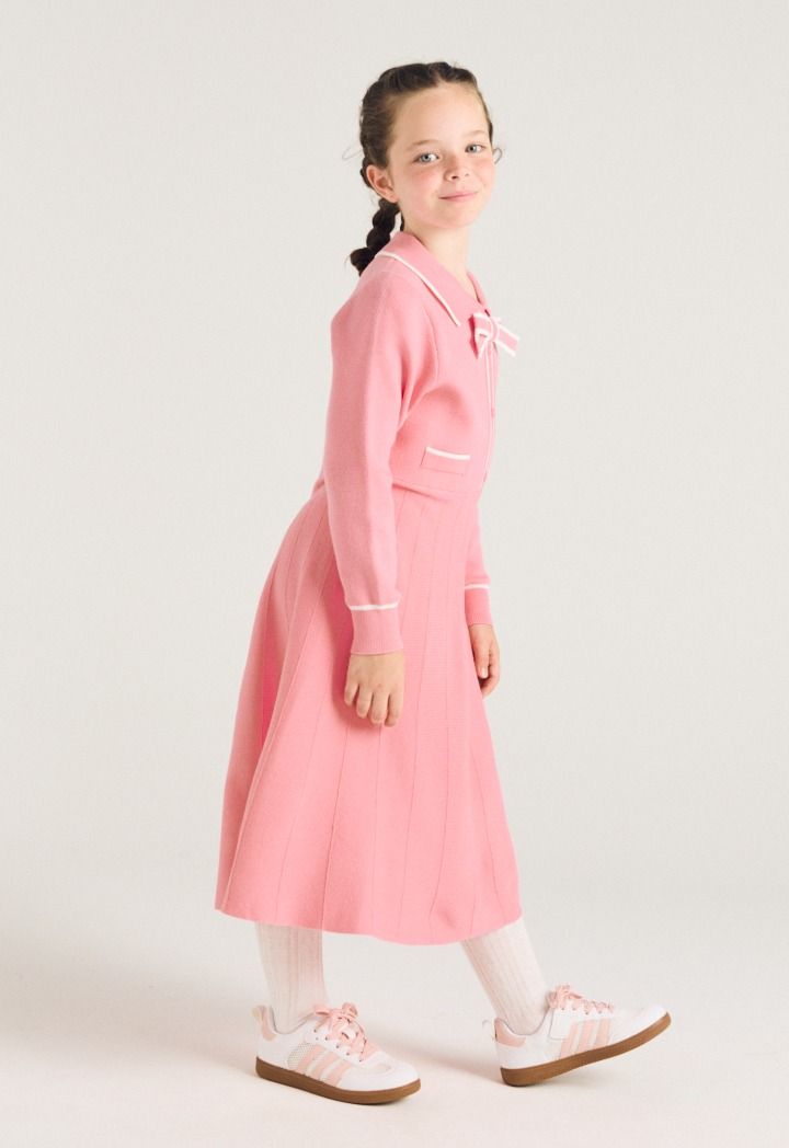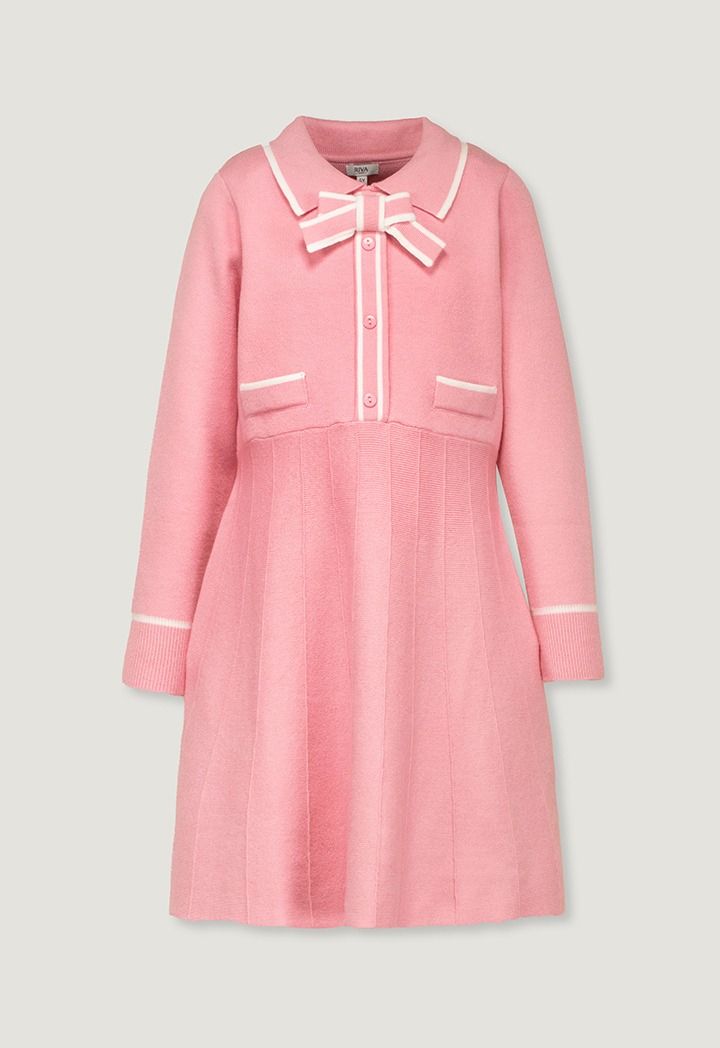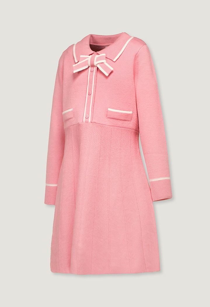 A vibrant dress that features a contrast knitted design with a neck bow.