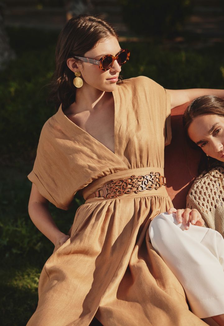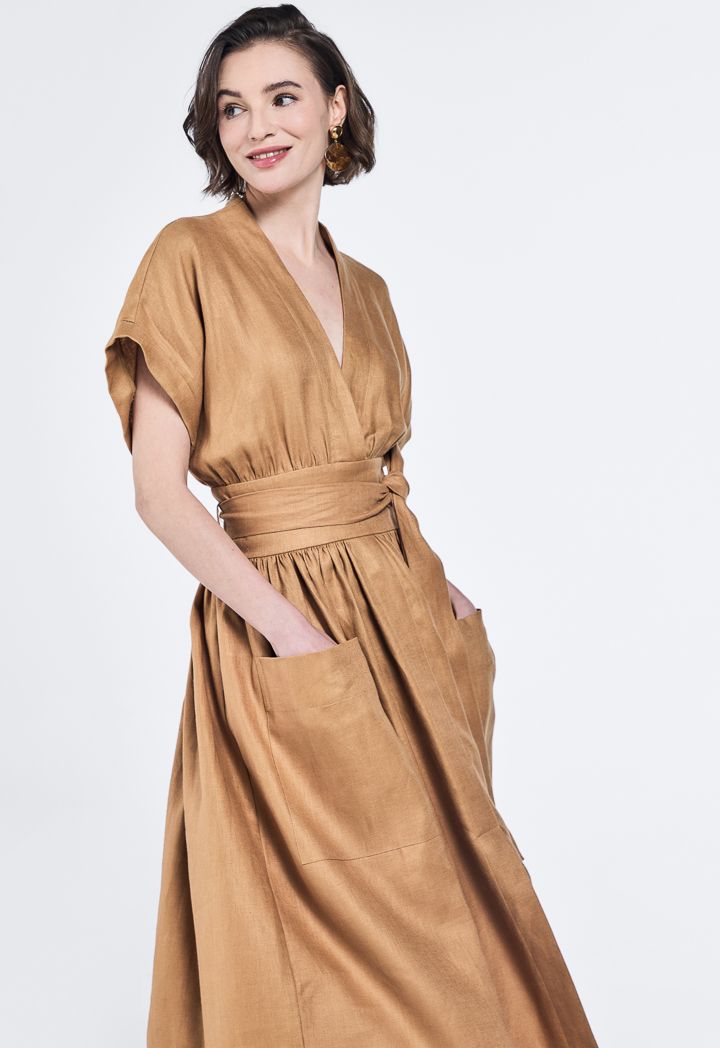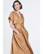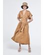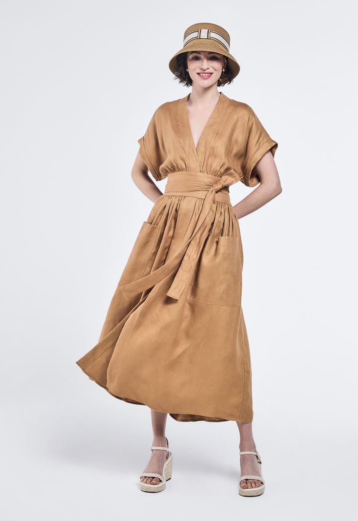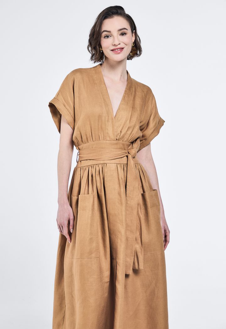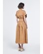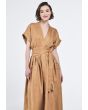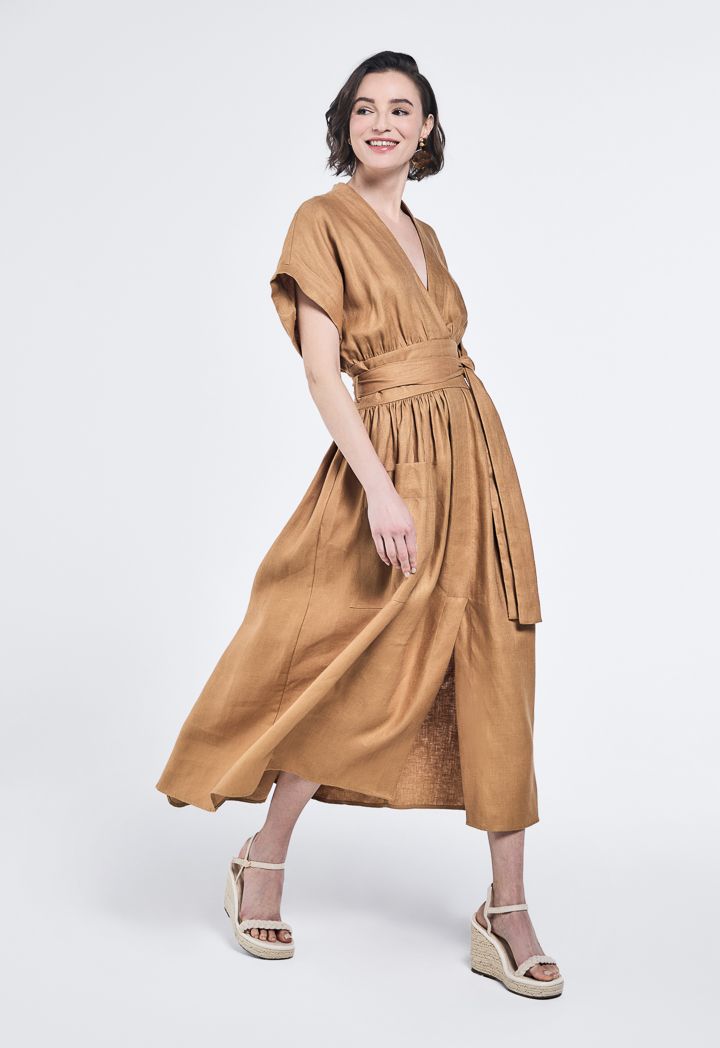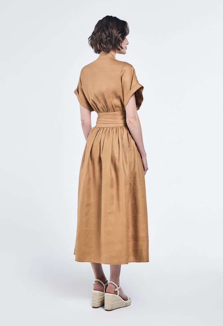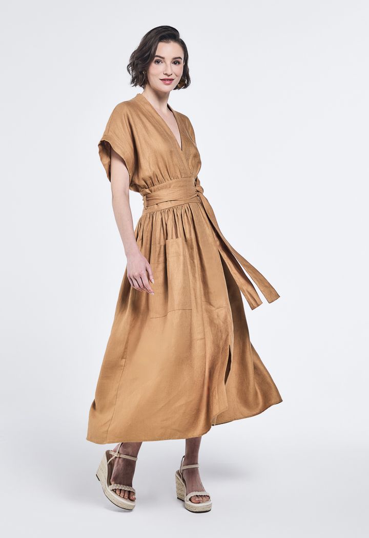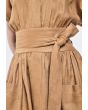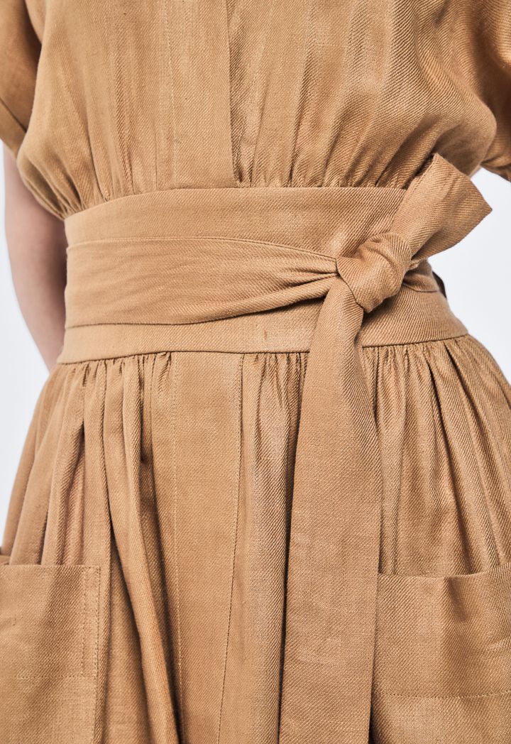 Design: Wide Gathered Waist, Belted, Flared, Patch Pockets, Front Slit