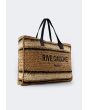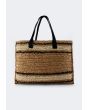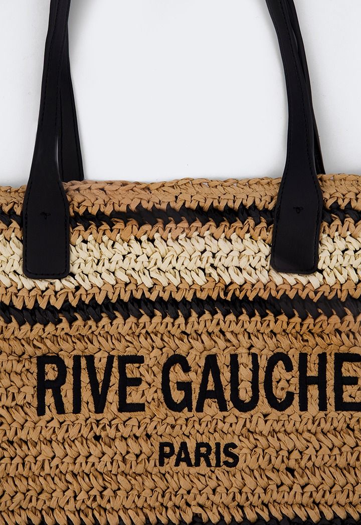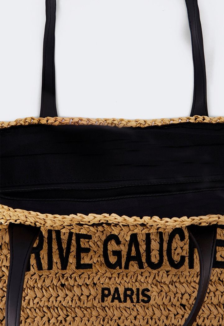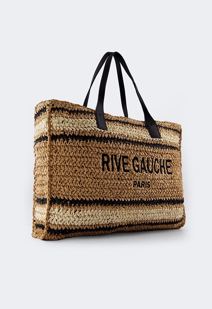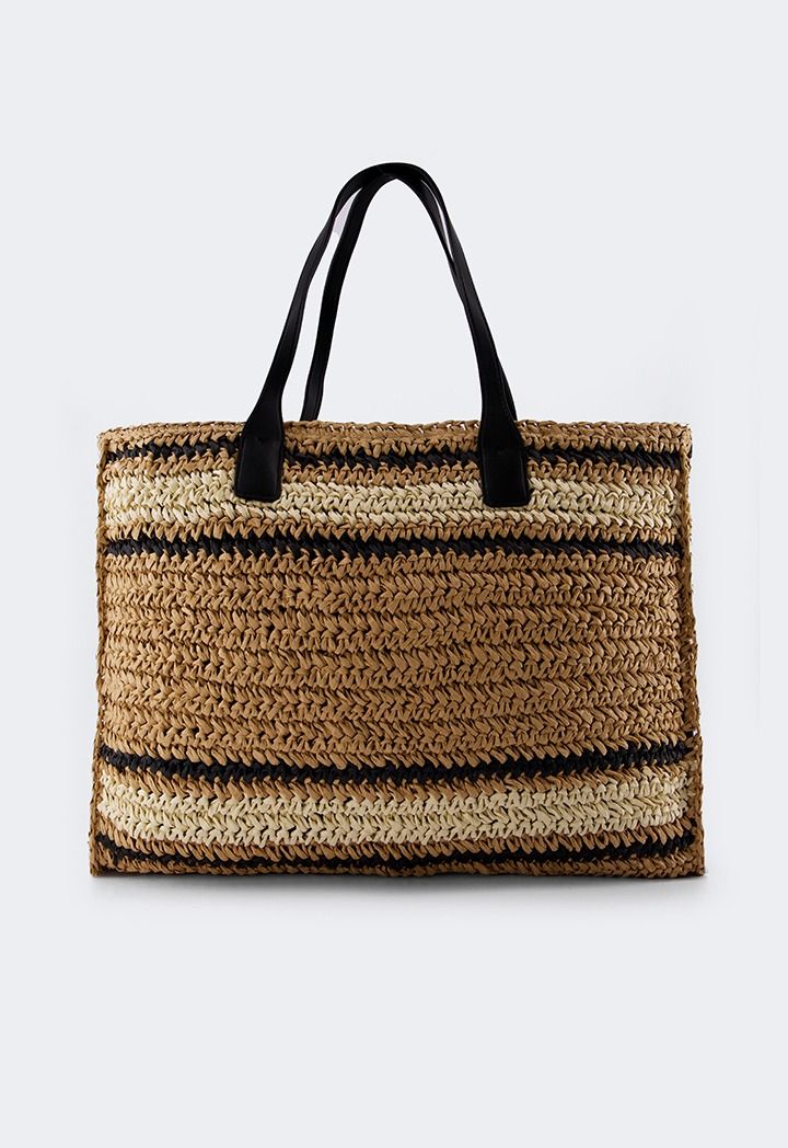 A woven paper tote bag featuring double shoulder straps, it has a spacious interior which is perfect for long days at the beach.